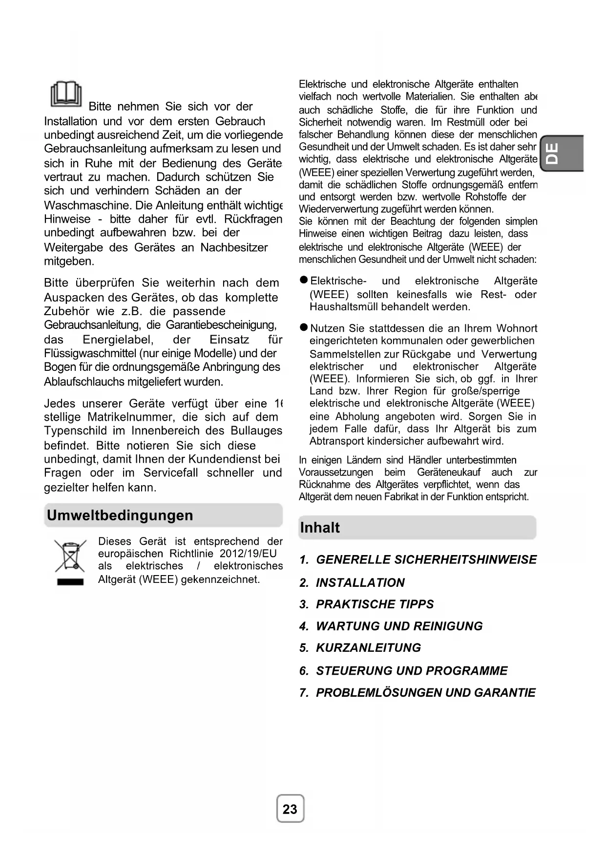 Bitte nehmen Sie sich vor der Installation und vor dem ersten Gebrauch unbedingt ausreichend Zeit, um die vorliegende Gebrauchsanleitung aufmerksam zu lesen und sich in Ruhe mit der Bedienung des Gerätes vertraut zu machen. Dadurch schützen Sie sich und verhindern Schäden an der Waschmaschine. Die Anleitung enthält wichtige Hinweise - bitte daher für evtl. Rückfragen unbedingt aufbewahren bzw. bei der Weitergabe des Gerätes an Nachbesitzer mitgeben. Bitte überprüfen Sie weiterhin nach dem Auspacken des Gerätes, ob das komplette Zubehör wie z.B. die passende Gebrauchsanleitung, die Garantiebescheinigung, das Energielabel, der Einsatz für Flüssigwaschmittel (nur einige Modelle) und der Bogen für die ordnungsgemäße Anbringung des Ablaufschlauchs mitgeliefert wurden. Jedes unserer Geräte verfügt über eine 16- stellige Matrikelnummer, die sich auf dem Typenschild im Innenbereich des Bullauges befindet. Bitte notieren Sie sich diese unbedingt, damit Ihnen der Kundendienst bei Fragen oder im Servicefall schneller und gezielter helfen kann.
