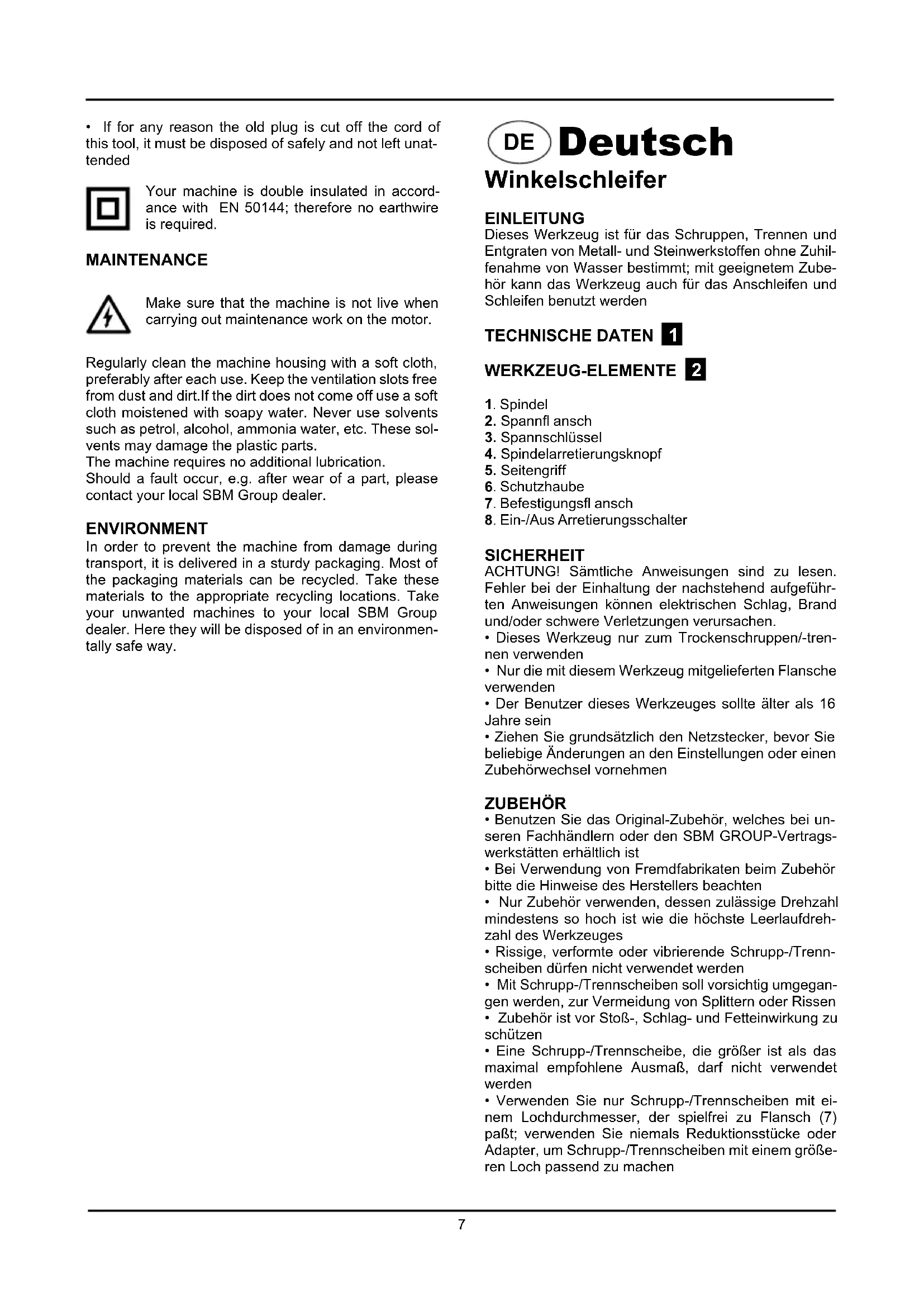 - If for any reason the old plug is cut off the cord of this tool, it must be disposed of safely and not left unat-tended Your machine is double insulated in accord-ance with EN 50144; therefore no earthwire is required. MAINTENANCE Make sure that the machine is not live when carrying out maintenance work on the motor. Regularly clean the machine housing with a soft cloth, preferably after each use. Keep the ventilation slots free from dust and dirt.If the dirt does not come off use a soft cloth moistened with soapy water. Never use solvents such as petrol, alcohol, ammonia water, etc. These sol-vents may damage the plastic parts.The machine requires no additional lubrication.Should a fault occur, e.g. after wear of a part, please contact your local SBM Group dealer. ENVIRONMENT In order to prevent the machine from damage during transport, it is delivered in a sturdy packaging. Most of the packaging materials can be recycled. Take these materials to the appropriate recycling locations. Take your unwanted machines to your local SBM Group dealer. Here they will be disposed of in an environmen-tally safe way. Winkelschleifer EINLEITUNG Dieses Werkzeug ist für das Schruppen, Trennen und Entgraten von Metall- und Steinwerkstoffen ohne Zuhil-fenahme von Wasser bestimmt; mit geeignetem Zube-hör kann das Werkzeug auch für das Anschleifen und Schleifen benutzt werden TECHNISCHE DATEN 1 WERKZEUG-ELEMENTE 2