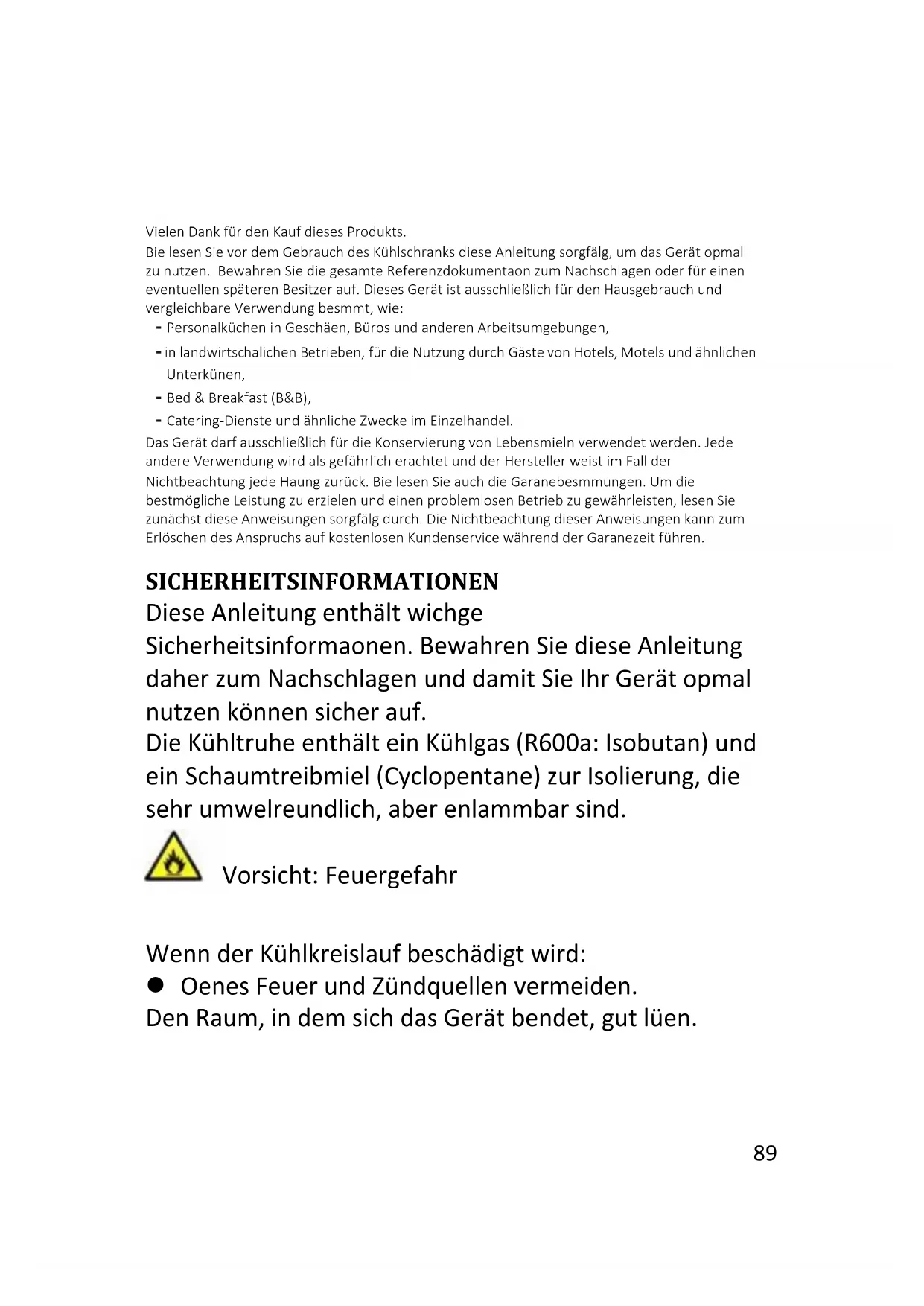 Vielen Dank für den Kauf dieses Produkts. Bitte lesen Sie vor dem Gebrauch des Kühlschranks diese Anleitung sorgfältig, um das Gerät optimal zu nutzen. Bewahren Sie die gesamte Referenzdokumentation zum Nachschlagen oder für einen eventuellen späteren Besitzer auf. Dieses Gerät ist ausschließlich für den Hausgebrauch und vergleichbare Verwendung bestimmt, wie: - Personalküchen in Geschäften, Büros und anderen Arbeitsumgebungen, - in landwirtschaftlichen Betrieben, für die Nutzung durch Gäste von Hotels, Motels und ähnlichen Unterkünften, - Bed & Breakfast (B&B), - Catering-Dienste und ähnliche Zwecke im Einzelhandel. Das Gerät darf ausschließlich für die Konservierung von Lebensmitteln verwendet werden. Jede andere Verwendung wird als gefährlich erachtet und der Hersteller weist im Fall der Nichtbeachtung jede Haftung zurück. Bitte lesen Sie auch die Garantiebestimmungen. Um die bestmögliche Leistung zu erzielen und einen problemlosen Betrieb zu gewährleisten, lesen Sie zunächst diese Anweisungen sorgfältig durch. Die Nichtbeachtung dieser Anweisungen kann zum Erlöschen des Anspruchs auf kostenlosen Kundenservice während der Garantiezeit führen. SICHERHEITSINFORMATIONEN Diese Anleitung enthält wichtige Sicherheitsinformationen. Bewahren Sie diese Anleitung daher zum Nachschlagen und damit Sie Ihr Gerät optimal nutzen können sicher auf. Die Kühltruhe enthält ein Kühlgas (R600a: Isobutan) und ein Schaumtreibmittel (Cyclopentane) zur Isolierung, die sehr umweltfreundlich, aber entflammbar sind. Vorsicht: Feuergefahr Wenn der Kühlkreislauf beschädigt wird: Offenes Feuer und Zündquellen vermeiden. Den Raum, in dem sich das Gerät befindet, gut lüften. Anteil Laufzeiten:18℃:90 WARNUNG! Vorsicht beim Reinigen/Tragen des Geräts, sodass das Metall der Kühlschlaufen nicht berührt wird, da dies Finger und Hände verletzen oder das Gerät beschädigen könnte. Dieses Gerät ist nicht geeignet, um darauf oder darunter weitere Geräte zu stapeln. Nicht auf dem Gerät sitzen oder stehen, da es dafür nicht geeignet ist. Dies könnte zu Personenschäden führen oder das Gerät beschädigen. Darauf achten, dass das Stromkabel während und nach dem Tragen/Verschieben des Geräts nicht darunter stecken bleibt, damit es nicht beschädigt oder zerschnitten wird. Beim Aufstellen des Geräts darauf achten, dass der Fußboden, Leitungen, Wandverkleidungen usw. nicht beschädigt werden. Gerät nicht verschieben, indem an der Klappe oder am Griff gezogen wird. Erlauben Sie Kindern nicht mit dem Gerät zu spielen oder an den Bedienknöpfen herumzuspielen. Unser Unternehmen übernimmt keine Haftung, falls diese Anweisungen nicht befolgt werden. Das Gerät nicht in Umgebungen mit feuchter, öliger oder staubiger Atmosphäre installieren sowie vor direkter Sonneneinstrahlung und Wasser schützen. Das Gerät nicht in der Nähe von Hitzequellen oder91 entflammbaren Materialien installieren. Bei einem Stromausfall nicht die Klappe öffnen. Dauert der Stromausfall weniger als 20 Stunden an, wird die Tiefkühlware nicht beeinträchtigt. Dauert der Stromausfall länger, sollten die Lebensmittel überprüft und sofort verzehrt oder gekocht und erneut eingefroren werden. Lässt sich die Klappe der Kühltruhe schwierig öffnen, nachdem Sie diese gerade geschlossen haben, so ist dies normal. Dies liegt am Druckausgleich, der hergestellt wird. Die Klappe lässt sich normalerweise nach wenigen Minuten wieder öffnen. Das Gerät erst dann an die Stromversorgung anschließen, wenn sämtliches Verpackungsmaterial und Transportschutzvorrichtungen entfernt wurden. Das Gerät vor dem Einschalten mindestens vier Stunden lang stehen lassen, wenn es im Liegen transportiert wurde, damit sich das Kompressoröl absetzen kann. Diese Kühltruhe darf nur für den vorgesehenen Zweck (z.B. Lagern und Einfrieren von Lebensmitteln) verwendet werden. Keine Medikamente oder Materialien für wissenschaftliche Forschungen aufbewahren. Wird Material gelagert, das eine strenge Kontrolle der Lagertemperatur erfordert, so kann sich die92 Qualität verschlechtern oder es kann eine unvorhergesehene Reaktion auftreten, die zu Risiken führen kann. Vor jedem Eingriff am Gerät den Netzstecker ziehen. Bei der Lieferung überprüfen, ob das Produkt nicht beschädigt ist und ob alle Teile und Zubehör unversehrt sind. Wenn Sie am Kühlsystem ein Leck feststellen, nicht die Netzsteckdose berühren und unbedingt offenes Feuer vermeiden. Das Fenster öffnen und den Raum gut lüften. Wenden Sie sich an den Kundenservice, um das Gerät reparieren zu lassen. Zum Anschluss keine Verlängerungskabel und Adapter verwenden. Das Netzkabel nicht stark spannen oder biegen und den Netzstecker nicht mit nassen Händen berühren. Den Netzstecker und/oder das Netzkabel nicht beschädigen - Stromschlag- und Brandgefahr! Ein beschädigtes Netzkabel muss vom Hersteller oder dem zugelassenen Kundendienst oder ähnlich qualifizierter Person ausgewechselt werden, um Gefahren vorzubeugen. Keine brennbaren und hoch flüchtigen Substanzen wie Äther, Benzin, Flüssiggas, Propan, Sprühdosen, Klebstoffe, reinen Alkohol usw. in der Kühltruhe aufbewahren - Explosionsgefahr!93 In der Nähe der Kühltruhe keine brennbaren Sprays wie z.B. Farbspraydosen aufbewahren. Es besteht Explosions- oder Brandgefahr. Keine Gegenstände oder mit Wasser gefüllten Behälter auf das Gerät stellen. Keine Verlängerungskabel und Mehrfachsteckleisten verwenden. Gerät nicht durch Verbrennen entsorgen. Darauf achten, dass die Kühlschleife des Geräts während des Transports oder im Betrieb nicht beschädigt wird. Bei einer Beschädigung das Gerät keinem offenen Feuer oder möglichen Zündquellen aussetzen und den Raum, in dem sich das Gerät befindet, sofort gut lüften. Das Kühlsystem an der Rückseite und im Inneren des Geräts enthält ein Kältemittel. Es muss daher darauf geachtet werden, die Leitungen nicht zu beschädigen. Im Inneren des Gefriergeräts kei