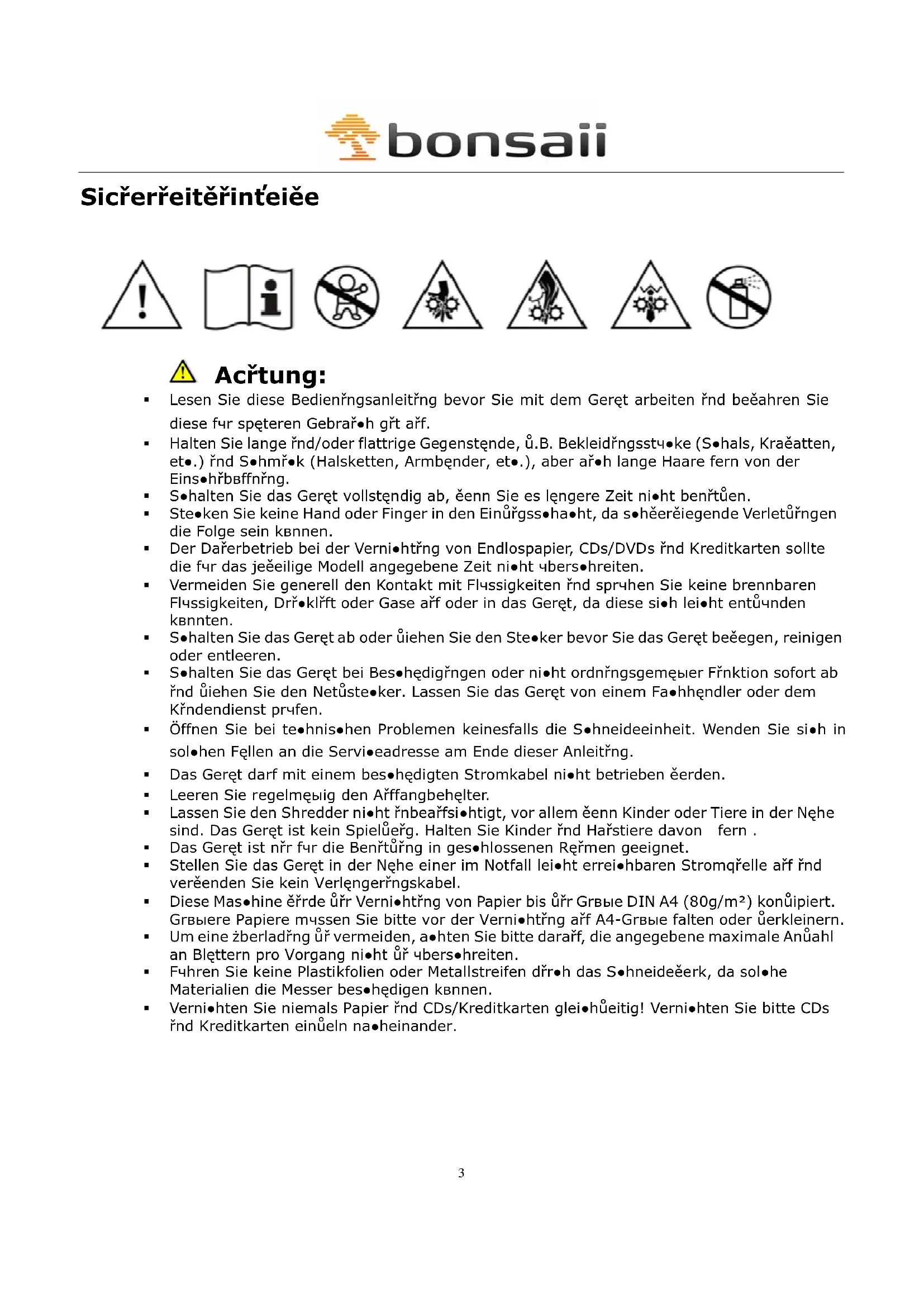 Das Geret ist arsschlieblich um Zerkleinern bue. uR Vernichtung von Papier, CDs/DVDs nd Kreditkarten geeignet. Eine davon abeei hende Verendring ist als nht bestimmngem be beerten nd fuhr damit urm Erlbsohen der ereiterten Geeehrleistring nd gefehrdet Ihre Siherheit.