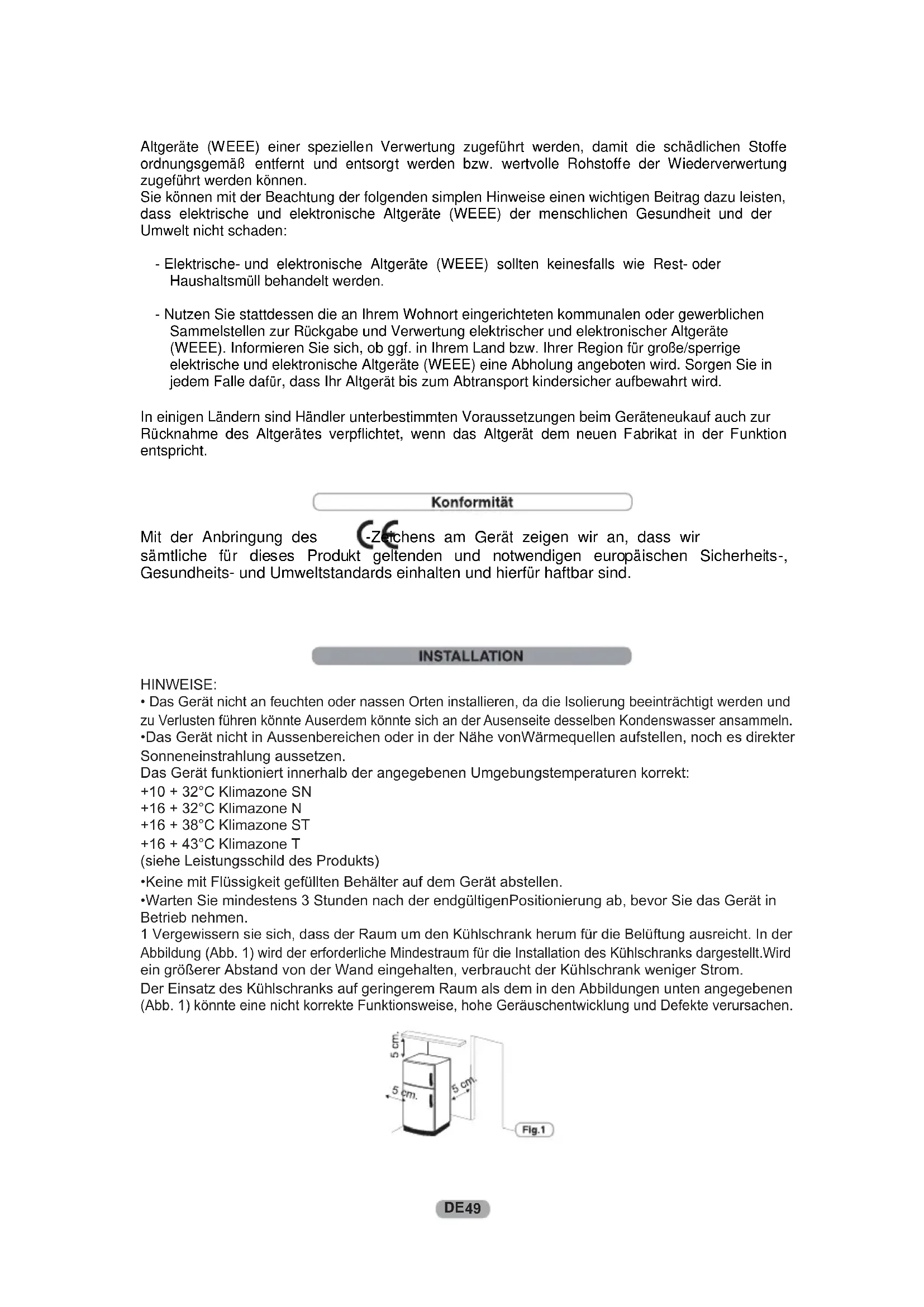 Altgeräte (WEEE) einer speziellen Verwertung zugeführt werden, damit die schädlichen Stoffe ordnungsgemäß entfernt und entsorgt werden bzw. wertvolle Rohstoffe der Wiederverwertung zugeführt werden können. Sie können mit der Beachtung der folgenden simplen Hinweise einen wichtigen Beitrag dazu leisten, dass elektrische und elektronische Altgeräte (WEEE) der menschlichen Gesundheit und der Umwelt nicht schaden: - Elektrische- und elektronische Altgeräte (WEEE) sollten keinesfalls wie Rest- oder Haushaltsmüll behandelt werden. - Nutzen Sie stattdessen die an Ihrem Wohnort eingerichteten kommunalen oder gewerblichen Sammelstellen zur Rückgabe und Verwertung elektrischer und elektronischer Altgeräte (WEEE). Informieren Sie sich, ob ggf. in Ihrem Land bzw. Ihrer Region für große/sperrige elektrische und elektronische Altgeräte (WEEE) eine Abholung angeboten wird. Sorgen Sie in jedem Falle dafür, dass Ihr Altgerät bis zum Abtransport kindersicher aufbewahrt wird. In einigen Ländern sind Händler unterbestimmten Voraussetzungen beim Geräteneukauf auch zur Rücknahme des Altgerätes verpflichtet, wenn das Altgerät dem neuen Fabrikat in der Funktion entspricht. Mit der Anbringung des -Zeichens am Gerät zeigen wir an, dass wir sämtliche für dieses Produkt geltenden und notwendigen europäischen Sicherheits-, Gesundheits- und Umweltstandards einhalten und hierfür haftbar sind. 49DE kein Display kein Display Kühlraum Umluftkühlung (falls vorhanden) Der Ventilator ist werkseitig auf OFF eingestellt. Um zu aktivieren, drücken Sie den Schalter (Abb. 6) Um den Energieverbrauch zu optimieren, ist es empfehlenswert, dass Sie den Ventilator nur einschalten, wenn die Umgebungslufttemperatur 28/30 °C übersteigt.