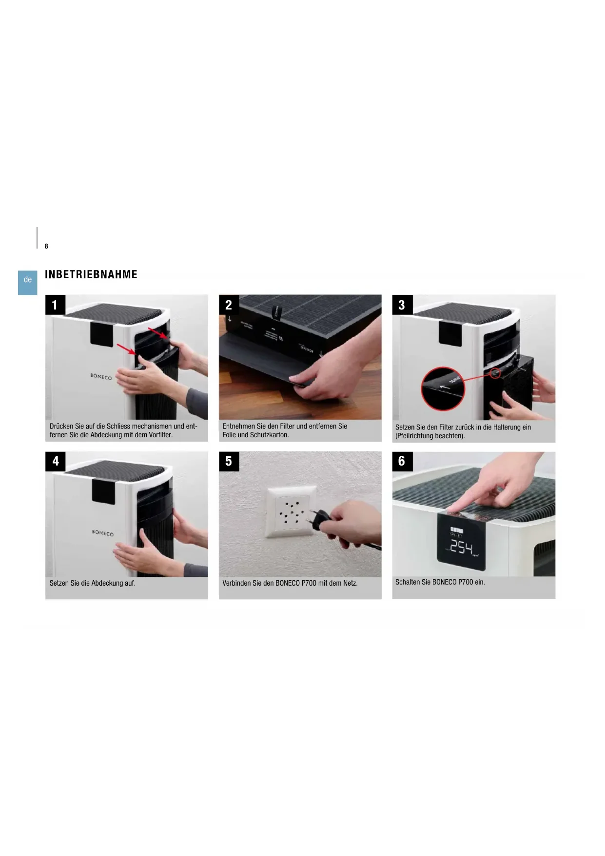 Setzen Sie den Filter zurück in die Halterung ein (Pfeilrichtung beachten). Drücken Sie auf die Schliess mechanismen und ent- fernen Sie die Abdeckung mit dem Vorfilter. Setzen Sie die Abdeckung auf. Entnehmen Sie den Filter und entfernen Sie Folie und Schutzkarton. Schalten Sie BONECO P700 ein. Verbinden Sie den BONECO P700 mit dem Netz.9