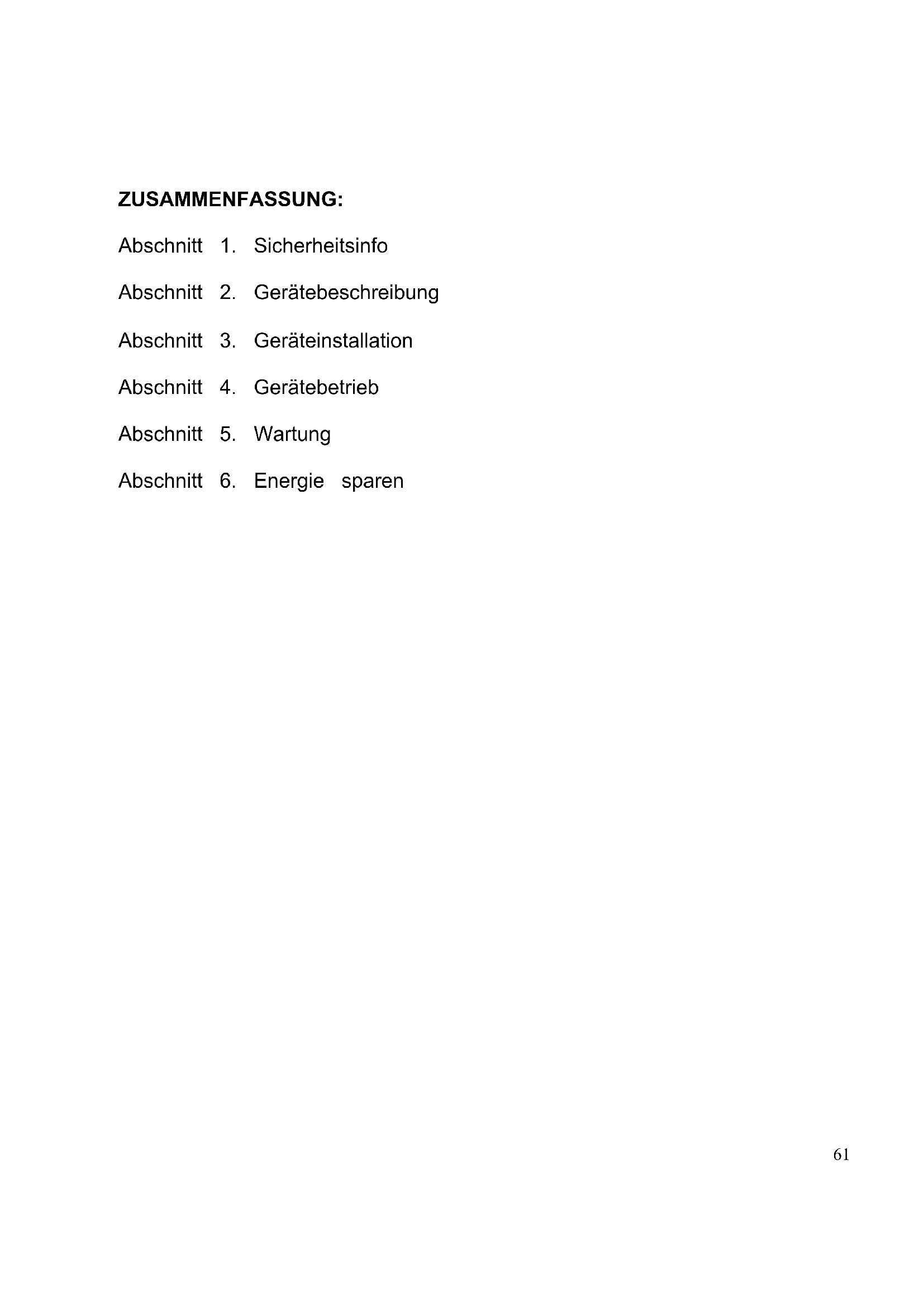 Este electrodoméstico cumple la directiva europea 2012/19/EU en materia de Residuos de Aparatos Eléctricos y Electrónicos (RAEE). Los RAEE contienen tanto sustancias contaminantes (que pueden conllevar consecuencias negativas para el medio ambiente) como componentes básicos (que se pueden reutilizar). Es importante que los RAEE se sometan a tratamientos específicos para eliminar y desechar adecuadamente los contaminantes y recuperar y reciclar todos los materiales. Las personas desempeñan un papel clave a la hora de garantizar que los RAEE no se conviertan en un problema medioambiental. Para ello, es esencial seguir ciertas normas básicas: Los RAEE no deben recibir el mismo tratamiento que los residuos domésticos. Los RAEE deben depositarse en los puntos limpios pertinentes, gestionados por las autoridades locales o por empresas autorizadas. En muchos países, existe un servicio de recogida a domicilio de RAEE de gran tamaño. En muchos países, al comprar un electrodoméstico nuevo, el distribuidor podría encargarse de la recogida del antiguo de forma totalmente gratuita, siempre y cuando el equipo tenga características similares y sea del mismo tipo que el equipo suministrado. Conformidad Mediante la colocación de la marca en este producto confirmamos el cumplimiento de todos los requisitos legislativos europeos relevantes en materia de seguridad, salud y medio ambiente establecidos para este producto.61 ZUSAMMENFASSUNG: Abschnitt 1. Sicherheitsinfo Abschnitt 2. Gerätebeschreibung Abschnitt 3. Geräteinstallation Abschnitt 4. Gerätebetrieb Abschnitt 5. Wartung Abschnitt 6. Energie sparen62 Vielen Dank für den Kauf dieses Produkts. Bitte lesen Sie vor dem Gebrauch des Kühlschranks diese Anleitung sorgfältig, um das Gerät optimal zu nutzen. Bewahren Sie die gesamte Referenzdokumentation zum Nachschlagen oder für einen eventuellen späteren Besitzer auf. Dieses Gerät ist ausschließlich für den Hausgebrauch und vergleichbare Verwendung bestimmt, wie: - Personalküchen in Geschäften, Büros und anderen Arbeitsumgebungen, - in landwirtschaftlichen Betrieben, für die Nutzung durch Gäste von Hotels, Motels und ähnlichen Unterkünften, - Bed & Breakfast (B&B), - Catering-Dienste und ähnliche Zwecke im Einzelhandel. Das Gerät darf ausschließlich für die Konservierung von Lebensmitteln verwendet werden. Jede andere Verwendung wird als gefährlich erachtet und der Hersteller weist im Fall der Nichtbeachtung jede Haftung zurück. Bitte lesen Sie auch die Garantiebestimmungen. Um die bestmögliche Leistung zu erzielen und einen problemlosen Betrieb zu gewährleisten, lesen Sie zunächst diese Anweisungen sorgfältig durch. Die Nichtbeachtung dieser Anweisungen kann zum Erlöschen des Anspruchs auf kostenlosen Kundenservice während der Garantiezeit führen.63 Abschnitt 1.SICHERHEITSINFORMATIONEN Diese Anleitung enthält wichtige Sicherheitsinformationen. Bewahren Sie diese Anleitung daher zum Nachschlagen und damit Sie Ihr Gerät optimal nutzen können sicher auf. Die Kühltruhe enthält ein Kühlgas (R600a: Isobutan) und ein Schaumtreibmittel (Cyclopentane) zur Isolierung, die sehr umweltfreundlich, aber entflammbar sind. Vorsicht: Feuergefahr Wenn der Kühlkreislauf beschädigt wird: Offenes Feuer und Zündquellen vermeiden. Den Raum, in dem sich das Gerät befindet, gut lüften. Anteil Laufzeiten:18℃: WARNUNG! Vorsicht beim Reinigen/Tragen des Geräts, sodass das Metall der Kühlschlaufen nicht berührt wird, da dies Finger und Hände verletzen oder das Gerät beschädigen könnte.