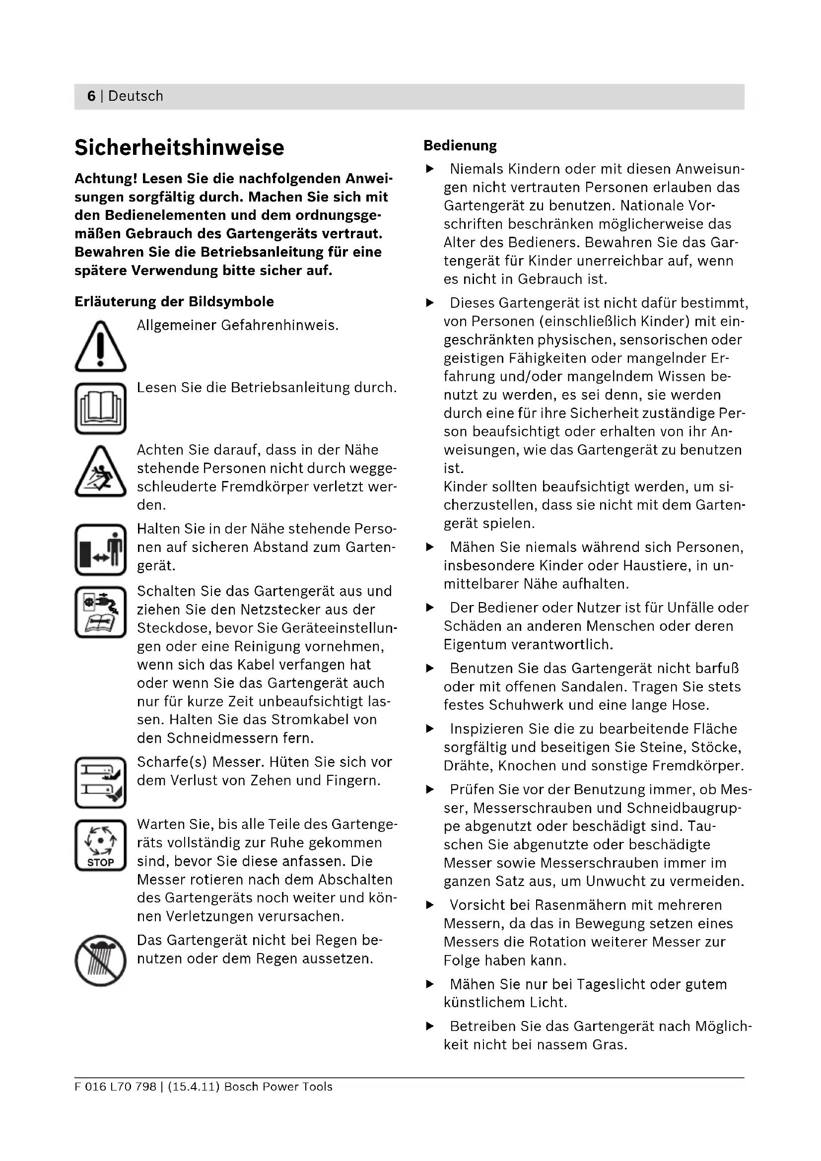 Sicherheitshinweise Achtung! Lesen Sie die nachfolgenden Anwei- sungen sorgfältig durch. Machen Sie sich mit den Bedienelementen und dem ordnungsge- mäßen Gebrauch des Gartengeräts vertraut. Bewahren Sie die Betriebsanleitung für eine spätere Verwendung bitte sicher auf. Erläuterung der Bildsymbole Allgemeiner Gefahrenhinweis. Lesen Sie die Betriebsanleitung durch. Achten Sie darauf, dass in der Nähe stehende Personen nicht durch wegge- schleuderte Fremdkörper verletzt wer- den. Halten Sie in der Nähe stehende Perso- nen auf sicheren Abstand zum Garten- gerät. Schalten Sie das Gartengerät aus und ziehen Sie den Netzstecker aus der Steckdose, bevor Sie Geräteeinstellun- gen oder eine Reinigung vornehmen, wenn sich das Kabel verfangen hat oder wenn Sie das Gartengerät auch nur für kurze Zeit unbeaufsichtigt las- sen. Halten Sie das Stromkabel von den Schneidmessern fern. Scharfe(s) Messer. Hüten Sie sich vor dem Verlust von Zehen und Fingern. Warten Sie, bis alle Teile des Gartenge- räts vollständig zur Ruhe gekommen sind, bevor Sie diese anfassen. Die Messer rotieren nach dem Abschalten des Gartengeräts noch weiter und kön- nen Verletzungen verursachen. Das Gartengerät nicht bei Regen be- nutzen oder dem Regen aussetzen. Bedienung f Niemals Kindern oder mit diesen Anweisun- gen nicht vertrauten Personen erlauben das Gartengerät zu benutzen. Nationale Vor- schriften beschränken möglicherweise das Alter des Bedieners. Bewahren Sie das Gar- tengerät für Kinder unerreichbar auf, wenn es nicht in Gebrauch ist. f Dieses Gartengerät ist nicht dafür bestimmt, von Personen (einschließlich Kinder) mit ein- geschränkten physischen, sensorischen oder geistigen Fähigkeiten oder mangelnder Er- fahrung und/oder mangelndem Wissen be- nutzt zu werden, es sei denn, sie werden durch eine für ihre Sicherheit zuständige Per- son beaufsichtigt oder erhalten von ihr An- weisungen, wie das Gartengerät zu benutzen ist. Kinder sollten beaufsichtigt werden, um si- cherzustellen, dass sie nicht mit dem Garten- gerät spielen. f Mähen Sie niemals während sich Personen, insbesondere Kinder oder Haustiere, in un- mittelbarer Nähe aufhalten. f Der Bediener oder Nutzer ist für Unfälle oder Schäden an anderen Menschen oder deren Eigentum verantwortlich. f Benutzen Sie das Gartengerät nicht barfuß oder mit offenen Sandalen. Tragen Sie stets festes Schuhwerk und eine lange Hose. f Inspizieren Sie die zu bearbeitende Fläche sorgfältig und beseitigen Sie Steine, Stöcke, Drähte, Knochen und sonstige Fremdkörper. f Prüfen Sie vor der Benutzung immer, ob Mes- ser, Messerschrauben und Schneidbaugrup- pe abgenutzt oder beschädigt sind. Tau- schen Sie abgenutzte oder beschädigte Messer sowie Messerschrauben immer im ganzen Satz aus, um Unwucht zu vermeiden. f Vorsicht bei Rasenmähern mit mehreren Messern, da das in Bewegung setzen eines Messers die Rotation weiterer Messer zur Folge haben kann. f Mähen Sie nur bei Tageslicht oder gutem künstlichem Licht. f Betreiben Sie das Gartengerät nach Möglich- keit nicht bei nassem Gras. STOP OBJ_BUCH-1393-001.book Page 6 Friday, April 15, 2011 10:36 AMDeutsch | 7 Bosch Power Tools F 016 L70 798 | (15.4.11) f Stets ruhig gehen, niemals schnell laufen. f Das Arbeiten an Böschungen kann gefährlich sein. – Mähen Sie keine besonders steilen Ab- hänge. – Achten Sie auf schrägen Flächen oder auf nassem Gras stets auf sicheren Tritt. – Mähen Sie auf schrägen Flächen immer quer und niemals auf- und abwärts. – Gehen Sie beim Richtungswechsel an Ab- hängen äußerst vorsichtig vor. – Gehen Sie beim Rückwärtsgehen oder Ziehen des Gartengeräts äußerst vorsich- tig vor. – Schieben Sie das Gartengerät beim Mä- hen immer vorwärts und ziehen Sie dieses niemals zum Körper hin. f Die Messer müssen stehen, wenn Sie das Gartengerät für den Transport kippen müs- sen, wenn Sie nicht mit Gras bepflanzte Flä- chen überqueren und wenn Sie das Garten- gerät zu und von dem zu mähenden Bereich transportieren. f Kippen Sie das Gartengerät beim Starten oder Anlassen des Motors nicht, außer dies ist zum Starten in hohem Gras erforderlich. In diesem Fall, die vom Bediener abgewandte Seite durch Niederdrücken des Handgriffes nicht weiter als unbedingt nötig anheben. Achten Sie darauf, dass sich Ihre Hände am Griff befinden, wenn Sie das Gartengerät wieder ablassen. f Schalten Sie das Gartengerät wie in der Be- triebsanleitung beschrieben ein und achten Sie darauf, dass Ihre Füße ausreichend weit von rotierenden Teilen entfernt sind. f Bringen Sie Ihre Hände und Füße nicht in die Nähe oder unter rotierende Teile. f Halten Sie Abstand zur Auswurfzone, wenn Sie mit dem Gartengerät arbeiten. f Heben bzw. tragen Sie das Gartengerät nie- mals bei laufendem Motor. f Betreiben Sie das Gartengerät niemals mit defekten Schutzvorrichtungen, Abdeckungen oder ohne Sicherheitseinrichtungen, wie z. B. Prallschutz und/oder Grasfangkorb. f Gehen Sie bei Einstellarbeiten am Rasenmä- her äußerst vorsichtig vor, um ein Einklem- men von Händen und Füßen zwischen den beweglichen Messern und feststehenden Ge- räteteilen des Rasenmähers zu vermeiden. f Halten Sie Strom- und Verlängerungskabel vom Messer fern. Das Messer kann die Kabel beschädigen und Sie mit spannungsführenden Teilen in Berührung bringen. Vorsicht, es be- steht die Gefahr eines elektrischen Schlages. Netzstecker aus der Steckdose ziehen: – immer wenn Sie sich vom Gartengerät entfer- nen, – vor dem Beseitigen von Blockierungen, – wenn Sie das Gartengerät überprüfen, reini- gen oder an ihm arbeiten, – nach der Kollision mit einem Fremdkörper. Überprüfen Sie das Gartengerät sofort auf Beschädigungen und lassen Sie es wenn not- wendig instandsetzen, – wenn das Gartengerät ungewöhnlich zu vib- rieren beginnt (sofort prüfen). Stromanschluss f Die Spannung der Stromquelle muss mit den Angaben auf dem Typenschild des Gartenge- rätes übereinstimm