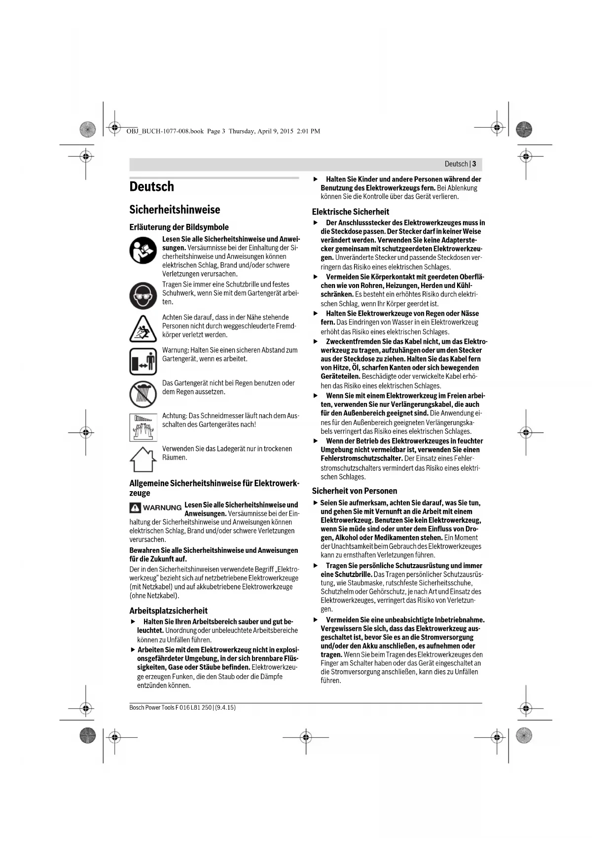 ro Instrucţiuni originale bg Оригинална инструкция mk Оригинално упатство за работа sr Originalno uputstvo za rad sl Izvirna navodila hr Originalne upute za rad et Algupärane kasutusjuhend lv Instrukcijas oriģinālvalodā lt Originali instrukcija OBJ_DOKU-18949-008.fm Page 1 Thursday, April 9, 2015 2:01 PM2 | F 016 L81 250 | (9.4.15) Bosch Power Tools Deutsch . . . . . . . . . . . . . . . . . . . . . . . . . . . . . . . . . . . . . . . . . Seite 3 English . . . . . . . . . . . . . . . . . . . . . . . . . . . . . . . . . . . . . . . . . . Page 10 Français . . . . . . . . . . . . . . . . . . . . . . . . . . . . . . . . . . . . . . . . . Page 18 Español . . . . . . . . . . . . . . . . . . . . . . . . . . . . . . . . . . . . . . . . Página 25 Português. . . . . . . . . . . . . . . . . . . . . . . . . . . . . . . . . . . . . . . Página 33 Italiano . . . . . . . . . . . . . . . . . . . . . . . . . . . . . . . . . . . . . . . . . Pagina 41 Nederlands . . . . . . . . . . . . . . . . . . . . . . . . . . . . . . . . . . . . . Pagina 49 Dansk . . . . . . . . . . . . . . . . . . . . . . . . . . . . . . . . . . . . . . . . . . . Side 56 Svenska . . . . . . . . . . . . . . . . . . . . . . . . . . . . . . . . . . . . . . . . . Sida 63 Norsk . . . . . . . . . . . . . . . . . . . . . . . . . . . . . . . . . . . . . . . . . . . Side 70 Suomi. . . . . . . . . . . . . . . . . . . . . . . . . . . . . . . . . . . . . . . . . . . . Sivu 77 Ελληνικά. . . . . . . . . . . . . . . . . . . . . . . . . . . . . . . . . . . . . . . . Σελίδα 83 Türkçe . . . . . . . . . . . . . . . . . . . . . . . . . . . . . . . . . . . . . . . . . Sayfa 91 Polski . . . . . . . . . . . . . . . . . . . . . . . . . . . . . . . . . . . . . . . . . . Strona 99 Česky . . . . . . . . . . . . . . . . . . . . . . . . . . . . . . . . . . . . . . . . . . Strana 107 Slovensky. . . . . . . . . . . . . . . . . . . . . . . . . . . . . . . . . . . . . . . Strana 114 Magyar . . . . . . . . . . . . . . . . . . . . . . . . . . . . . . . . . . . . . . . . . . Oldal 122 Русский . . . . . . . . . . . . . . . . . . . . . . . . . . . . . . . . . . . . . Страница 130 Українська. . . . . . . . . . . . . . . . . . . . . . . . . . . . . . . . . . . Сторінка 140 Қазақша. . . . . . . . . . . . . . . . . . . . . . . . . . . . . . . . . . . . . . . . . . .Бет 148 Română . . . . . . . . . . . . . . . . . . . . . . . . . . . . . . . . . . . . . . . . Pagina 157 Български . . . . . . . . . . . . . . . . . . . . . . . . . . . . . . . . . . . Страница 164 Македонски . . . . . . . . . . . . . . . . . . . . . . . . . . . . . . . . . . . Страна 173 Srpski. . . . . . . . . . . . . . . . . . . . . . . . . . . . . . . . . . . . . . . . . . Strana 180 Slovensko . . . . . . . . . . . . . . . . . . . . . . . . . . . . . . . . . . . . . . . Stran 187 Hrvatski . . . . . . . . . . . . . . . . . . . . . . . . . . . . . . . . . . . . . . Stranica 194 Eesti . . . . . . . . . . . . . . . . . . . . . . . . . . . . . . . . . . . . . . . . . Lehekülg 201 Latviešu . . . . . . . . . . . . . . . . . . . . . . . . . . . . . . . . . . . . . . Lappuse 208 Lietuviškai . . . . . . . . . . . . . . . . . . . . . . . . . . . . . . . . . . . . Puslapis 216 OBJ_BUCH-1077-008.book Page 2 Thursday, April 9, 2015 2:13 PMDeutsch | 3 Bosch Power Tools F 016 L81 250 | (9.4.15) Deutsch Sicherheitshinweise Erläuterung der Bildsymbole Lesen Sie alle Sicherheitshinweise und Anwei- sungen. Versäumnisse bei der Einhaltung der Si- cherheitshinweise und Anweisungen können elektrischen Schlag, Brand und/oder schwere Verletzungen verursachen. Tragen Sie immer eine Schutzbrille und festes Schuhwerk, wenn Sie mit dem Gartengerät arbei- ten. Achten Sie darauf, dass in der Nähe stehende Personen nicht durch weggeschleuderte Fremd- körper verletzt werden. Warnung: Halten Sie einen sicheren Abstand zum Gartengerät, wenn es arbeitet. Das Gartengerät nicht bei Regen benutzen oder dem Regen aussetzen. Achtung: Das Schneidmesser läuft nach dem Aus- schalten des Gartengerätes nach! Verwenden Sie das Ladegerät nur in trockenen Räumen. Allgemeine Sicherheitshinweise für Elektrowerk- zeuge Lesen Sie alle Sicherheitshinweise und Anweisungen. Versäumnisse bei der Ein- haltung der Sicherheitshinweise und Anweisungen können elektrischen Schlag, Brand und/oder schwere Verletzungen verursachen. Bewahren Sie alle Sicherheitshinweise und Anweisungen für die Zukunft auf. Der in den Sicherheitshinweisen verwendete Begriff „Elektro- werkzeug“ bezieht sich auf netzbetriebene Elektrowerkzeuge (mit Netzkabel) und auf akkubetriebene Elektrowerkzeuge (ohne Netzkabel). Arbeitsplatzsicherheit Halten Sie Ihren Arbeitsbereich sauber und gut be- leuchtet. Unordnung oder unbeleuchtete Arbeitsbereiche können zu Unfällen führen. Arbeiten Sie mit dem Elektrowerkzeug nicht in explosi- onsgefährdeter Umgebung, in der sich brennbare Flüs- sigkeiten, Gase oder Stäube befinden. Elektrowerkzeu- ge erzeugen Funken, die den Staub oder die Dämpfe entzünden können. Halten Sie Kinder und andere Personen während der Benutzung des Elektrowerkzeugs fern. Bei Ablenkung können Sie die Kontrolle über das Gerät verlieren. Elektrische Sicherheit Der Anschlussstecker des Elektrowerkzeuges muss in die Steckdose passen. Der Stecker darf in keiner Weise verändert werden. Verwenden Sie keine Adapterste- cker gemeinsam mit schutzgeerdeten Elektrowerkzeu- gen. Unveränderte Stecker und passende Steckdosen ver- ringern das Risiko eines elektrischen Schlages. Vermeiden Sie Körperkontakt mit geerdeten Oberflä- chen wie von Rohren, Heizungen, Herden und Kühl- schränken. Es besteht ein erhöhtes Risiko durch elektri- schen Schlag, wenn Ihr Körper geerdet ist. Halten Sie Elektrowerkzeuge von Regen oder Nässe fern. Das Eindringen von Wasser in ein Elektrowerkzeug erhöht das Risiko eines elektrischen