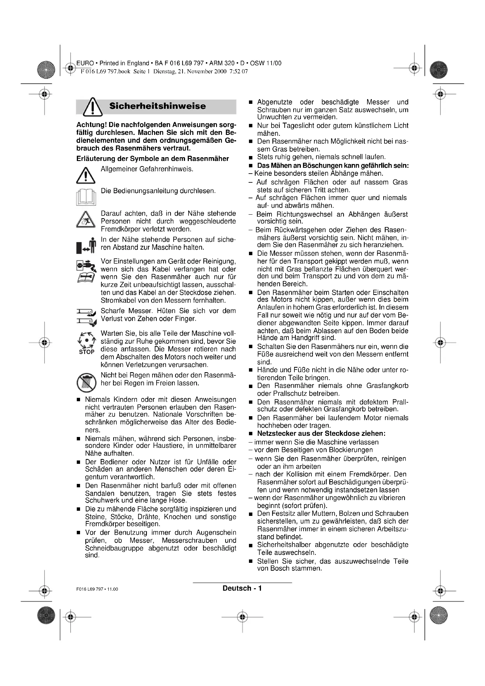 Stellen Sie sicher, das auszuwechselnde Teile von Bosch stammen. Sicherheitshinweise STOP F 016 L69 797.book Seite 1 Dienstag, 21. November 2000 7:52 07Deutsch - 2 EURO • Printed in England • BA F 016 L69 797 • ARM 320 • D • OSW 11/00 F016 L69 797 • 11.00 Leisemäher ARM 320 Bestellnummer 0 600 899 0.. Nennaufnahme 950 W Messerbreite 32 cm Schnitthöhe 24 - 70 mm Volumen Grasfangkorb 35 l Gewicht 12 kg Schutzklasse / II Seriennummer siehe Leistungsangaben an der Maschine Dieses Produkt arbeitet mit einem sehr niedrigen Geräuschpegel, bezogen auf die in Ihrem Land gel- tenden Vorschriften. Dieses Produkt ist bestimmt für das Rasenmähen im privaten Bereich. Dieses Handbuch enthält Anweisungen über die richtige Montage und den sicheren Gebrauch Ihrer Maschine. Es ist wichtig, daß Sie diese Anweisun- gen sorgfältig lesen. Die Maschine wiegt im vollständig zusammengebau- ten Zustand etwa 12 kg. Holen Sie bei Bedarf Hilfe, um die Maschine aus der Verpackung zu nehmen. Achten Sie auf die scharfen Messer, wenn Sie den Rasenmähers zum Rasen tragen. Nehmen Sie den Rasenmäher vorsichtig aus der Verpackung prüfen Sie, ob die nachfolgenden Teile vollständig sind: – Rasenmäher mit Fahrgestänge – 2 Griffbügel-Unterteile – 2 Schrauben – 2 Flügelmuttern – 2 Blechschrauben – Grasfangkorb (2 Hälften) – Bedienungsanleitung – Ersatzteilliste Wenn Teile fehlen oder beschädigt sind, wenden Sie sich bitte an Ihren Händler.