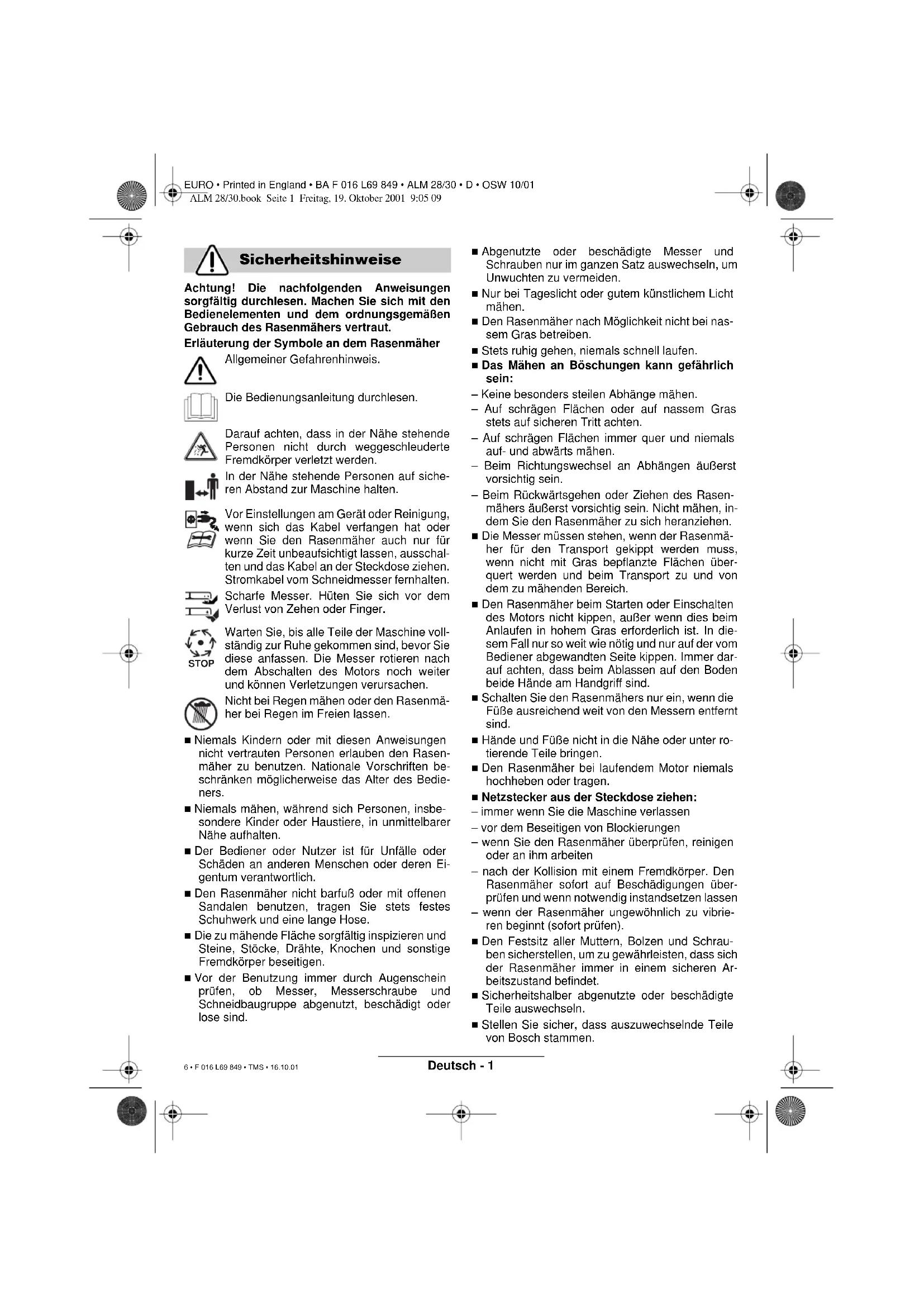 ALM 28/30.book Seite 5 Freitag, 19. Oktober 2001 9:05 09EURO • Printed in England • BA F 016 L69 849 • ALM 28/30 • D • OSW 10/01 Deutsch - 1 Achtung! Die nachfolgenden Anweisungen sorgfältig durchlesen. Machen Sie sich mit den Bedienelementen und dem ordnungsgemäßen Gebrauch des Rasenmähers vertraut. Erläuterung der Symbole an dem Rasenmäher Allgemeiner Gefahrenhinweis. Die Bedienungsanleitung durchlesen. Darauf achten, dass in der Nähe stehende Personen nicht durch weggeschleuderte Fremdkörper verletzt werden. In der Nähe stehende Personen auf siche- ren Abstand zur Maschine halten. Vor Einstellungen am Gerät oder Reinigung, wenn sich das Kabel verfangen hat oder wenn Sie den Rasenmäher auch nur für kurze Zeit unbeaufsichtigt lassen, ausschal- ten und das Kabel an der Steckdose ziehen. Stromkabel vom Schneidmesser fernhalten. Scharfe Messer. Hüten Sie sich vor dem Verlust von Zehen oder Finger. Warten Sie, bis alle Teile der Maschine voll- ständig zur Ruhe gekommen sind, bevor Sie diese anfassen. Die Messer rotieren nach dem Abschalten des Motors noch weiter und können Verletzungen verursachen. Nicht bei Regen mähen oder den Rasenmä- her bei Regen im Freien lassen. ■ Niemals Kindern oder mit diesen Anweisungen nicht vertrauten Personen erlauben den Rasen- mäher zu benutzen. Nationale Vorschriften be- schränken möglicherweise das Alter des Bedie- ners. ■ Niemals mähen, während sich Personen, insbe- sondere Kinder oder Haustiere, in unmittelbarer Nähe aufhalten. ■ Der Bediener oder Nutzer ist für Unfälle oder Schäden an anderen Menschen oder deren Ei- gentum verantwortlich. ■ Den Rasenmäher nicht barfuß oder mit offenen Sandalen benutzen, tragen Sie stets festes Schuhwerk und eine lange Hose. ■ Die zu mähende Fläche sorgfältig inspizieren und Steine, Stöcke, Drähte, Knochen und sonstige Fremdkörper beseitigen. ■ Vor der Benutzung immer durch Augenschein prüfen, ob Messer, Messerschraube und Schneidbaugruppe abgenutzt, beschädigt oder lose sind. ■ Abgenutzte oder beschädigte Messer und Schrauben nur im ganzen Satz auswechseln, um Unwuchten zu vermeiden. ■ Nur bei Tageslicht oder gutem künstlichem Licht mähen. ■ Den Rasenmäher nach Möglichkeit nicht bei nas- sem Gras betreiben. ■ Stets ruhig gehen, niemals schnell laufen. ■ Das Mähen an Böschungen kann gefährlich sein: – Keine besonders steilen Abhänge mähen. – Auf schrägen Flächen oder auf nassem Gras stets auf sicheren Tritt achten. – Auf schrägen Flächen immer quer und niemals auf- und abwärts mähen. – Beim Richtungswechsel an Abhängen äußerst vorsichtig sein. – Beim Rückwärtsgehen oder Ziehen des Rasen- mähers äußerst vorsichtig sein. Nicht mähen, in- dem Sie den Rasenmäher zu sich heranziehen. ■ Die Messer müssen stehen, wenn der Rasenmä- her für den Transport gekippt werden muss, wenn nicht mit Gras bepflanzte Flächen über- quert werden und beim Transport zu und von dem zu mähenden Bereich. ■ Den Rasenmäher beim Starten oder Einschalten des Motors nicht kippen, außer wenn dies beim Anlaufen in hohem Gras erforderlich ist. In die- sem Fall nur so weit wie nötig und nur auf der vom Bediener abgewandten Seite kippen. Immer dar- auf achten, dass beim Ablassen auf den Boden beide Hände am Handgriff sind. ■ Schalten Sie den Rasenmähers nur ein, wenn die Füße ausreichend weit von den Messern entfernt sind. ■ Hände und Füße nicht in die Nähe oder unter ro- tierende Teile bringen. ■ Den Rasenmäher bei laufendem Motor niemals hochheben oder tragen. ■ Netzstecker aus der Steckdose ziehen: – immer wenn Sie die Maschine verlassen – vor dem Beseitigen von Blockierungen – wenn Sie den Rasenmäher überprüfen, reinigen oder an ihm arbeiten – nach der Kollision mit einem Fremdkörper. Den Rasenmäher sofort auf Beschädigungen über- prüfen und wenn notwendig instandsetzen lassen – wenn der Rasenmäher ungewöhnlich zu vibrie- ren beginnt (sofort prüfen). ■ Den Festsitz aller Muttern, Bolzen und Schrau- ben sicherstellen, um zu gewährleisten, dass sich der Rasenmäher immer in einem sicheren Ar- beitszustand befindet. ■ Sicherheitshalber abgenutzte oder beschädigte Teile auswechseln. ■ Stellen Sie sicher, dass auszuwechselnde Teile von Bosch stammen. Sicherheitshinweise STOP ALM 28/30.book Seite 1 Freitag, 19. Oktober 2001 9:05 09 6 • F 016 L69 849 • TMS • 16.10.01EURO • Printed in England • BA F 016 L69 849 • ALM 28/30 • D • OSW 10/01 Deutsch - 2 Dieses Produkt ist bestimmt für das Rasenmähen im privaten Bereich. Dieses Handbuch enthält Anweisungen über die richtige Montage und den sicheren Gebrauch Ihrer Maschine. Es ist wichtig, dass Sie diese Anweisun- gen sorgfältig lesen. Die Maschine wiegt im vollständig zusammengebau- ten Zustand etwa 4,6 kg. Holen Sie bei Bedarf Hilfe, um die Maschine aus der Verpackung zu nehmen. Nehmen Sie den Rasenmäher vorsichtig aus der Verpackung prüfen Sie, ob die nachfolgenden Teile vollständig sind: – Rasenmäher mit Fahrgestänge – 1 Griffbügel-Unterteil – 2 Schrauben – 2 Flügelmuttern – 2 Bolzen – 2 Kabelclips – Bedienungsanleitung Wenn Teile fehlen oder beschädigt sind, wenden Sie sich bitte an Ihren Händler. 1 Schalthebel 2 Sicherheitsknopf 3 Griffbügel-Oberteil 4 Netzstecker** 5 Kabel-Zugentlastung 6 Griffbügel-Unterteil ** länderspezifisch Abgebildetes oder beschriebenes Zubehör gehört teilweise nicht zum Lieferumfang. Elektrische Sicherheit Ihre Maschine ist zur Sicherheit doppelt schutziso- liert und benötigt keine Erdung. Die Betriebsspan- nung beträgt 230 V AC, 50 Hz. Nur zugelassene Verlängerungskabel verwenden. Informationen er- halten Sie bei Ihrer autorisierten Kundendienst- stelle. Es dürfen nur Verlängerungskabel der Bauart H05VV-F oder H05RN-F verwendet werden. Zur Erhöhung der Sicherheit wird empfohlen, einen FI-Schalter (RCD) mit einem Fehlerstrom von maxi- mal 30 mA zu benutzen. Dieser FI-Sch