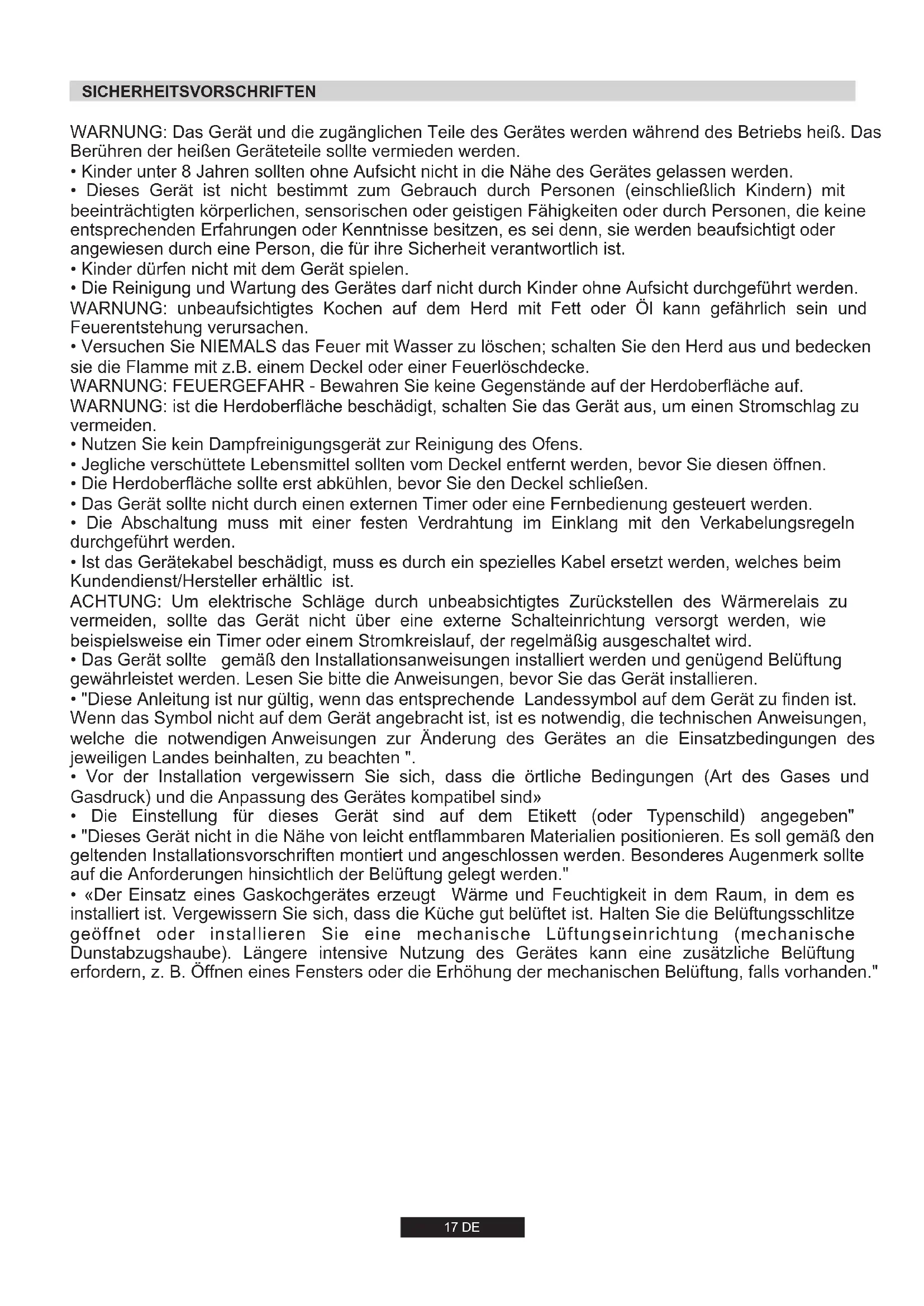- Die Reinigung und Wartung des Gerätes darf nicht durch Kinder ohne Aufsicht durchgeführt werden. WARNUNG: unbeaufsichtigtes Kochen auf dem Herd mit Fett oder Öl kann gefährlich sein und Feuerentstehung verursachen.