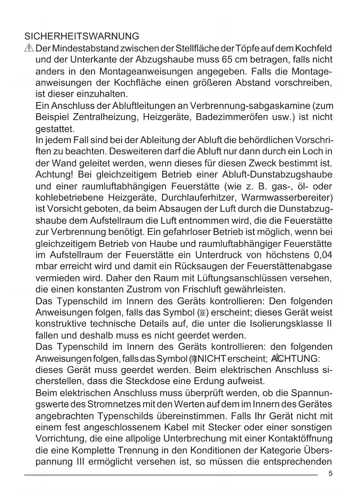 with these instructions may result in electrical hazards. The appliance must be installed by a qualifi ed person in compliance with the instructions provided. Avoid using materials which could cause spurts of fl ame (fl ambées) near the appliance. Do not fl ambé under the range hood. When frying, take particular care to prevent oil and grease from ca- tching fi re. Already used oil is especially dangerous in this respect. Do not use uncovered electric grates. To avoid possible risks of fi re always comply with the indicated in- structions when cleaning grease fi lters and when removing grease deposits from the appliance. This appliance can be used by children aged from 8 years and above and persons with reduced physical, sensory or mental capabilities or lack of experience and knowledge if they have been given supervision or instruction concerning use of the appliance in a safe way by a person responsible for their safety and understand the hazards involved. Chil- dren shall not play with the appliance. Cleaning and user maintenance shall not be made by children without supervision. Caution: accessible parts may become hot when used with cooking appliances. This kitchen hood is intended for installation in domestic kitchens above cooktops, cooking devices and similar kitchen equipment. USE Filtering or ducting version? The hood may be in fi ltering or in ducting version. Decide from the outset which type is to be installed. For better effi ciency, we recommend installing the hood in the ducting version (if possible). Ducting version. The hood purifi es the air and evacuates it to the outside through an exhaust duct. Filtering version The hood purifi es the air and recycles the clean air back into the room. ENVIRONMENT CONCERNS Recycle the materials with the symbol . Put the packaging in applicable containers to recycle it. Help protect the environment and human health and to recycle waste of electrical and electronic appliances. Do not dispose appliances marked with the symbol with the household waste. Return the product to your local recycling facility or contact your municipal offi ce department for household waste or the shop where you purchased this product.4 CONTROLS - Light switch. - First speed motor ON/OFF switch. - Second speed switch. - Third speed switch. LIGHTING Disconnect the hood from the electricity. Warning! Prior to touching the light bulbs ensure they are cooled down. Replace it with lamps of the same type (ø35, E14, 4W). ILCOS D code: DRBB/F-4-220-E14-37/105 MAINTENANCE Thorough servicing guarantees correct and long-lasting operation. Any fat deposits should be removed from the appliance periodically depending on amount of use (at least every 2 months). Avoid using abrasive or corrosive products. To clean painted appliances on the outside, use a cloth dipped in lukewarm water and neutral detergent. To clean steel, copper or brass appliances on the outside, it is always best to use specifi c pro- ducts, following the instructions on the products themselves. To clean the inside of the appliance, use a cloth (or brush) dipped in denatured ethyl alcohol. Clean grease fi lters in relation to use, at least every 2 months to prevent the risk of fi re. Hand wash or clean in a dishwasher using a neutral detergent. If washing in the dishwasher, possible discoloration of the fi lters does not in any way compromise their functioning. The activated charcoal fi lter is not washable and cannot be regenerated, and must be replaced approximately every 4 months of operation, or more frequently for particularly heavy usage.5 SICHERHEITSWARNUNG Der Mindestabstand zwischen der Stellfl äche der Töpfe auf dem Kochfeld und der Unterkante der Abzugshaube muss 65 cm betragen, falls nicht anders in den Montageanweisungen angegeben. Falls die Montage- anweisungen der Kochfl äche einen größeren Abstand vorschreiben, ist dieser einzuhalten. Ein Anschluss der Abluftleitungen an Verbrennung-sabgaskamine (zum Beispiel Zentralheizung, Heizgeräte, Badezimmeröfen usw.) ist nicht gestattet. In jedem Fall sind bei der Ableitung der Abluft die behördlichen Vorschri- ften zu beachten. Desweiteren darf die Abluft nur dann durch ein Loch in der Wand geleitet werden, wenn dieses für diesen Zweck bestimmt ist. Achtung! Bei gleichzeitigem Betrieb einer Abluft-Dunstabzugshaube und einer raumluftabhängigen Feuerstätte (wie z. B. gas-, öl- oder kohlebetriebene Heizgeräte, Durchlauferhitzer, Warmwasserbereiter) ist Vorsicht geboten, da beim Absaugen der Luft durch die Dunstabzug- shaube dem Aufstellraum die Luft entnommen wird, die die Feuerstätte zur Verbrennung benötigt. Ein gefahrloser Betrieb ist möglich, wenn bei gleichzeitigem Betrieb von Haube und raumluftabhängiger Feuerstätte im Aufstellraum der Feuerstätte ein Unterdruck von höchstens 0,04 mbar erreicht wird und damit ein Rücksaugen der Feuerstättenabgase vermieden wird. Daher den Raum mit Lüftungsanschlüssen versehen, die einen konstanten Zustrom von Frischluft gewährleisten. Das Typenschild im Innern des Geräts kontrollieren: Den folgenden Anweisungen folgen, falls das Symbol ( ) erscheint; dieses Gerät weist konstruktive technische Details auf, die unter die Isolierungsklasse II fallen und deshalb muss es nicht geerdet werden. Das Typenschild im Innern des Geräts kontrollieren: den folgenden Anweisungen folgen, falls das Symbol ( ) NICHT erscheint; ACHTUNG: dieses Gerät muss geerdet werden. Beim elektrischen Anschluss si- cherstellen, dass die Steckdose eine Erdung aufweist. Beim elektrischen Anschluss muss überprüft werden, ob die Spannun- gswerte des Stromnetzes mit den Werten auf dem im Innern des Gerätes angebrachten Typenschilds übereinstimmen. Falls Ihr Gerät nicht mit einem fest angeschlossenem Kabel mit Stecker oder einer sonstigen Vorrichtung, die eine allpolige Unterbrechung mit einer Kontaktöffnung die eine Komplette Trennung in den Konditionen der Kategorie Übers- pannung III ermöglicht versehen ist, s