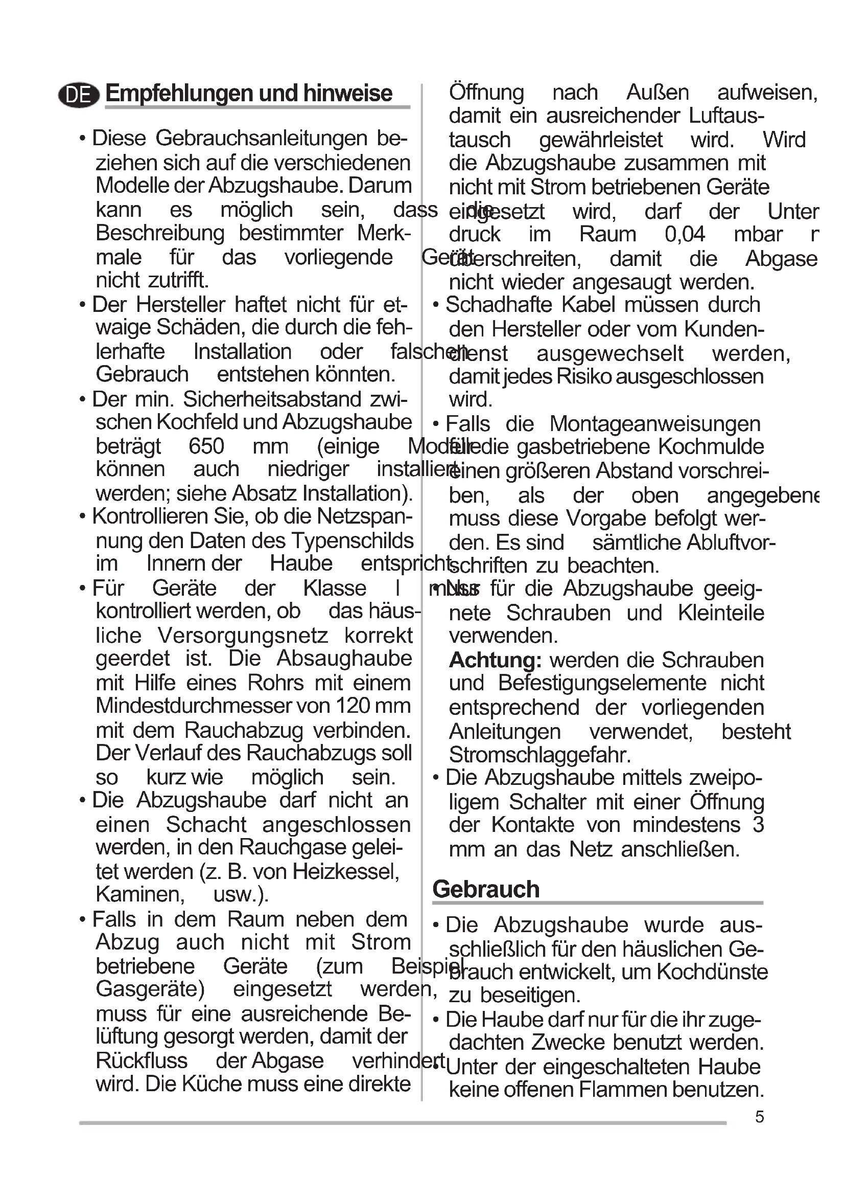 - Falls in dem Raum neben dem Abzug auch nicht mit Strom betriebene Geräte (zum Beispiel Gasgeräte) eingesetzt werden, muss für eine ausreichende Be- lüftunggesorgtwerden,damitder Rückuss derAbgase verhindert wird. Die Küche muss eine direkte Öffnung nach Außen aufweisen, damit ein ausreichender Luftaus- tausch gewährleistet wird. Wird die Abzugshaube zusammen mit nichtmitStrombetriebenenGeräte eingesetzt wird, darf der Unter- druck im Raum 0,04 mbar nicht überschreiten, damit die Abgase nicht wieder angesaugt werden.