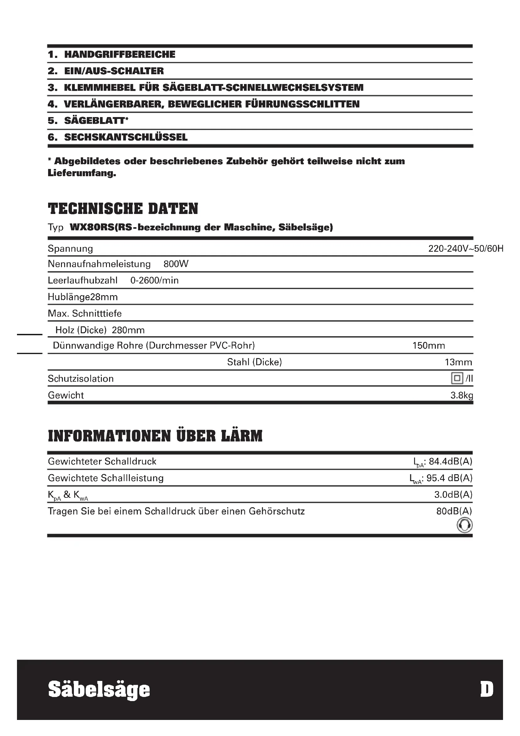 Spannung 220-240V~50/60Hz Nennaufnahmeleistung 800W Leerlaufhubzahl 0-2600/min Hublänge 28mm Max. Schnitttiefe Holz (Dicke) 280mm Dünnwandige Rohre (Durchmesser PVC-Rohr) 150mm Stahl (Dicke) 13mm Schutzisolation /II Gewicht 3.8kg TECHNISCHE DATEN Typ WX80RS(RS-bezeichnung der Maschine, Säbelsäge)