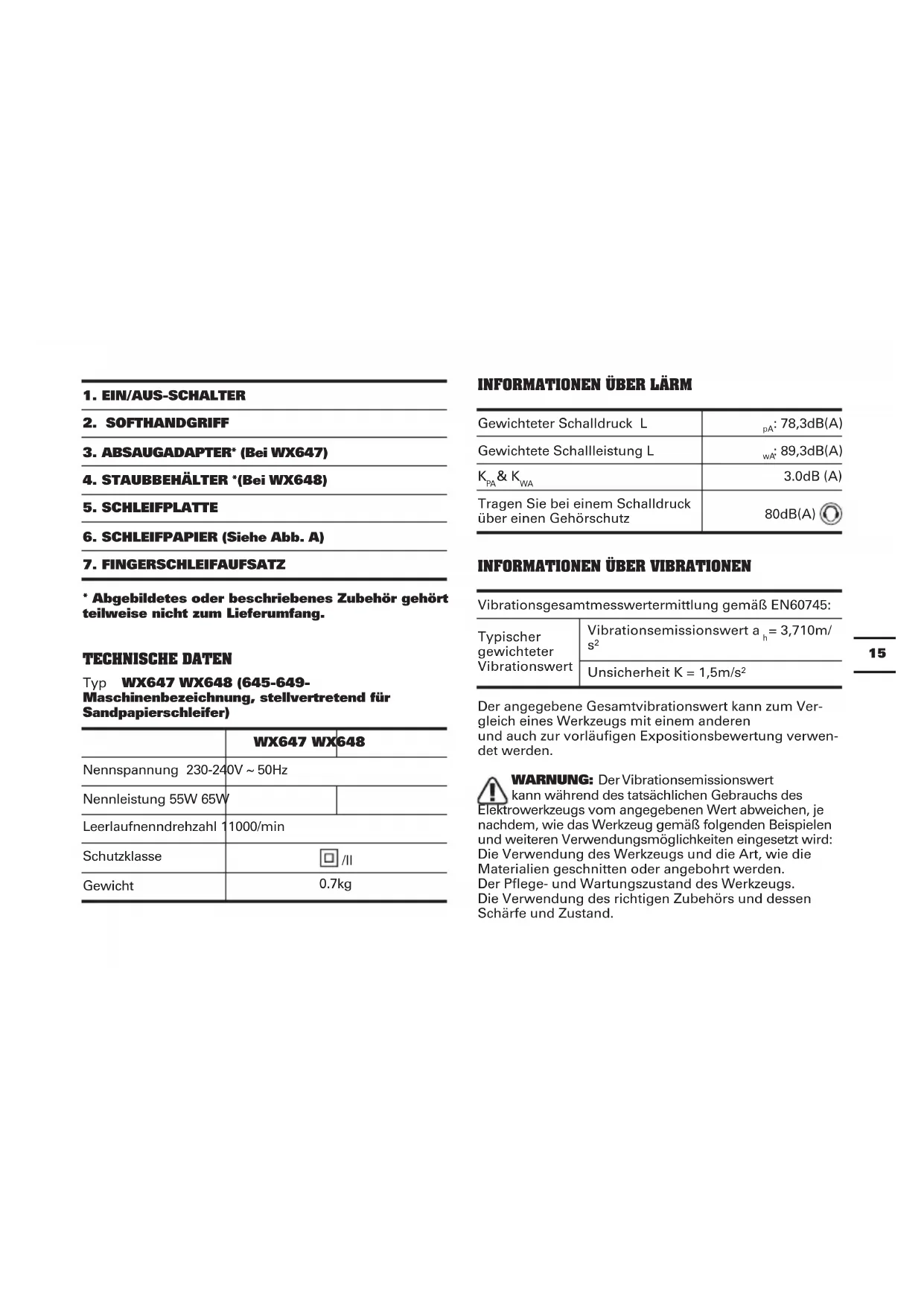 - Abgebildetes oder beschriebenes Zubehör gehört teilweise nicht zum Lieferumfang. TECHNISCHE DATEN Typ WX647 WX648 (645-649- Maschinenbezeichnung, stellvertretend für Sandpapierschleifer) WX647 WX648 Nennspannung 230-240V ~ 50Hz Nennleistung 55W 65W Leerlaufnenndrehzahl 11000/min Schutzklasse /ll Gewicht 0.7kg