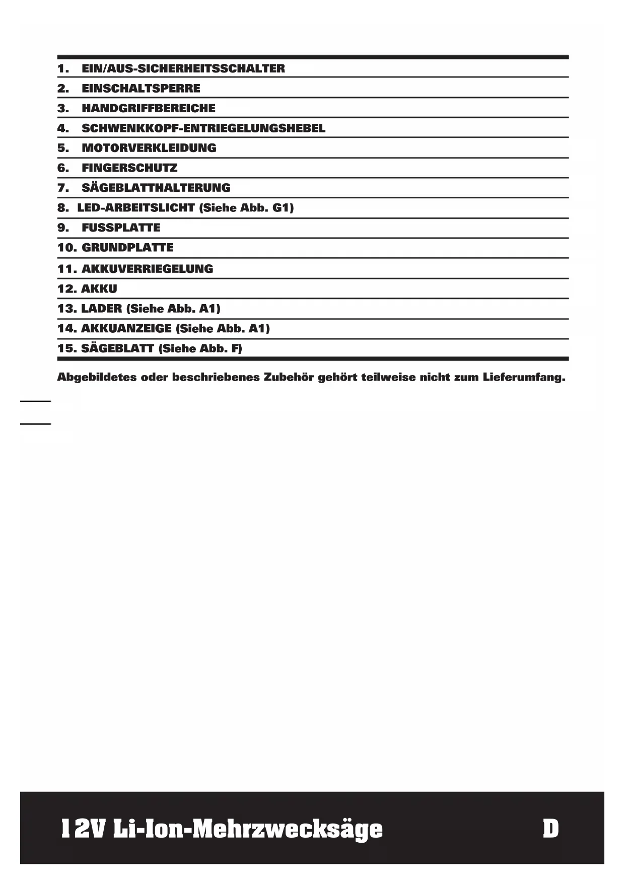 Abgebildetes oder beschriebenes Zubehör gehört teilweise nicht zum Lieferumfang.12V Li-Ion-Mehrzwecksäge D