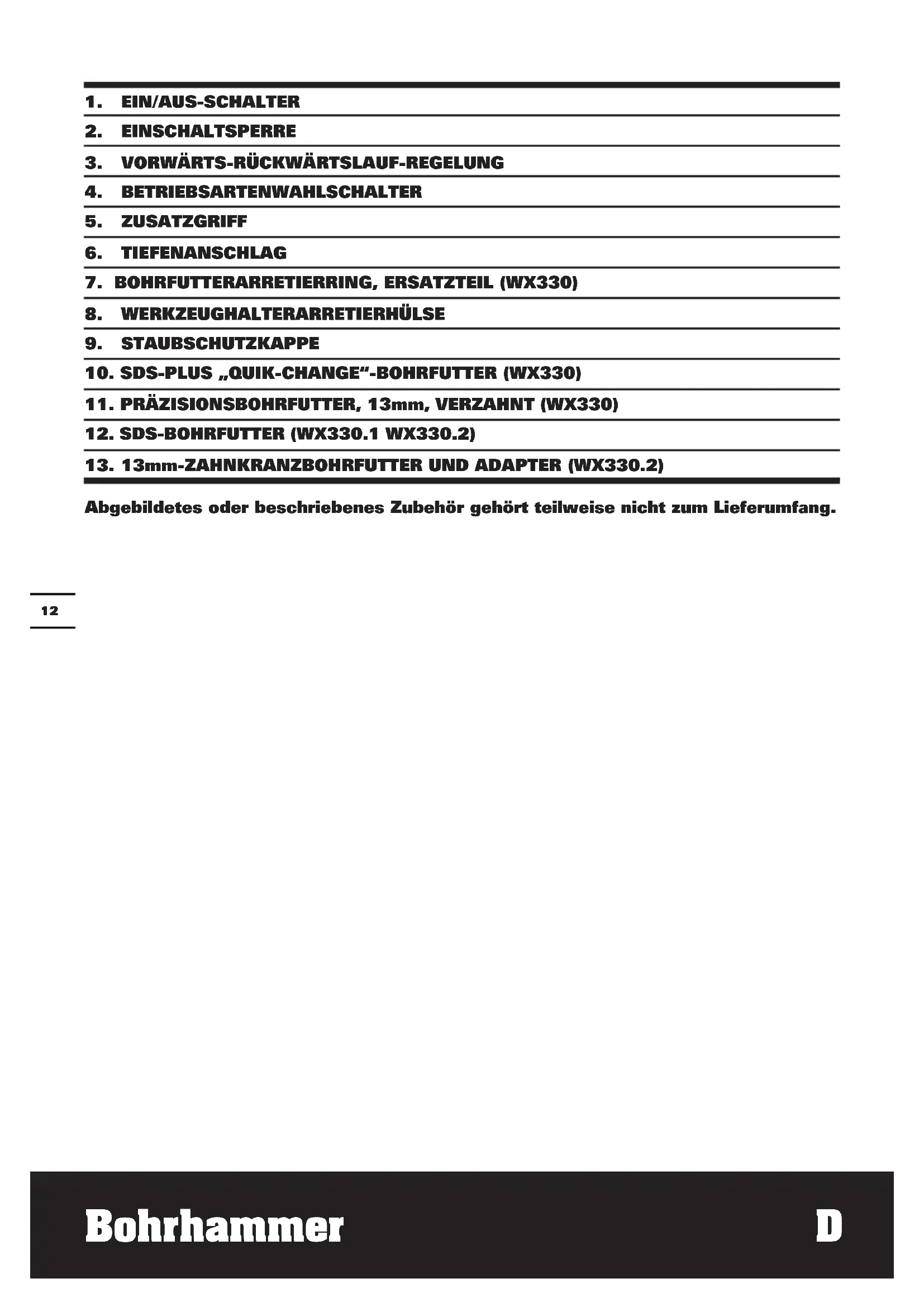 Der Schwingungsgesamtwert kann zum Vergleichen eines Werkzeugs mit einem anderen verwendet werden, ebenso für eine vorläufige Beurteilung von Belastungen.14 Bohrhammer D WARNUNG: Der Vibrationsemissionswert während des tatsächlichen Gebrauchs des Elektrowerkzeugs kann vom angegebenen Wert abweichen, je nachdem, wie das Werkzeug gemäß folgender Beispiele und anderweitiger Verwendungsmöglichkeiten eingesetzt wird: Wie das Werkzeug verwendet wird und Materialen angebohrt werden. Das Werkzeug ist in gutem Zustand und gut gepflegt. Verwendung des richtigen Zubehörs für das Werkzeug und Gewährleistung seiner Schärfe und seines guten Zustands. Die Festigkeit der Handgriffe und ob Antivibrationszubehör verwendet wird. Und ob das verwendete Werkzeug dem Design und diesen Anweisungen entsprechend verwendet wird. Wird dieses Werkzeug nicht anemessen gehandhabt, kann es ein Hand-Arm-Vibra- tionssyndrom erzeugen. WARNUNG: Um genau zu sein, sollte ein Abschätzung des Belastungsgrades aller Arbeitsabschnitte während tatsächlicher Verwendung berücksichtigt werden, z.B. die Zeiten, wenn das Werkzeug ausgeschaltet ist, und wenn es sich im Leerlauf befindet und eigentlich nicht eingesetzt wird. Auf diese Weise kann der Belastungsgrad während der gesamten Arbeitszeit wesentlich gemindert werden. Minimieren Sie Ihr Risiko, dem Sie bei Vibrationen ausgesetzt sind. Verwenden Sie IMMER scharfe Meissel, Bohrer und Sägeblätter. Pflegen Sie dieses Werkzeug diesen Anweisungen entsprechend und achten Sie auf eine gute Einfettung (wo erforderlich). Bei regelmäßiger Verwendung dieses Werkzeugs sollten Sie in Antivibrationszubehör investieren. Vermeiden Sie den Einsatz von Werkzeugen bei Temperaturen von 10ºC oder darunter. Machen Sie einen Arbeitsplan, um die Verwendung von hochvibrierenden Werkzeugen auf mehrere Tage zu verteilen. ZUBEHÖRTEILE WX330 WX330.1 WX330.2 Zusatzhandgriff 1 1 1 Tiefenanschlag 1 1 1 SDS plus-Bohrer 3 3 3 Flachmeißel 1 1 1 Präzisionsbohrfutter, 13 mm, verzahnt, mit Bohrfutterschlüssel 1 / / Bohrfutter mit Adapter und Bohrfutterschlüssel / / 1 Wir empfehlen Ihnen, sämtliche Zubehörteile beim selben Fachhändler zu beziehen, bei dem Sie auch Ihr Elektrowerkzeug gekauft haben. Verwenden Sie nur hochwertige Zubehörteile von namhaften Herstellern. Die Güteklasse muss entsprechend der Anwendung gewählt werden. Weitere Informationen finden Sie auf der Verpackung der Zubehörteile. Auch Ihr Fachhändler berät Sie gerne.15 Bohrhammer D ZUSÄTZLICHE SICHERHEITSHINWEISE
