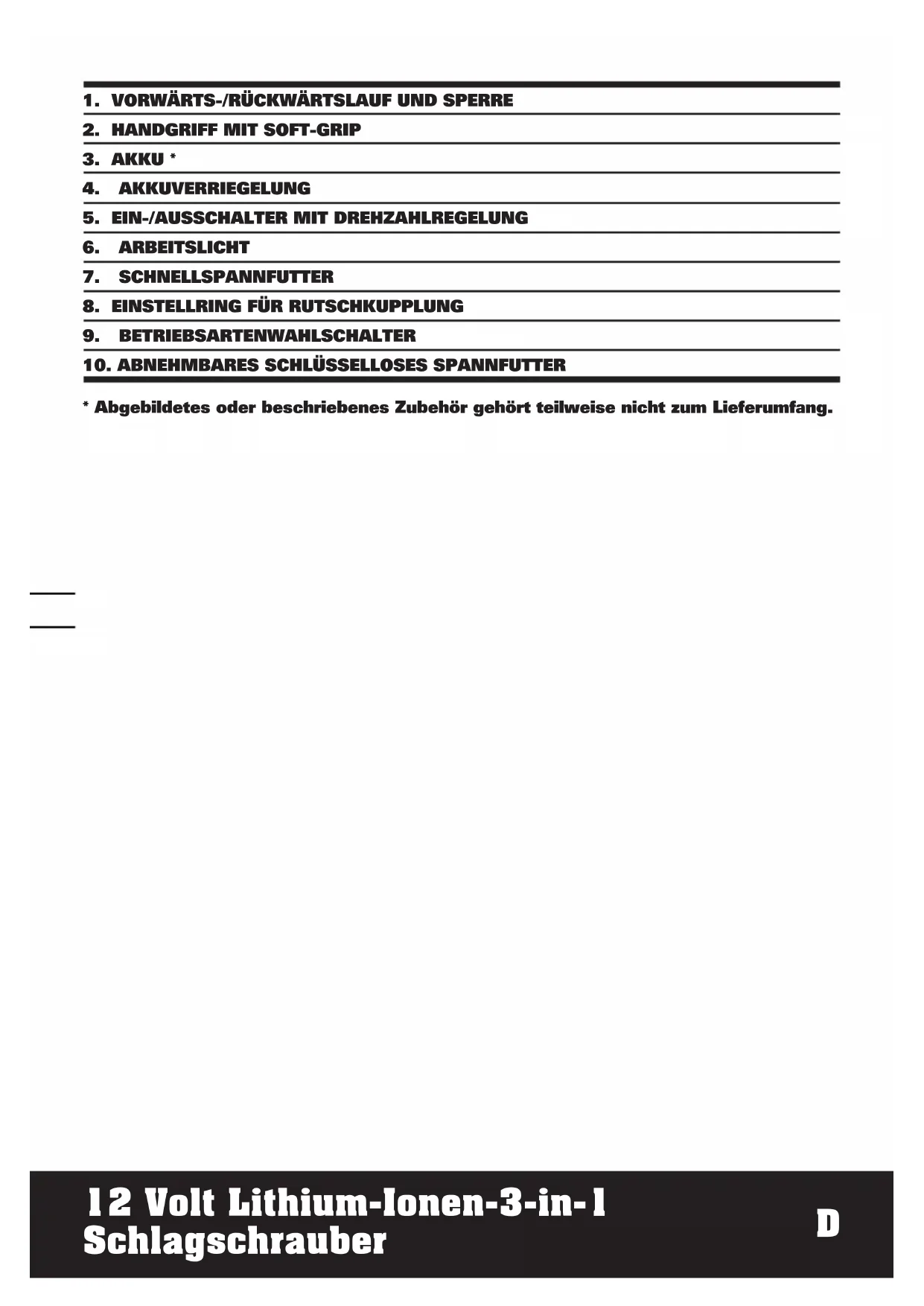 - Abgebildetes oder beschriebenes Zubehör gehört teilweise nicht zum Lieferumfang.D 12 Volt Lithium-Ionen-3-in-1 Schlagschrauber
