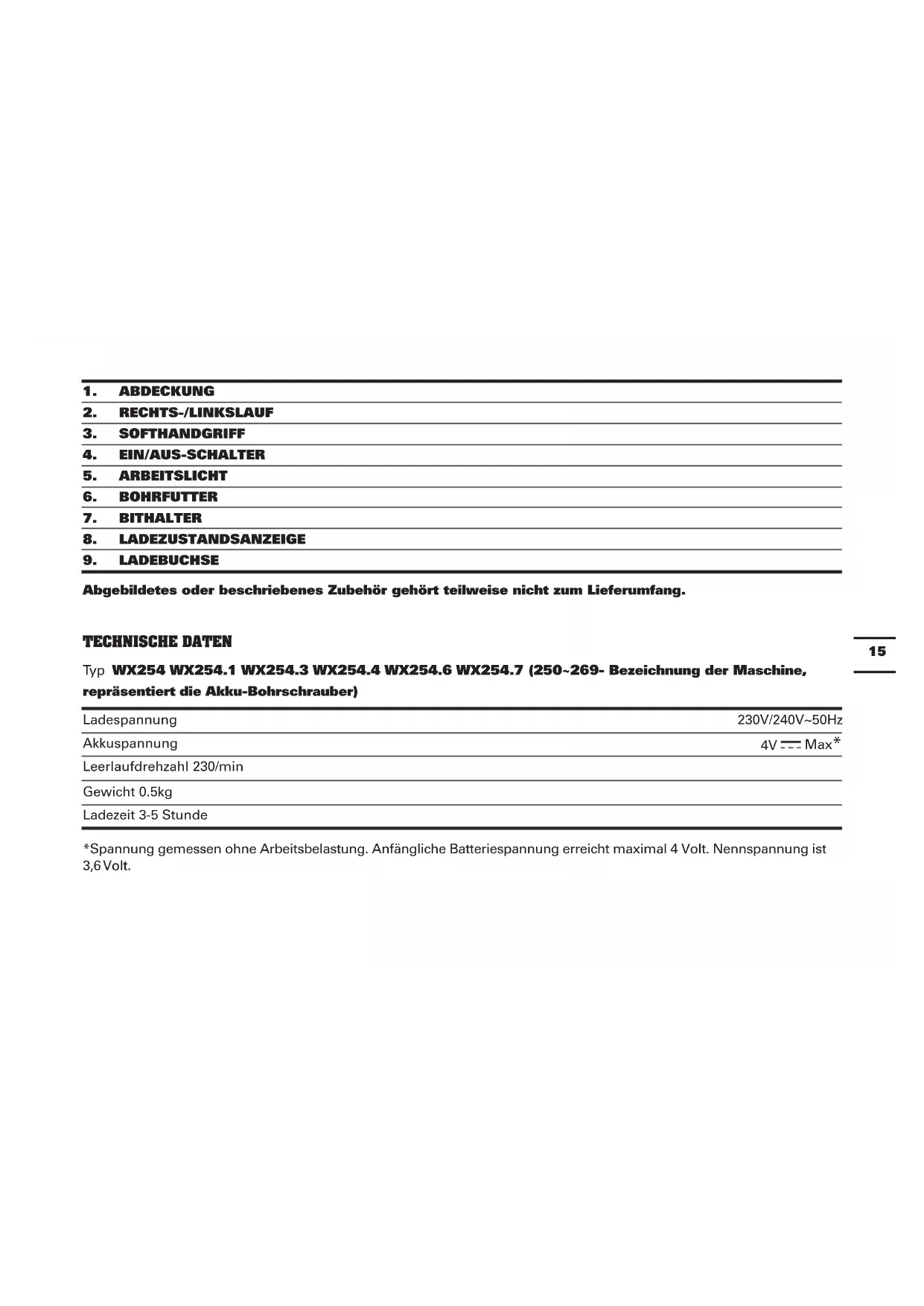Abgebildetes oder beschriebenes Zubehör gehört teilweise nicht zum Lieferumfang. TECHNISCHE DATEN Typ WX254 WX254.1 WX254.3 WX254.4 WX254.6 WX254.7 (250~269- Bezeichnung der Maschine, repräsentiert die Akku-Bohrschrauber) Ladespannung 230V/240V~50Hz Akkuspannung