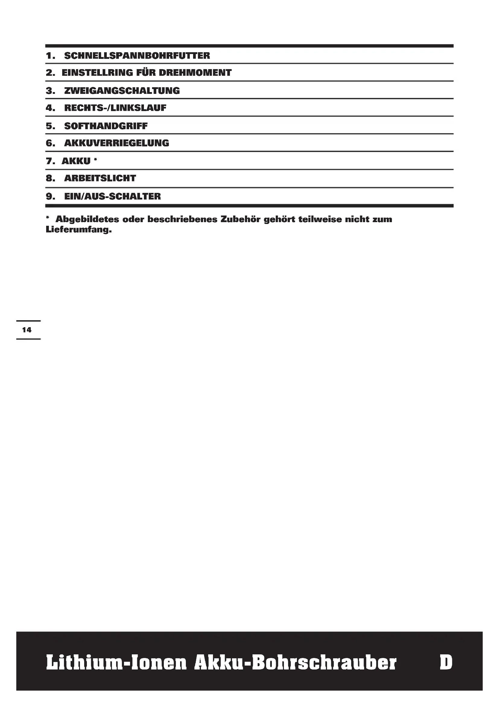 - Abgebildetes oder beschriebenes Zubehör gehört teilweise nicht zum Lieferumfang.15 Lithium-Ionen Akku-Bohrschrauber
