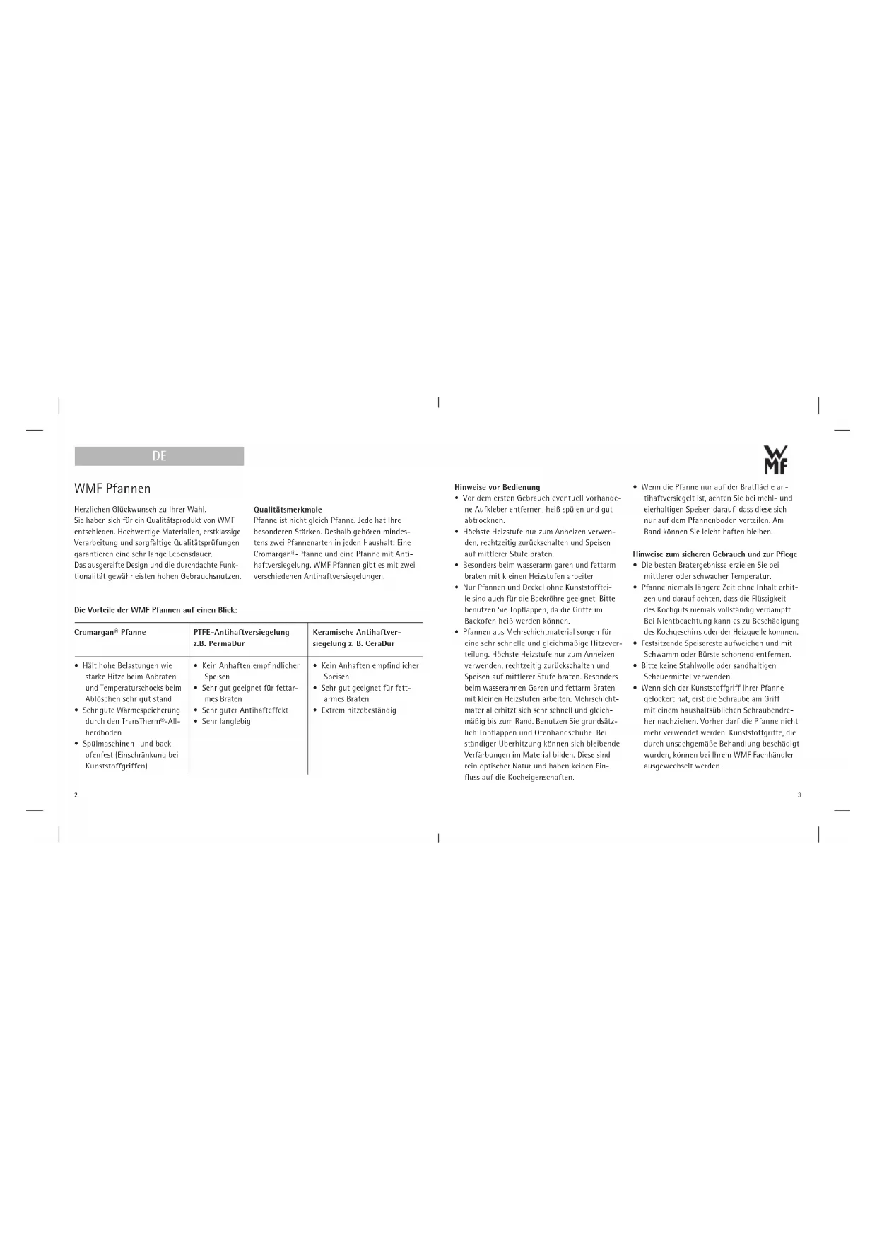 WMF PfannenWMF Pfannen Herzlichen Glückwunsch zu Ihrer Wahl. Sie haben sich für ein Qualitätsprodukt von WMF entschieden. Hochwertige Materialien, erstklassige Verarbeitung und sorgfältige Qualitätsprüfungen garantieren eine sehr lange Lebensdauer. Das ausgereifte Design und die durchdachte Funk- tionalität gewährleisten hohen Gebrauchsnutzen. Die Vorteile der WMF Pfannen auf einen Blick: Qualitätsmerkmale Pfanne ist nicht gleich Pfanne. Jede hat Ihre besonderen Stärken. Deshalb gehören mindes- tens zwei Pfannenarten in jeden Haushalt: Eine Cromargan®-Pfanne und eine Pfanne mit Anti- haftversiegelung. WMF Pfannen gibt es mit zwei verschiedenen Antihaftversiegelungen. Hinweise vor Bedienung