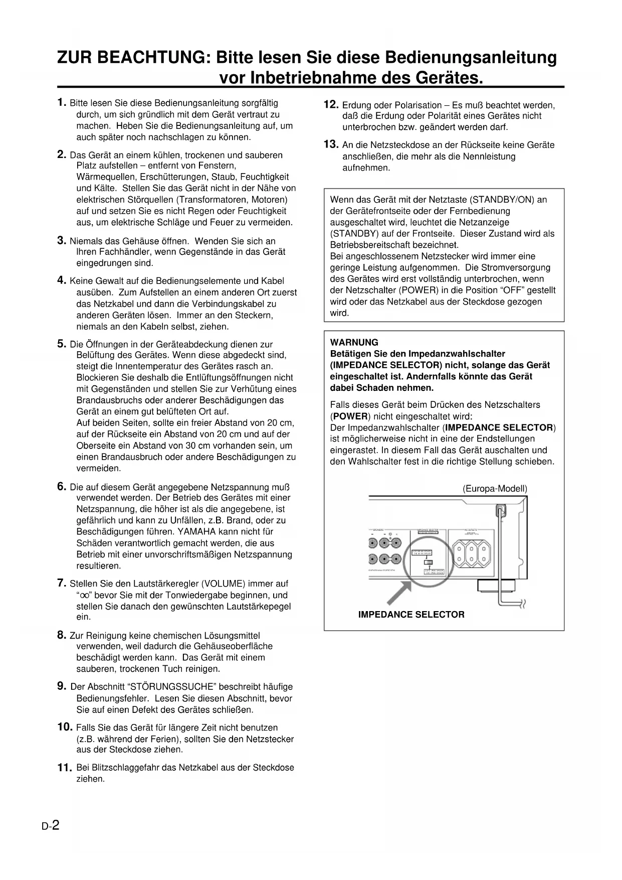 verwendet werden. Der Betrieb des Gerätes mit einer Netzspannung, die höher ist als die angegebene, ist gefährlich und kann zu Unfällen, z.B. Brand, oder zu Beschädigungen führen. YAMAHA kann nicht für Schäden verantwortlich gemacht werden, die aus Betrieb mit einer unvorschriftsmäßigen Netzspannung resultieren.