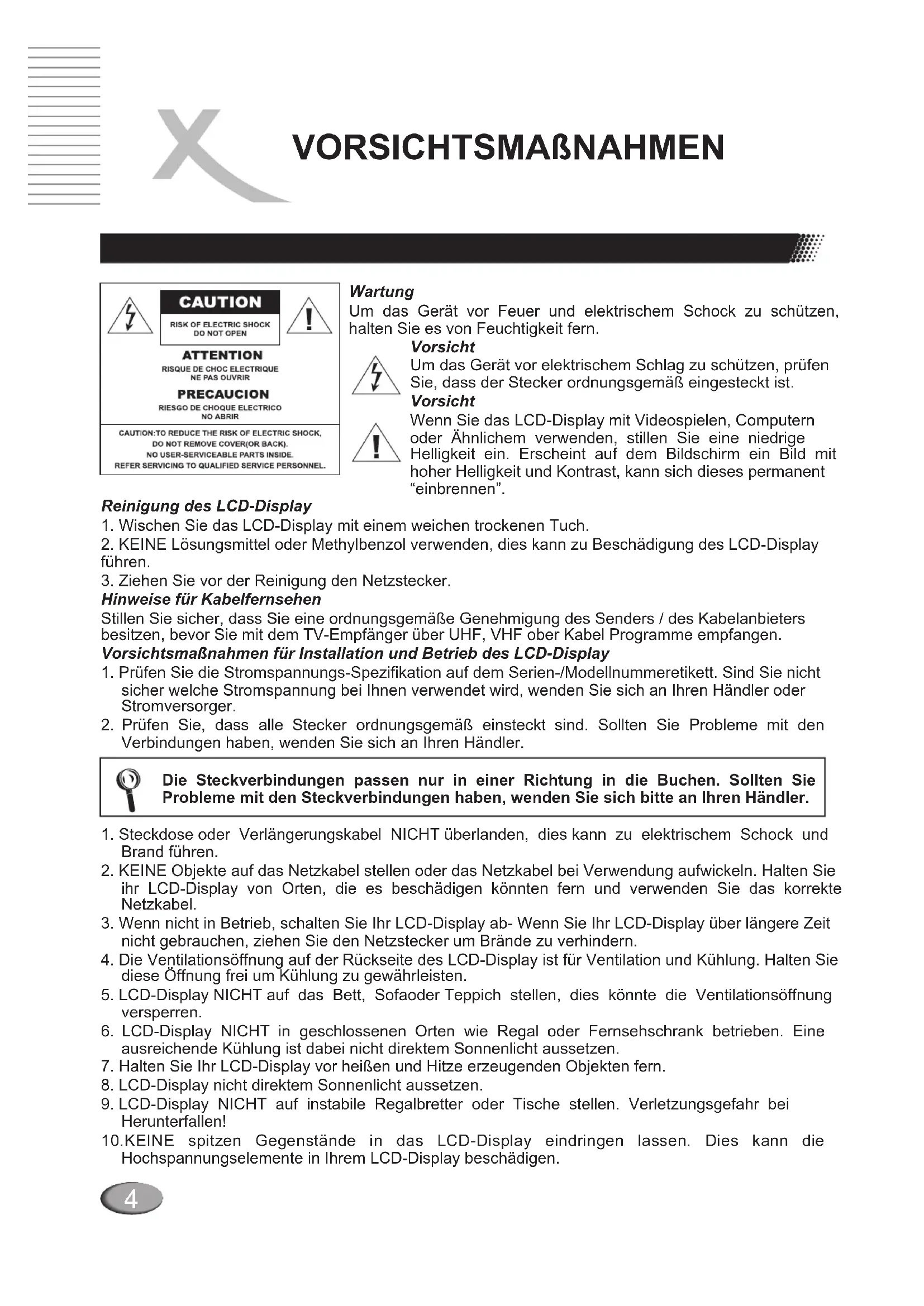 Hinweise für Kabelfernsehen Stillen Sie sicher, dass Sie eine ordnungsgemäße Genehmigung des Senders / des Kabelanbieters besitzen, bevor Sie mit dem TV-Empfänger über UHF, VHF ober Kabel Programme empfangen. Vorsichtsmaßnahmen für Installation und Betrieb des LCD-Display