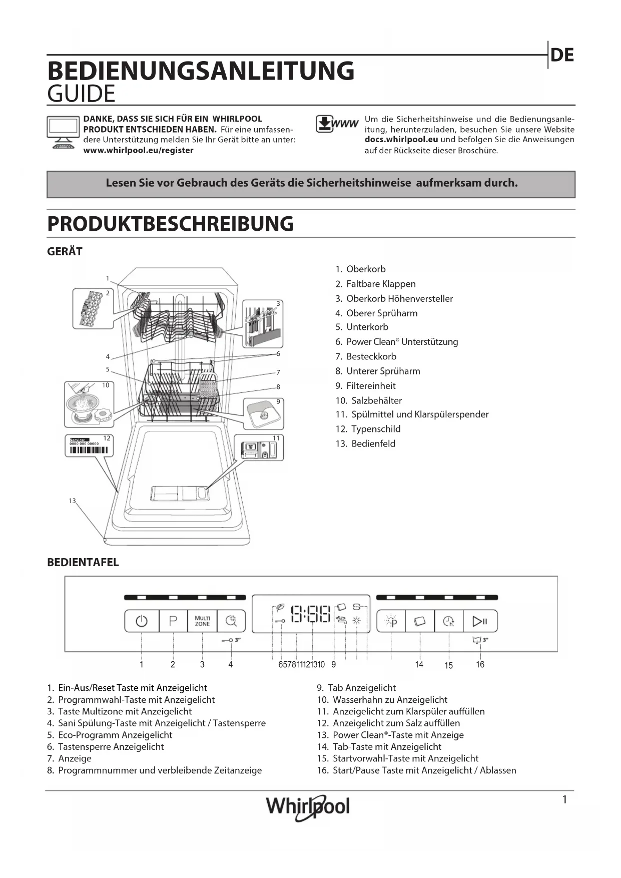 GERÄT PRODUKTBESCHREIBUNG BEDIENUNGSANLEITUNG GUIDE 1. Oberkorb2. Faltbare Klappen3. Oberkorb Höhenversteller4. Oberer Sprüharm5. Unterkorb6. Power Clean® Unterstützung7. Besteckkorb8. Unterer Sprüharm9. Filtereinheit10. Salzbehälter11. Spülmittel und Klarspülerspender12. Typenschild13. Bedienfeld1. Ein-Aus/Reset Taste mit Anzeigelicht2. Programmwahl-Taste mit Anzeigelicht3. Taste Multizone mit Anzeigelicht4. Sani Spülung-Taste mit Anzeigelicht / Tastensperre5. Eco-Programm Anzeigelicht6. Tastensperre Anzeigelicht7. Anzeige8. Programmnummer und verbleibende Zeitanzeige9. Tab Anzeigelicht 10. Wasserhahn zu Anzeigelicht11. Anzeigelicht zum Klarspüler auüllen12. Anzeigelicht zum Salz auüllen13. Power Clean®-Taste mit Anzeige14. Tab-Taste mit Anzeigelicht15. Startvorwahl-Taste mit Anzeigelicht16. Start/Pause Taste mit Anzeigelicht / Ablassen BEDIENTAFEL