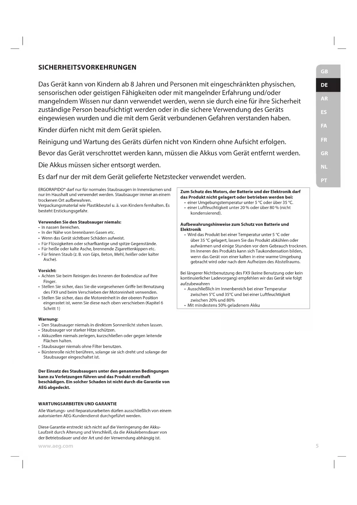 Alle Wartungs- und Reparaturarbeiten dürfen ausschließlich von einem autorisierten AEG-Kundendienst durchgeführt werden. Diese Garantie erstreckt sich nicht auf die Verringerung der Akku- Laufzeit durch Alterung und Verschleiß, da die Akkulebensdauer von der Betriebsdauer und der Art und der Verwendung abhängig ist.PT