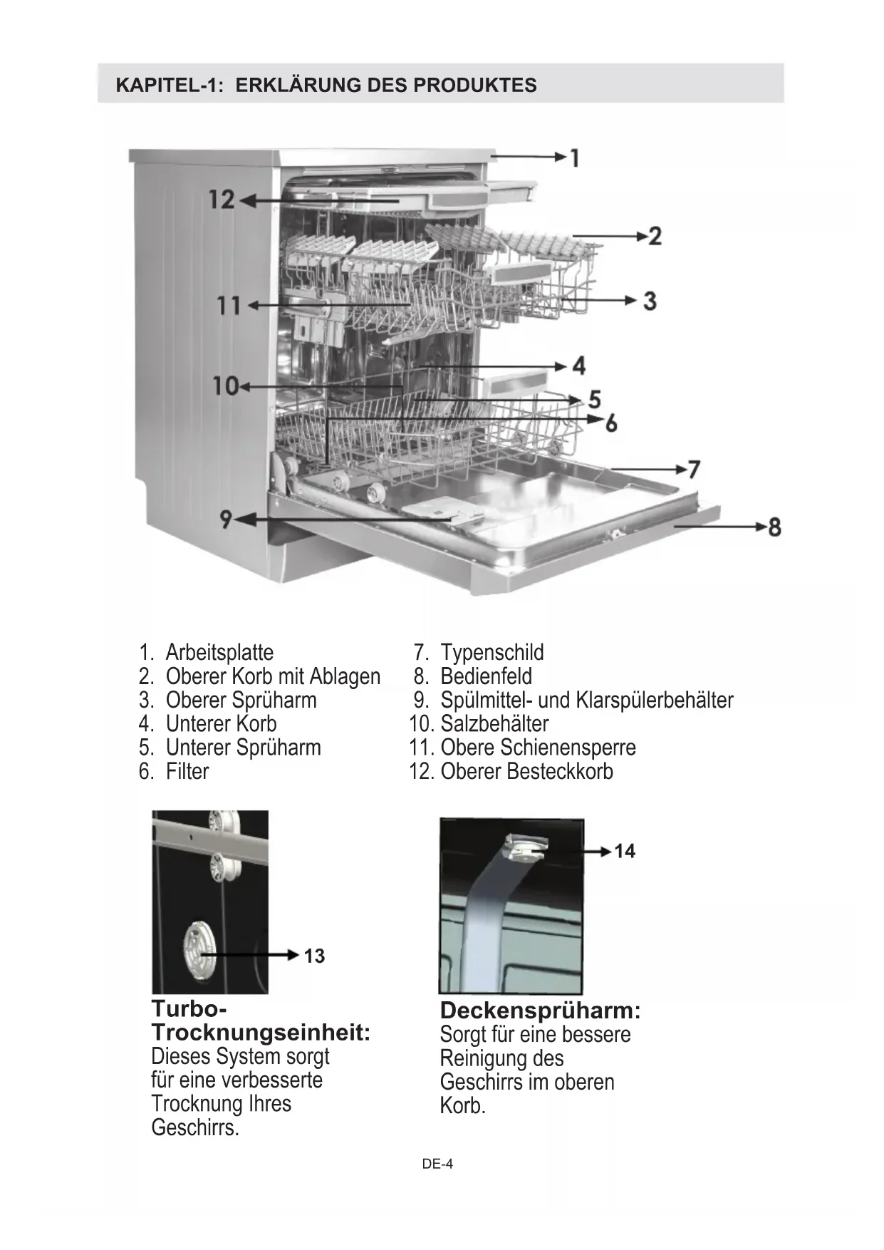 Turbo- Trocknungseinheit: Dieses System sorgt für eine verbesserte Trocknung Ihres Geschirrs. Deckensprüharm: Sorgt für eine bessere Reinigung des Geschirrs im oberen Korb.