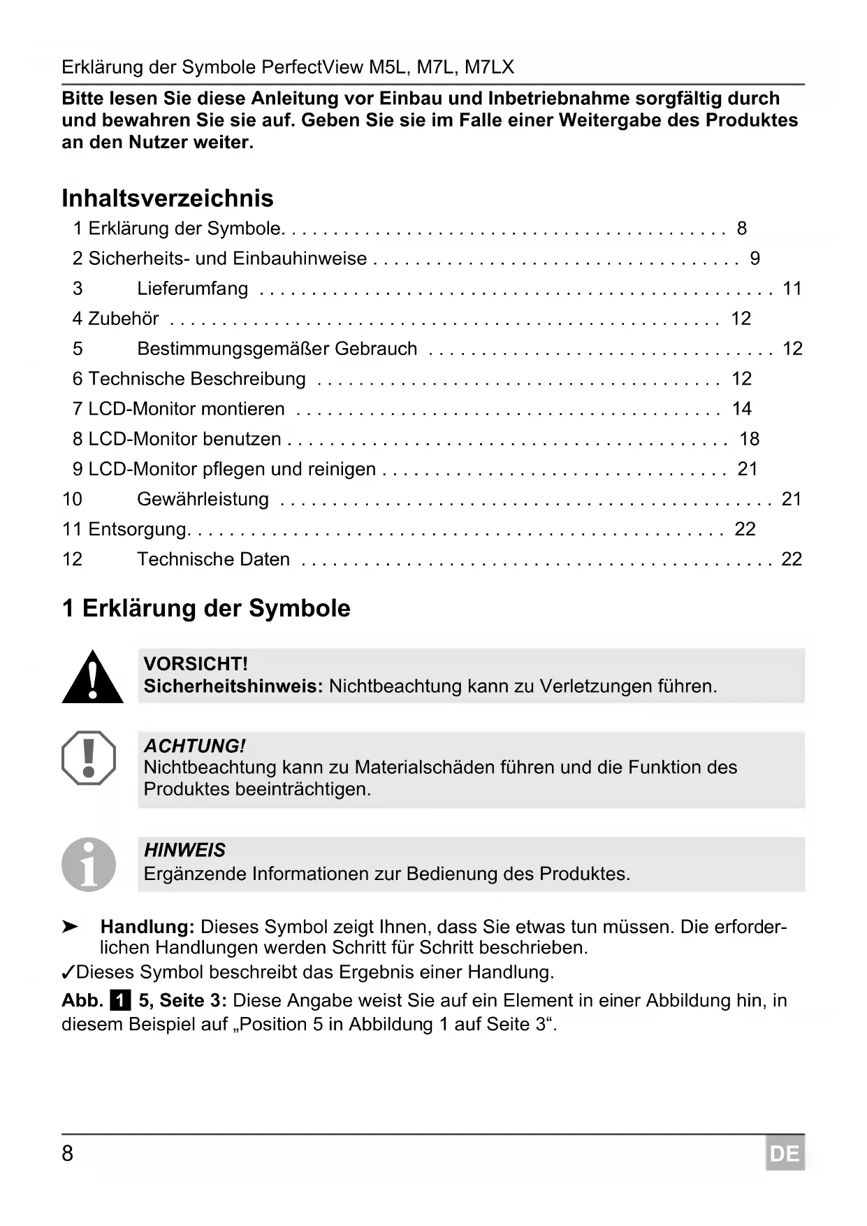 ➤ Handlung: Dieses Symbol zeigt Ihnen, dass Sie etwas tun müssen. Die erforder- lichen Handlungen werden Schritt für Schritt beschrieben. ✓ Dieses Symbol beschreibt das Ergebnis einer Handlung. Abb. 1 5, Seite 3: Diese Angabe weist Sie auf ein Element in einer Abbildung hin, in diesem Beispiel auf „Position 5 in Abbildung 1 auf Seite 3“. VORSICHT! Sicherheitshinweis: Nichtbeachtung kann zu Verletzungen führen. ACHTUNG! Nichtbeachtung kann zu Materialschäden führen und die Funktion des Produktes beeinträchtigen. HINWEIS Ergänzende Informationen zur Bedienung des Produktes.PerfectView M5L, M7L, M7LX Sicherheits- und Einbauhinweise