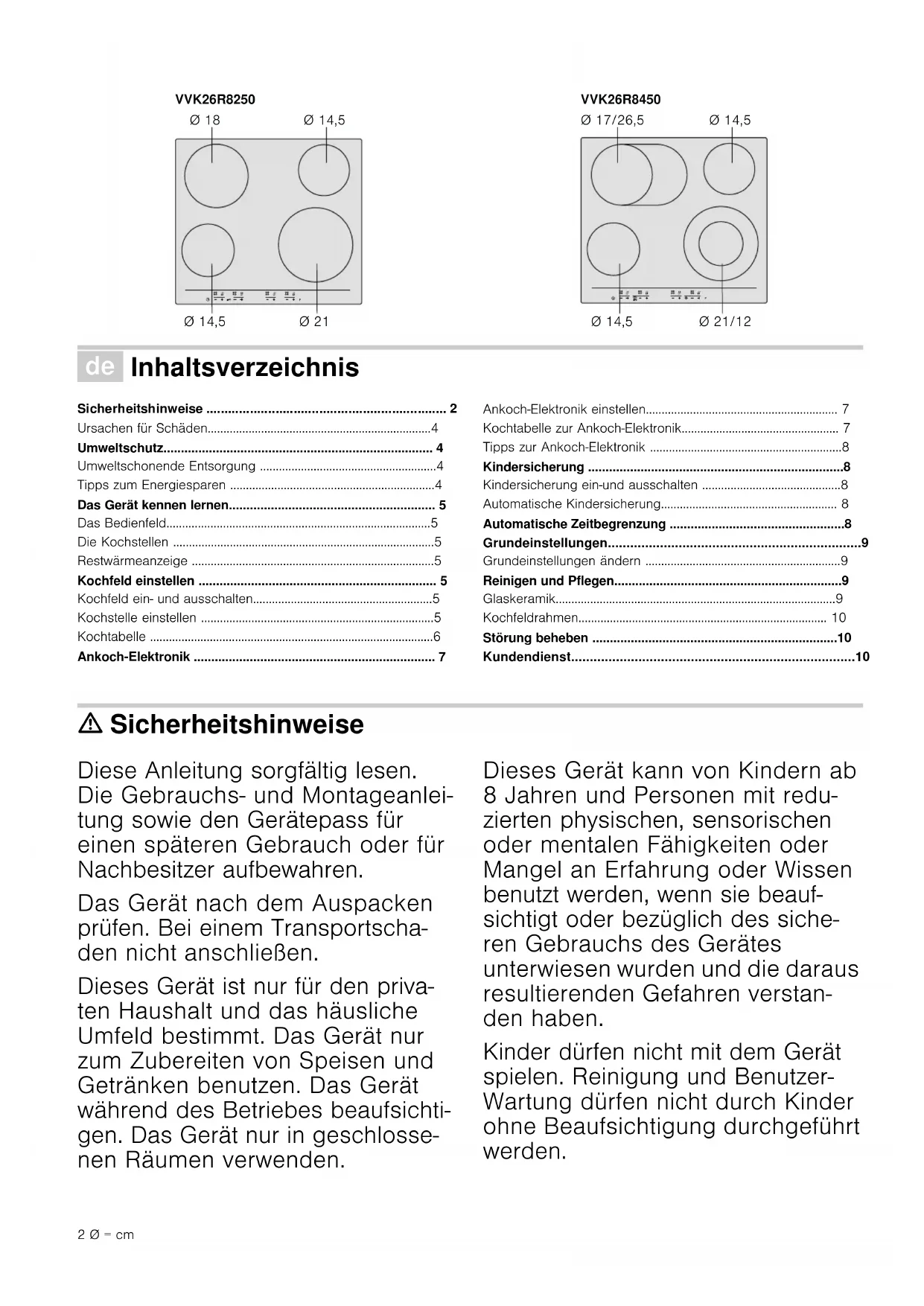 - Kochfeld Table de cuisson Hob Kookplaat2 Ø = cm Ø Inhaltsverzeichnis [de]Gebrauchsanleitung Sicherheitshinweise p. 2