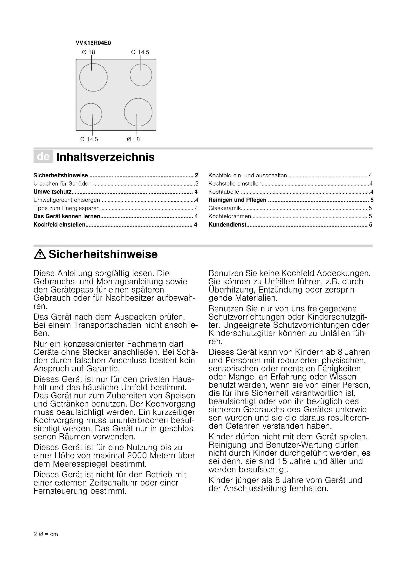 - Kochfeld Table de cuisson Hob Kookplaat2 Ø = cm Ø Inhaltsverzeichnis [de]Gebrauchsanleitung Sicherheitshinweise p. 2