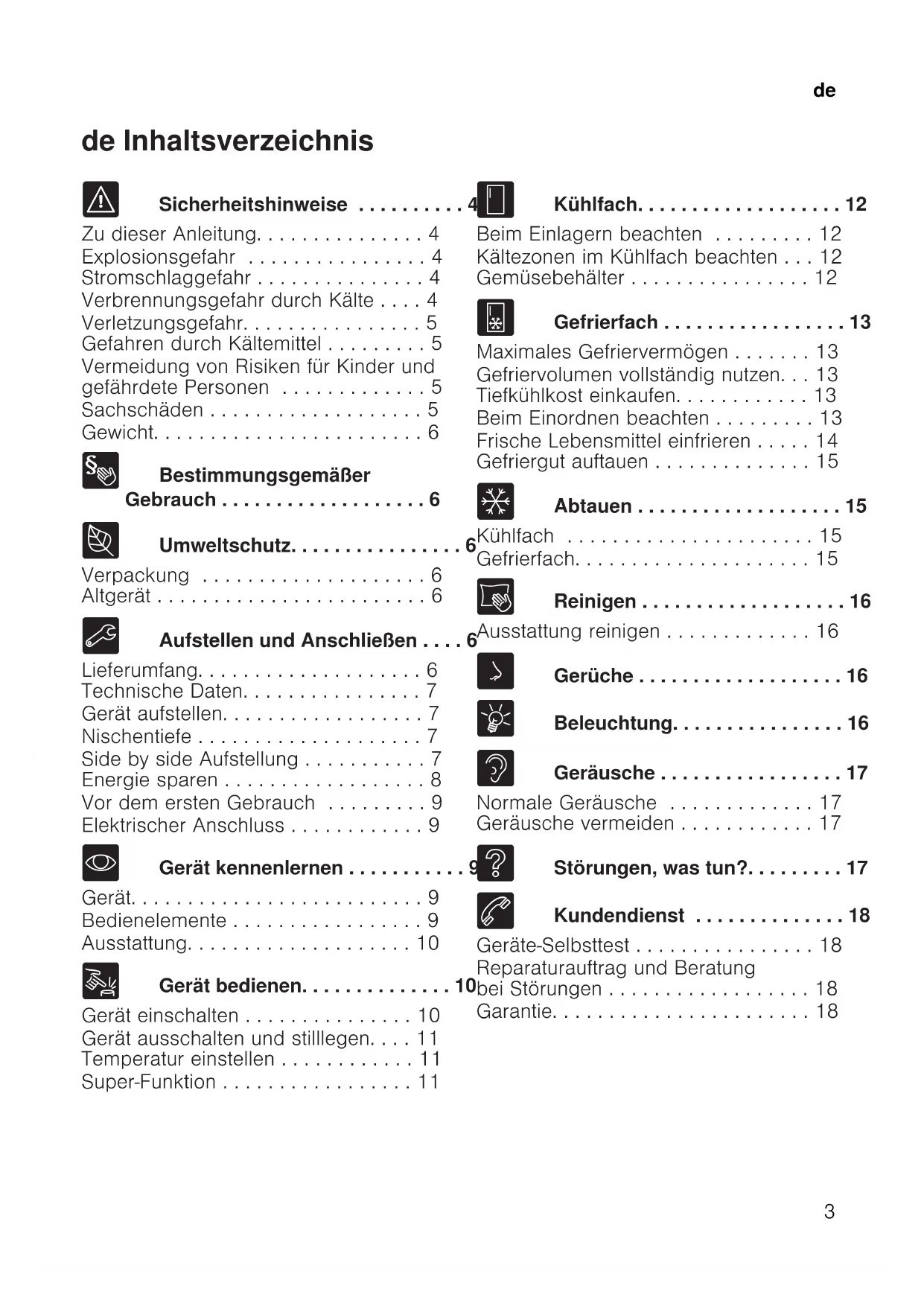 - Gerät kennenlernen . . . . . . . . . . . 9 Gerät. . . . . . . . . . . . . . . . . . . . . . . . . . 9 Bedienelemente . . . . . . . . . . . . . . . . . 9 Ausstattung. . . . . . . . . . . . . . . . . . . . 10 1 Gerät bedienen. . . . . . . . . . . . . . 10 Gerät einschalten . . . . . . . . . . . . . . . 10 Gerät ausschalten und stilllegen. . . . 11 Temperatur einstellen . . . . . . . . . . . . 11 Super-Funktion . . . . . . . . . . . . . . . . . 11 U Kühlfach. . . . . . . . . . . . . . . . . . . 12 Beim Einlagern beachten . . . . . . . . . 12 Kältezonen im Kühlfach beachten . . . 12 Gemüsebehälter . . . . . . . . . . . . . . . . 12 W Gefrierfach . . . . . . . . . . . . . . . . . 13 Maximales Gefriervermögen . . . . . . . 13 Gefriervolumen vollständig nutzen. . . 13 Tiefkühlkost einkaufen. . . . . . . . . . . . 13 Beim Einordnen beachten . . . . . . . . . 13 Frische Lebensmittel einfrieren . . . . . 14 Gefriergut auftauen . . . . . . . . . . . . . . 15 = Abtauen . . . . . . . . . . . . . . . . . . . 15 Kühlfach . . . . . . . . . . . . . . . . . . . . . . 15 Gefrierfach. . . . . . . . . . . . . . . . . . . . . 15 D Reinigen . . . . . . . . . . . . . . . . . . . 16 Ausstattung reinigen . . . . . . . . . . . . . 16 l Gerüche . . . . . . . . . . . . . . . . . . . 16 9 Beleuchtung. . . . . . . . . . . . . . . . 16 > Geräusche . . . . . . . . . . . . . . . . . 17 Normale Geräusche . . . . . . . . . . . . . 17 Geräusche vermeiden . . . . . . . . . . . . 17 3 Störungen, was tun?. . . . . . . . . 17 4 Kundendienst . . . . . . . . . . . . . . 18 Geräte-Selbsttest . . . . . . . . . . . . . . . . 18 Reparaturauftrag und Beratung bei Störungen . . . . . . . . . . . . . . . . . . 18 Garantie. . . . . . . . . . . . . . . . . . . . . . . 18de Sicherheitshinweise