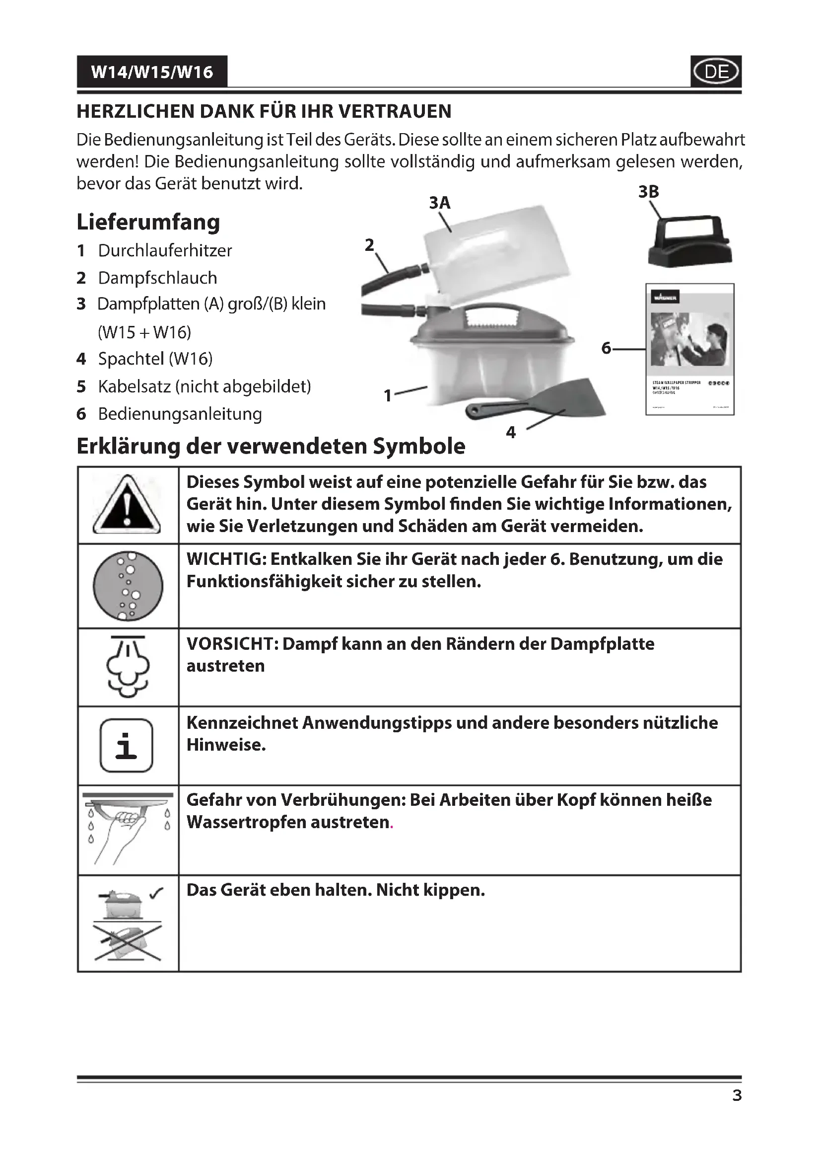 Die Bedienungsanleitung ist Teil des Geräts. Diese sollte an einem sicheren Platz aufbewahrt werden! Die Bedienungsanleitung sollte vollständig und aufmerksam gelesen werden, bevor das Gerät benutzt wird. Lieferumfang 1 Durchlauferhitzer 2 Dampfschlauch 3 Dampfplatten (A) groß/(B) klein (W15 + W16) 4 Spachtel (W16) 5 Kabelsatz (nicht abgebildet) 6 Bedienungsanleitung Erklärung der verwendeten Symbole Dieses Symbol weist auf eine potenzielle Gefahr für Sie bzw das Gerät hin Unter diesem Symbol nden Sie wichtige Informationen, wie Sie Verletzungen und Schäden am Gerät vermeiden WICHTIG: Entkalken Sie ihr Gerät nach jeder 6 Benutzung, um die Funktionsfähigkeit sicher zu stellen VORSICHT: Dampf kann an den Rändern der Dampfplatte austreten