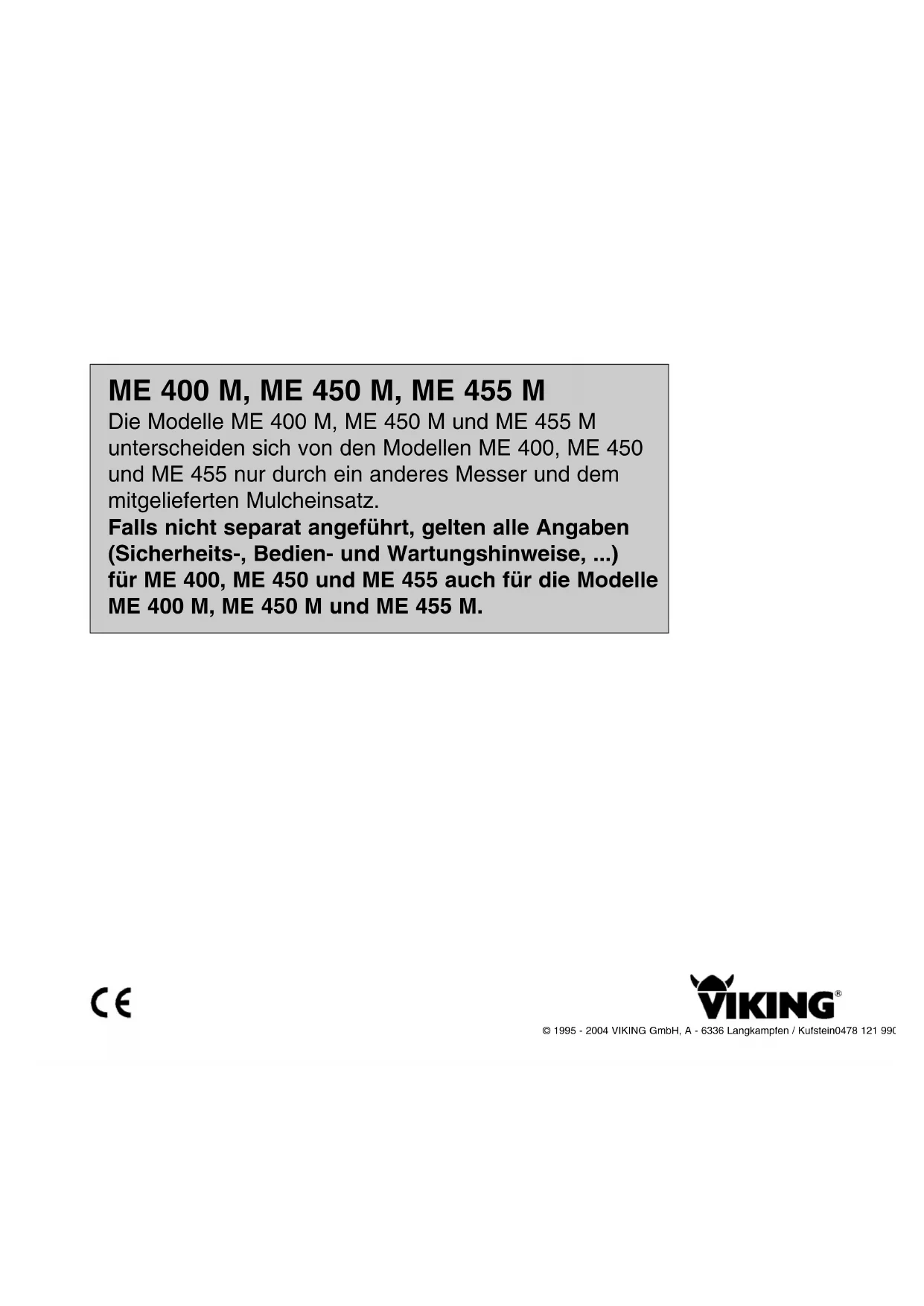 PT© 1995 - 2004 VIKING GmbH, A - 6336 Langkampfen / Kufstein0478 121 9900. B. M3. B4. Mei. Printed in Germany ME 400 M, ME 450 M, ME 455 M Die Modelle ME 400 M, ME 450 M und ME 455 M unterscheiden sich von den Modellen ME 400, ME 450 und ME 455 nur durch ein anderes Messer und dem mitgelieferten Mulcheinsatz. Falls nicht separat angeführt, gelten alle Angaben (Sicherheits-, Bedien- und Wartungshinweise, ...) für ME 400, ME 450 und ME 455 auch für die Modelle ME 400 M, ME 450 M und ME 455 M.1 0478 121 9900 B - DE