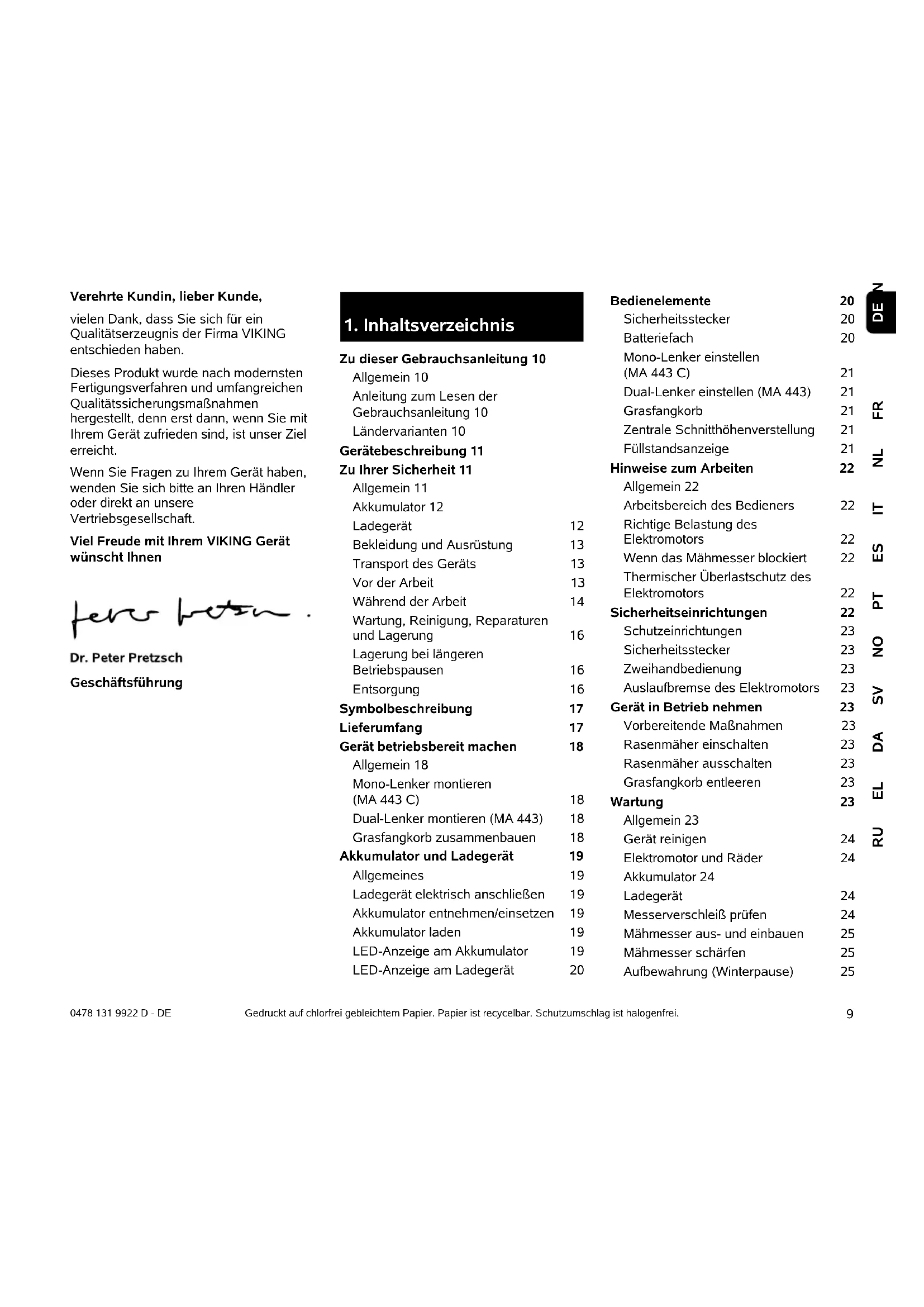 FRNLITESPTNOSVDAELRU 0478 131 9922 D - DE Verehrte Kundin, lieber Kunde, vielen Dank, dass Sie sich für ein Qualitätserzeugnis der Firma VIKING entschieden haben. Dieses Produkt wurde nach modernsten Fertigungsverfahren und umfangreichen Qualitätssicherungsmaßnahmen hergestellt, denn erst dann, wenn Sie mit Ihrem Gerät zufrieden sind, ist unser Ziel erreicht. Wenn Sie Fragen zu Ihrem Gerät haben, wenden Sie sich bitte an Ihren Händler oder direkt an unsere Vertriebsgesellschaft. Viel Freude mit Ihrem VIKING Gerät wünscht Ihnen Geschäftsführung Gedruckt auf chlorfrei gebleichtem Papier. Papier ist recycelbar. Schutzumschlag ist halogenfrei.