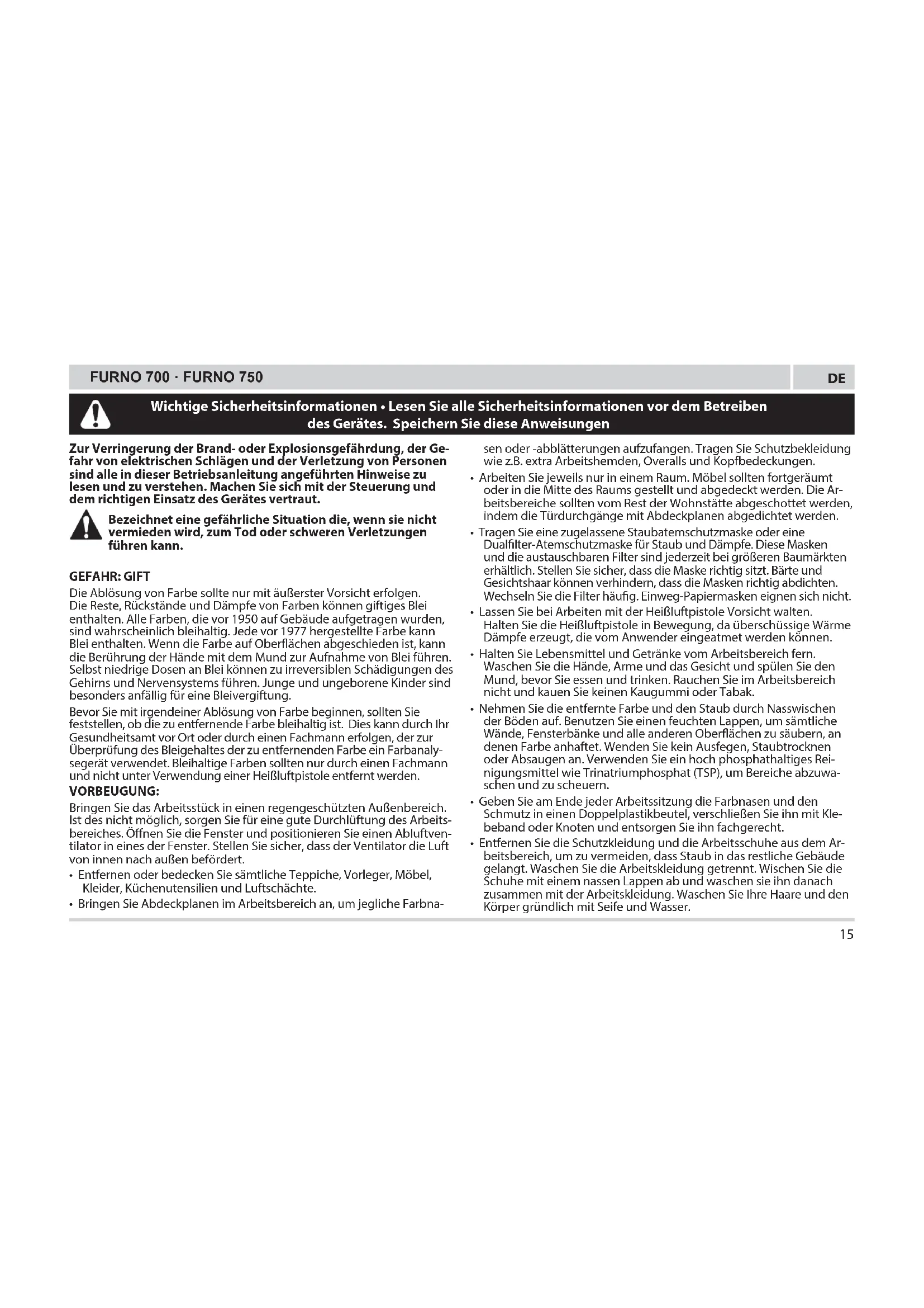 Zur Verringerung der Brand- oder Explosionsgefährdung, der Ge- fahr von elektrischen Schlägen und der Verletzung von Personen sind alle in dieser Betriebsanleitung angeführten Hinweise zu lesen und zu verstehen. Machen Sie sich mit der Steuerung und dem richtigen Einsatz des Gerätes vertraut. Bezeichnet eine gefährliche Situation die, wenn sie nicht vermieden wird, zum Tod oder schweren Verletzungen führen kann. GEFAHR: GIFT Die Ablösung von Farbe sollte nur mit äußerster Vorsicht erfolgen. Die Reste, Rückstände und Dämpfe von Farben können giftiges Blei enthalten. Alle Farben, die vor 1950 auf Gebäude aufgetragen wurden, sind wahrscheinlich bleihaltig. Jede vor 1977 hergestellte Farbe kann Blei enthalten. Wenn die Farbe auf Oberächen abgeschieden ist, kann die Berührung der Hände mit dem Mund zur Aufnahme von Blei führen. Selbst niedrige Dosen an Blei können zu irreversiblen Schädigungen des Gehirns und Nervensystems führen. Junge und ungeborene Kinder sind besonders anfällig für eine Bleivergiftung. Bevor Sie mit irgendeiner Ablösung von Farbe beginnen, sollten Sie feststellen, ob die zu entfernende Farbe bleihaltig ist. Dies kann durch Ihr Gesundheitsamt vor Ort oder durch einen Fachmann erfolgen, der zur Überprüfung des Bleigehaltes der zu entfernenden Farbe ein Farbanaly- segerät verwendet. Bleihaltige Farben sollten nur durch einen Fachmann und nicht unter Verwendung einer Heißluftpistole entfernt werden. VORBEUGUNG: Bringen Sie das Arbeitsstück in einen regengeschützten Außenbereich. Ist des nicht möglich, sorgen Sie für eine gute Durchlüftung des Arbeits- bereiches. Önen Sie die Fenster und positionieren Sie einen Abluftven- tilator in eines der Fenster. Stellen Sie sicher, dass der Ventilator die Luft von innen nach außen befördert.