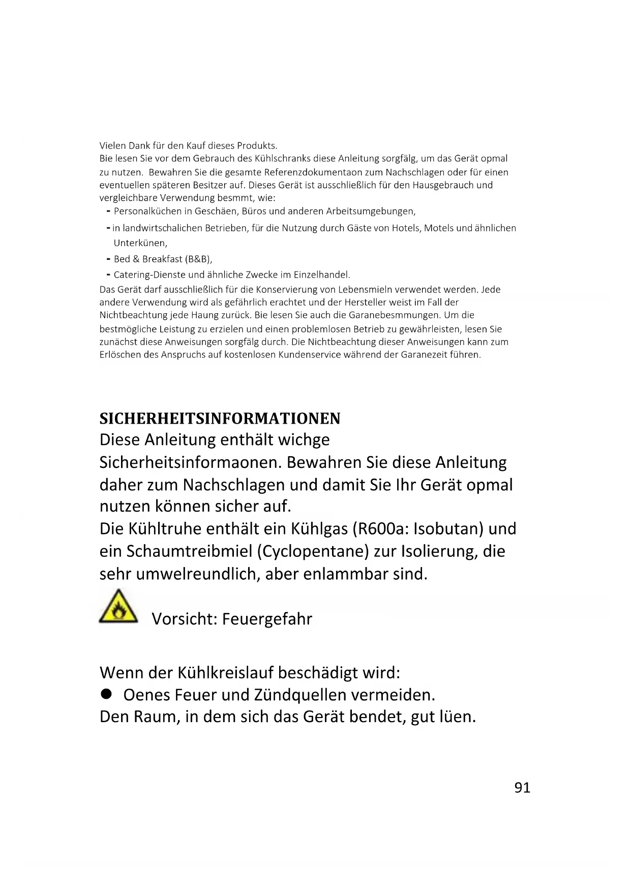 - Keine brennbaren und hoch üchgen Substanzen wie Äther, Benzin, Flüssiggas, Propan, Sprühdosen, Klebstoe, reinen Alkohol usw. in der Kühltruhe auewahren - Explosionsgefahr!