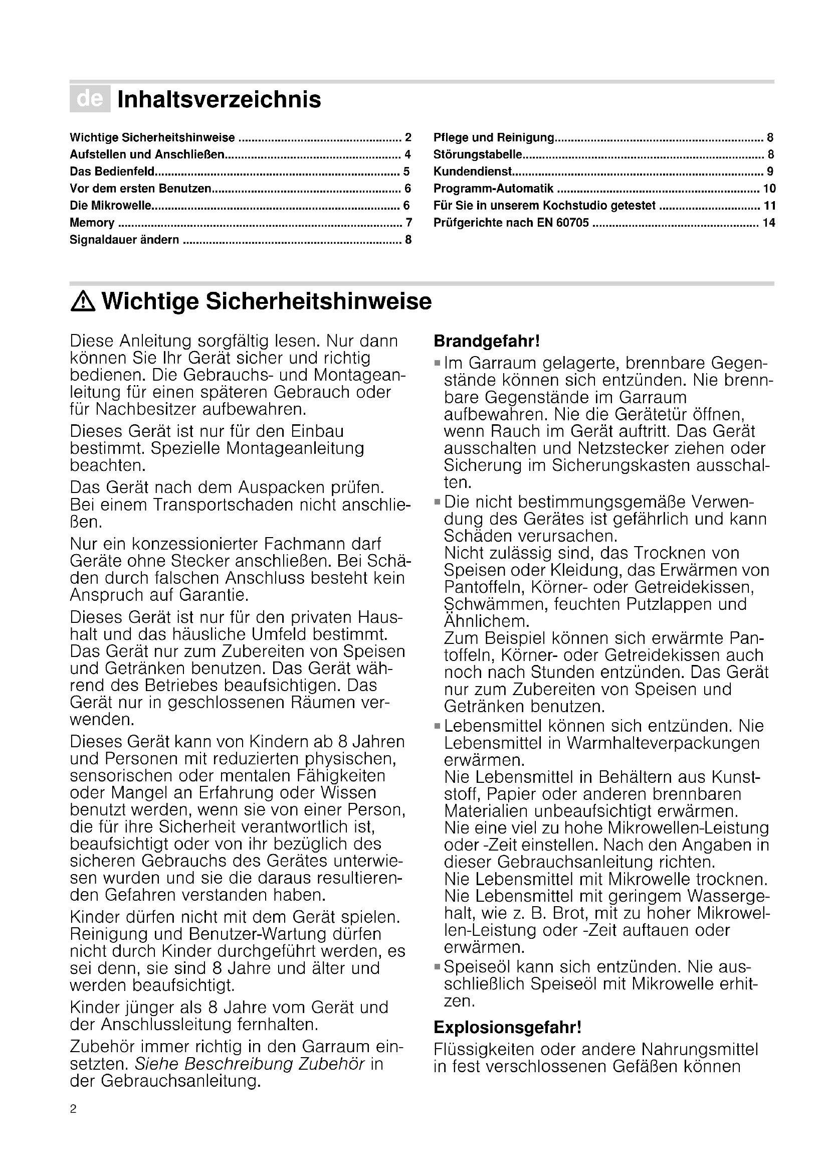- Prüfgerichte nach EN 60705 : Wichtige Sicherheitshinweise Diese Anleitung sorgfältig lesen. Nur dann können Sie Ihr Gerät sicher und richtig bedienen. Die Gebrauchs- und Montagean- leitung für einen späteren Gebrauch oder für Nachbesitzer aufbewahren. Dieses Gerät ist nur für den Einbau bestimmt. Spezielle Montageanleitung beachten. Das Gerät nach dem Auspacken prüfen. Bei einem Transportschaden nicht anschlie- ßen. Nur ein konzessionierter Fachmann darf Geräte ohne Stecker anschließen. Bei Schä- den durch falschen Anschluss besteht kein Anspruch auf Garantie. Dieses Gerät ist nur für den privaten Haus- halt und das häusliche Umfeld bestimmt. Das Gerät nur zum Zubereiten von Speisen und Getränken benutzen. Das Gerät wäh- rend des Betriebes beaufsichtigen. Das Gerät nur in geschlossenen Räumen ver- wenden. Dieses Gerät kann von Kindern ab 8 Jahren und Personen mit reduzierten physischen, sensorischen oder mentalen Fähigkeiten oder Mangel an Erfahrung oder Wissen benutzt werden, wenn sie von einer Person, die für ihre Sicherheit verantwortlich ist, beaufsichtigt oder von ihr bezüglich des sicheren Gebrauchs des Gerätes unterwie- sen wurden und sie die daraus resultieren- den Gefahren verstanden haben. Kinder dürfen nicht mit dem Gerät spielen. Reinigung und Benutzer-Wartung dürfen nicht durch Kinder durchgeführt werden, es sei denn, sie sind 8 Jahre und älter und werden beaufsichtigt. Kinder jünger als 8 Jahre vom Gerät und der Anschlussleitung fernhalten. Zubehör immer richtig in den Garraum ein- setzten. Siehe Beschreibung Zubehör in der Gebrauchsanleitung. Brandgefahr! p. 14