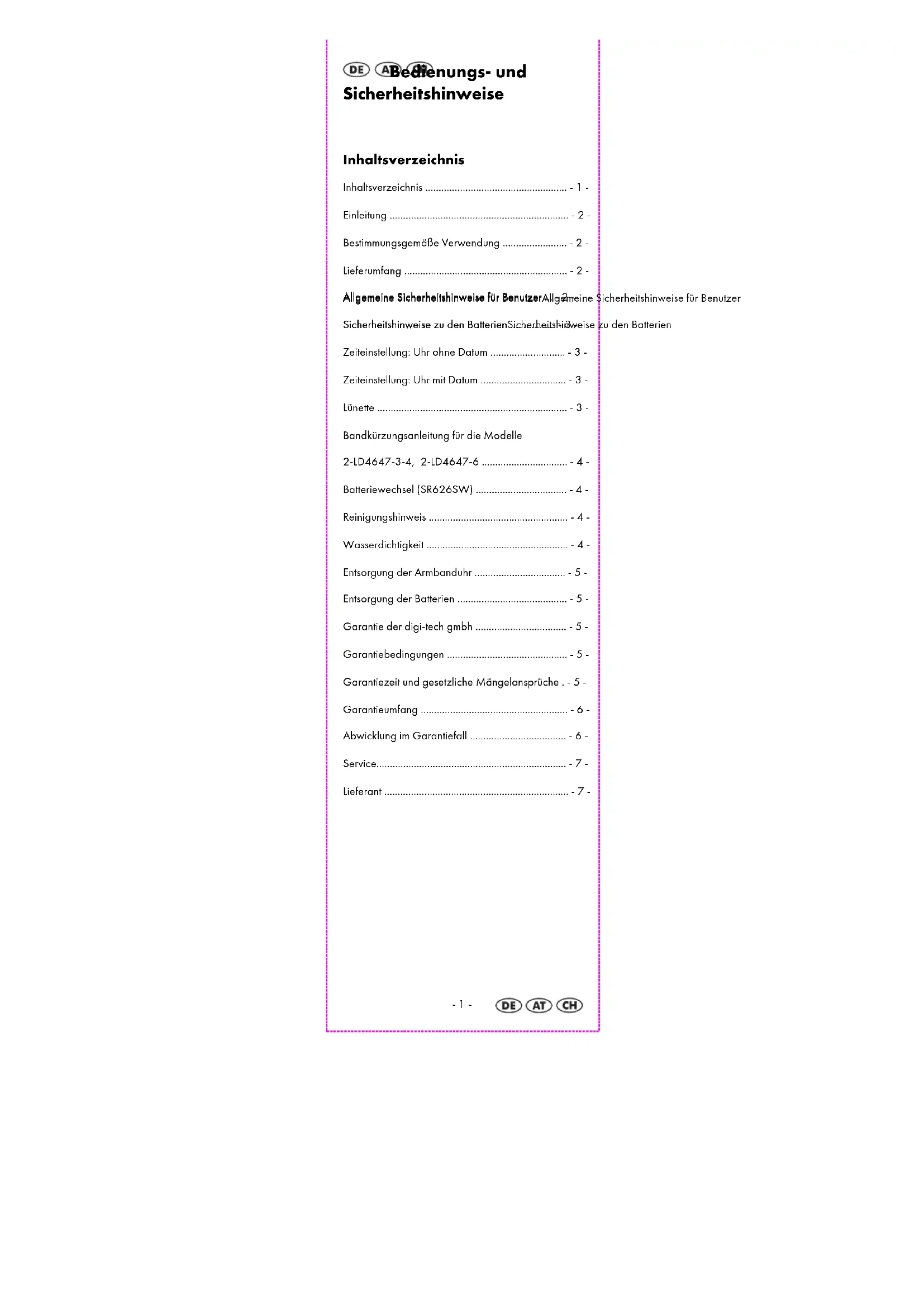 Bedienungs- und Sicherheitshinweise Inhaltsverzeichnis Inhaltsverzeichnis ..................................................... - 1 - Einleitung ................................................................... - 2 - Bestimmungsgemäße Verwendung ........................ - 2 - Lieferumfang ............................................................. - 2 - Allgemeine Sicherheitshinweise für Benutzer Allgemeine Sicherheitshinweise für BenutzerAllgemeine Sicherheitshinweise für Benutzer Allgemeine Sicherheitshinweise für Benutzer ... - 2 - Sicherheitshinweise zu den Batterien Sicherheitshinweise zu den BatterienSicherheitshinweise zu den Batterien Sicherheitshinweise zu den Batterien ................. - 3 - Zeiteinstellung: Uhr ohne Datum ............................ - 3 - Zeiteinstellung: Uhr mit Datum ................................ - 3 - Lünette ....................................................................... - 3 - Bandkürzungsanleitung für die Modelle 2-LD4647-3-4, 2-LD4647-6 ................................ - 4 - Batteriewechsel (SR626SW) .................................. - 4 - Reinigungshinweis .................................................... - 4 - Wasserdichtigkeit ..................................................... - 4 - Entsorgung der Armbanduhr .................................. - 5 - Entsorgung der Batterien ......................................... - 5 - Garantie der digi-tech gmbh .................................. - 5 - Garantiebedingungen ............................................. - 5 - Garantiezeit und gesetzliche Mängelansprüche . - 5 - Garantieumfang ....................................................... - 6 - Abwicklung im Garantiefall .................................... - 6 - Service....................................................................... - 7 - Lieferant ..................................................................... - 7 --