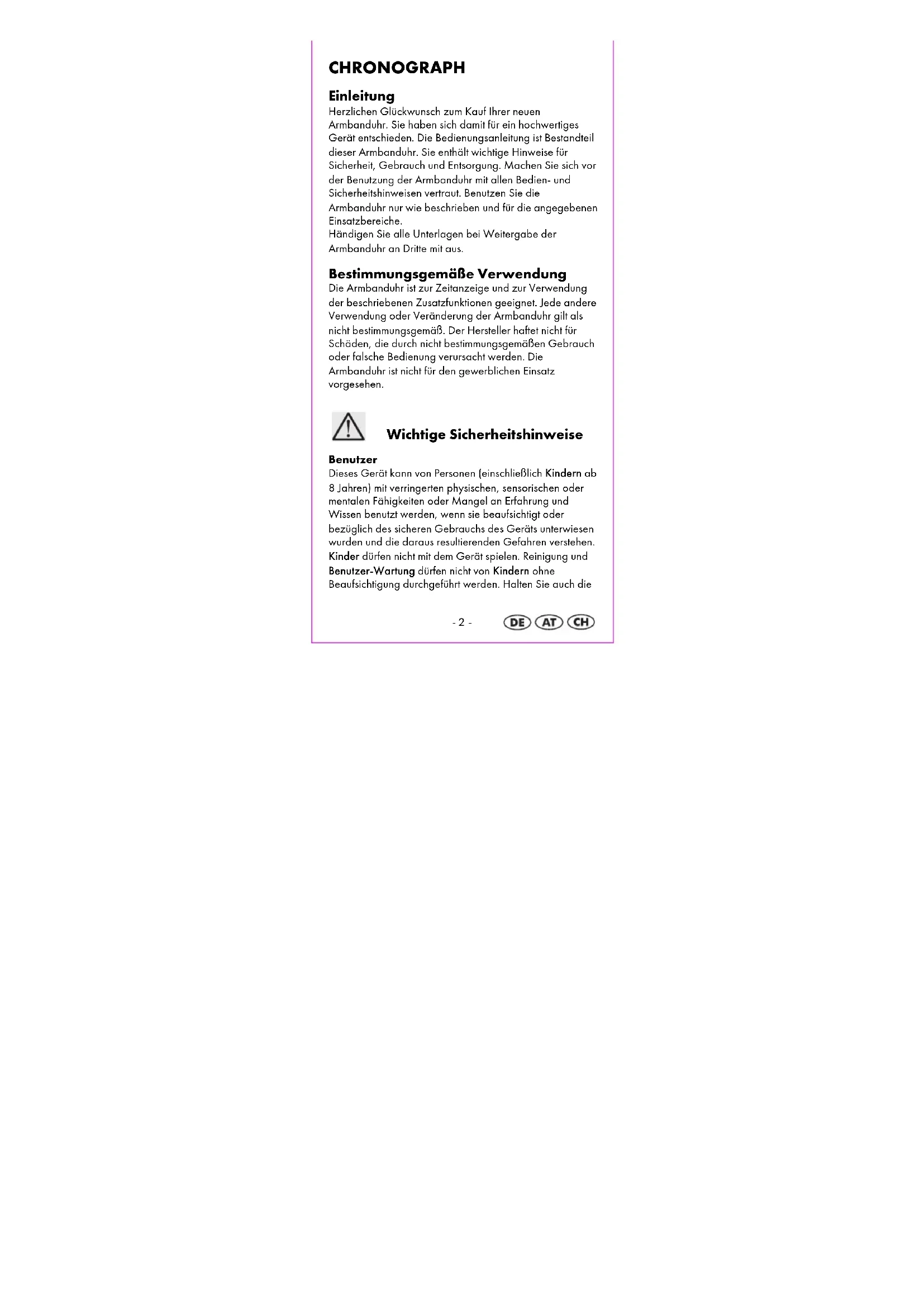 Herzlichen Glückwunsch zum Kauf ihrer neuen Armbanduhr. Sie haben sich damit für ein hochwertiges Gerät entschieden. Die Bedienungsanleitung ist Bestandteil dieser Armbanduhr. Sie enthalt wichtige Hinweise für Sicherheit, Gebrauch und Entsorgung. Machen Sie sich vor der Benutzung der Armbanduhr mit allen Bedien- und Sicherheitshinweisen vertraut. Benutzen Sie die Armbanduhr nur wie beschrieben und für die angegebenen Einsatzbereiche. Handigen Sie alle Unterlagen bei Weitergabe der Armbanduhr an Dritte mit aus.