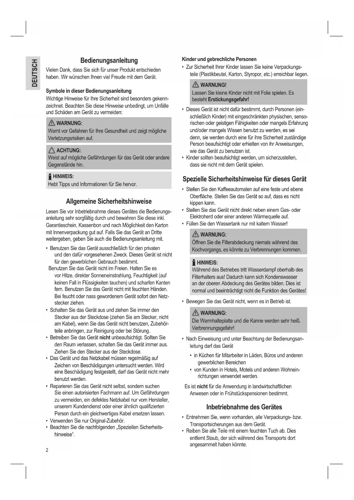 - Bewegen Sie das Gerät nicht, wenn es in Betrieb ist. WARNUNG: Die Warmhalteplatte und die Kanne werden sehr heiß. Verbrennungsgefahr!