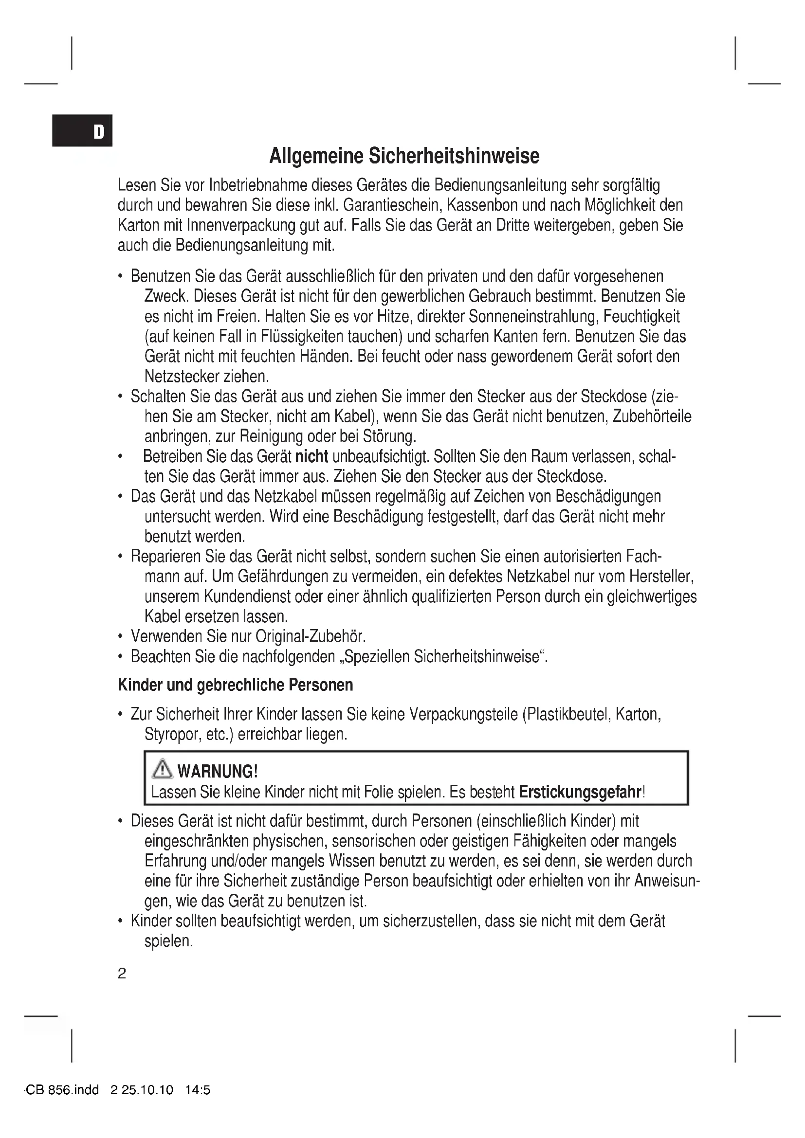 - Kinder sollten beaufsichtigt werden, um sicherzustellen, dass sie nicht mit dem Gerät spielen. 05-CB 856.indd 2 25.10.10 14:52D