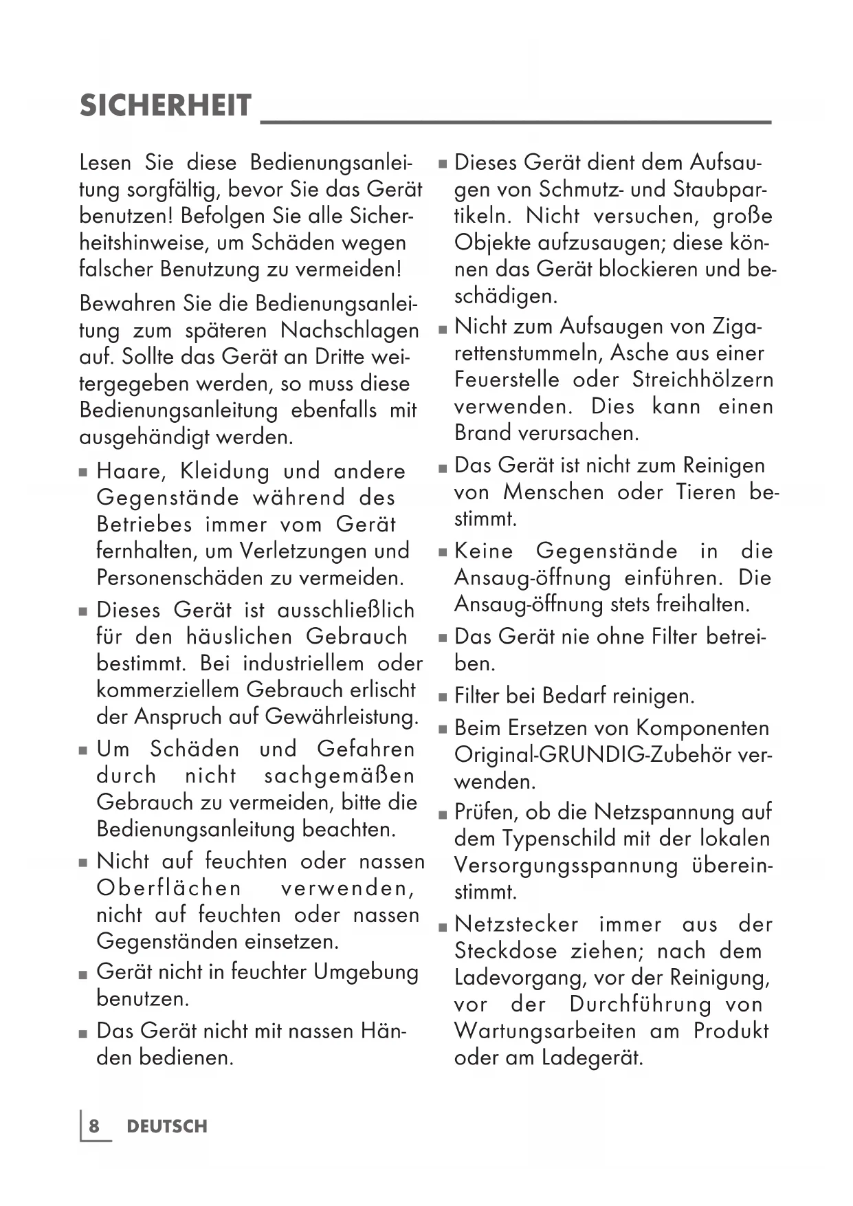 - gebührenpflichtig (0,145 €/Min. aus dem Festnetz, Mobilfunk: max. 0,20 €/Min.) Haben Sie Fragen? Unser Kundenberatungszentrum steht Ihnen werktags stets von 8.00 bis 18.00 Uhr zur Verfügung. INFORMATIONEN __________________________15 DEUTSC H PROBLEMLÖSUNG _________________________ Bitte beachten Sie zur Inbetriebnahme, allgemeinen Verwendung und Reinigung die Hinweise auf den Seiten 5-6-7 der Bedienungsanleitung. Allgemeiner Fehler Mögliche Ursache Abhilfemaßnahmen Der Staubsauger funktioniert nicht Gerät ist abgeschaltet oder Akkustand ist gering Gerät vor der Benutzung aufladen Saugöffnung ist blockiert. Saugöffnung des Gerätes reinigen Saugleistung ist zu gering Auffangbehälter und Filterbaugruppe sind staubig Auffangbehälter und Filtermaterial reinigen Haare und andere Objekte sind um die Turbobürste gewickelt Turbobürste reinigen Situation bleibt unverändert An unseren Kundendienst wenden Ungewöhnliches Motorgeräusch Aluminiumrohr ist verstopft Blockade entfernen Situation bleibt unverändert An unseren Kundendienst wenden Staubsauger funktioniert nicht richtig Zu viele Hindernisse im Reinigungsbereich Hindernisse manuell entfernen Saugöffnung ist blockiert Saugöffnung des Gerätes reinigen Situation bleibt unverändert An unseren Kundendienst wenden Gerät kann nicht aufgeladen werden Ladegerät ist nicht richtig angeschlossen Prüfen und erneut anschließen Ladegerät oder Steckdose fehlerhaft oder locker Prüfen und gegebenenfalls außer Betrieb nehmen Situation bleibt unverändert An unseren Kundendienst wendenSehr geehrte Kundin, sehr geehrter Kunde, als Käufer eines Haushaltskleingerätes der Marke Grundig stehen Ihnen die gesetzlichen Gewährleistungsrechte (Nachbesserung und Nacherfüllung) aus dem Kaufvertrag zu. Die Gewährleistung erfolgt für die Fehlerfreiheit bei Geräteübergabe entsprechend dem jewei- ligen Stand der Technik. Über die Gewährleistung hinaus räumt Ihnen der Hersteller eine Garantie ein, diese schränkt die gesetzliche Gewäh rleistung – die für 24 Monate ab dem Kaufdatum gilt - nicht ein. Garantiert wird die Mängelbeseitigung durch Reparatur oder Aus- tausch nach Wahl des Herstellers. Sollte eine Störung an Ihrem Gerät auftreten, wenden Sie sich bitte an Ihren Fachhändler bzw. den Verkäufer. Dieser wird vor Ort das Gerät prüfen und den Kundenservice durch- führen. Auch soweit Ansprüche aus der Herstellergarantie bestehen, werden diese nur durch den Verkäufer abgewickelt. Die Garantiezeit beträgt 36 Monate ab Kaufdatum. Bedingungen: