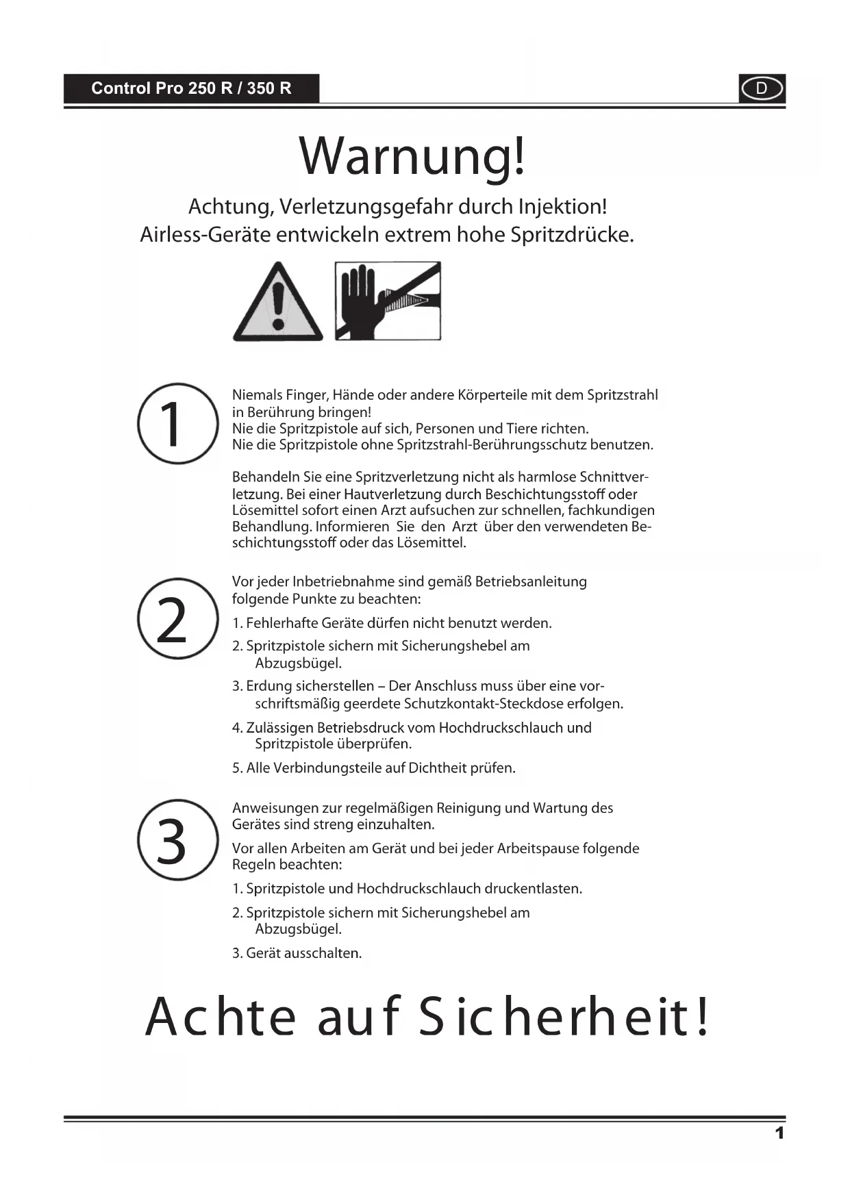 Niemals Finger, Hände oder andere Körperteile mit dem Spritzstrahl in Berührung bringen! Nie die Spritzpistole auf sich, Personen und Tiere richten. Nie die Spritzpistole ohne Spritzstrahl-Berührungsschutz benutzen.