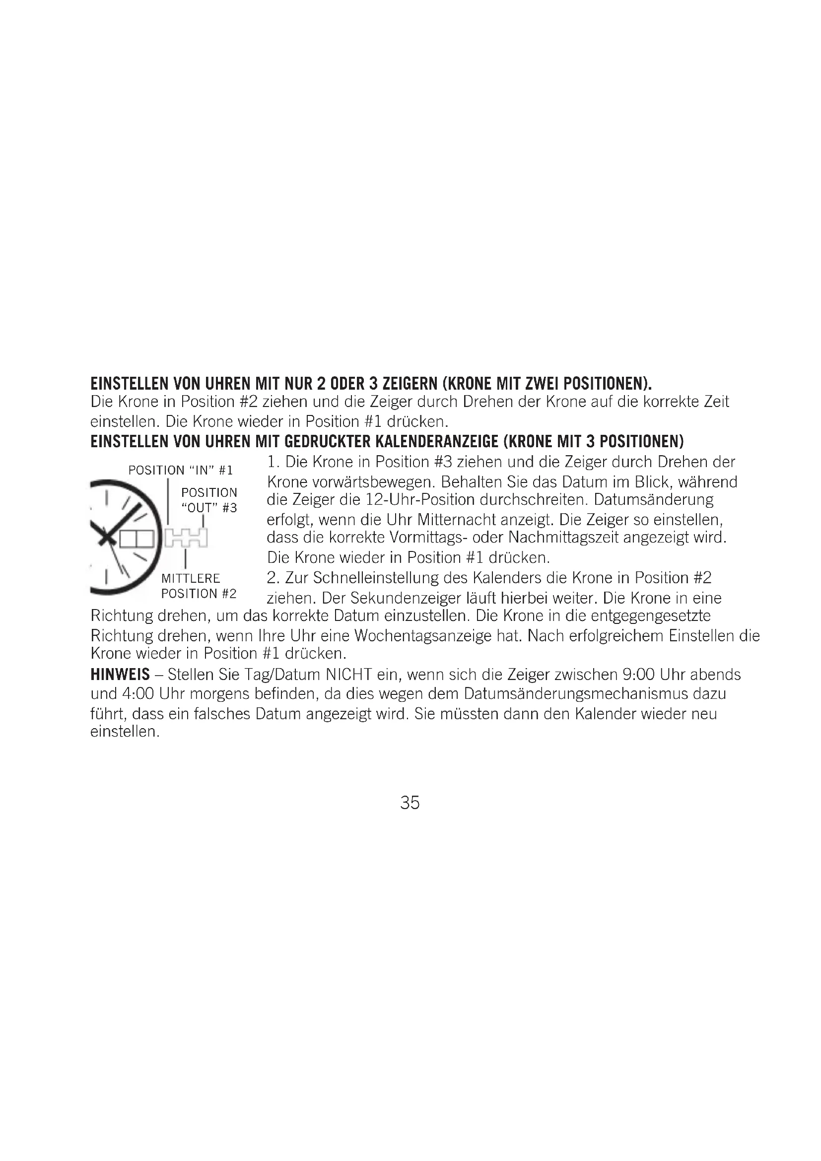 ziehen. Der Sekundenzeiger läuft hierbei weiter. Die Krone in eine Richtung drehen, um das korrekte Datum einzustellen. Die Krone in die entgegengesetzte Richtung drehen, wenn Ihre Uhr eine Wochentagsanzeige hat. Nach erfolgreichem Einstellen die Krone wieder in Position #1 drücken. HINWEIS – Stellen Sie Tag/Datum NICHT ein, wenn sich die Zeiger zwischen 9:00 Uhr abends und 4:00 Uhr morgens befinden, da dies wegen dem Datumsänderungsmechanismus dazu führt, dass ein falsches Datum angezeigt wird. Sie müssten dann den Kalender wieder neu einstellen.