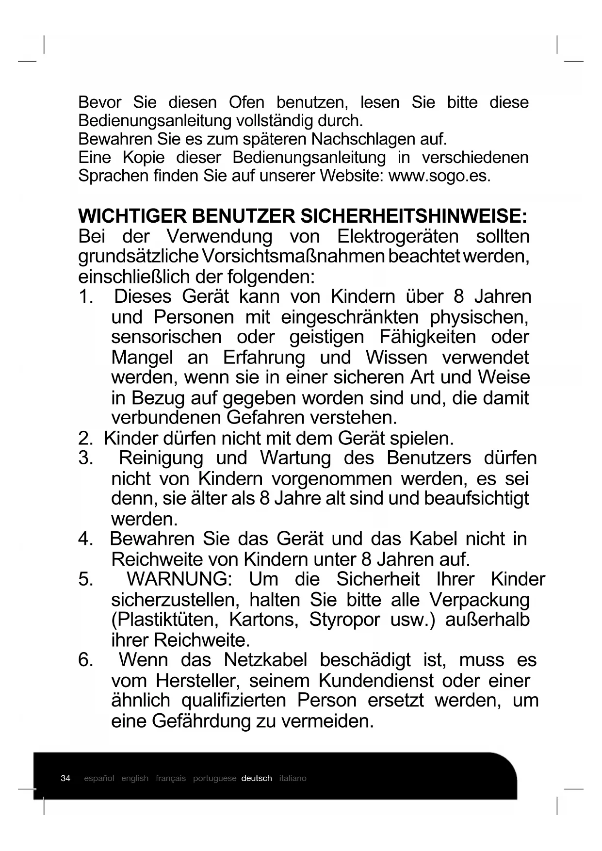 uma mesa ou bancada ou num armário prateleira.34 español english français portuguese deutsch italiano Bevor Sie diesen Ofen benutzen, lesen Sie bitte diese Bedienungsanleitung vollständig durch. Bewahren Sie es zum späteren Nachschlagen auf. Eine Kopie dieser Bedienungsanleitung in verschiedenen Sprachen nden Sie auf unserer Website: www.sogo.es. WICHTIGER BENUTZER SICHERHEITSHINWEISE: Bei der Verwendung von Elektrogeräten sollten grundsätzliche Vorsichtsmaßnahmen beachtet werden, einschließlich der folgenden: