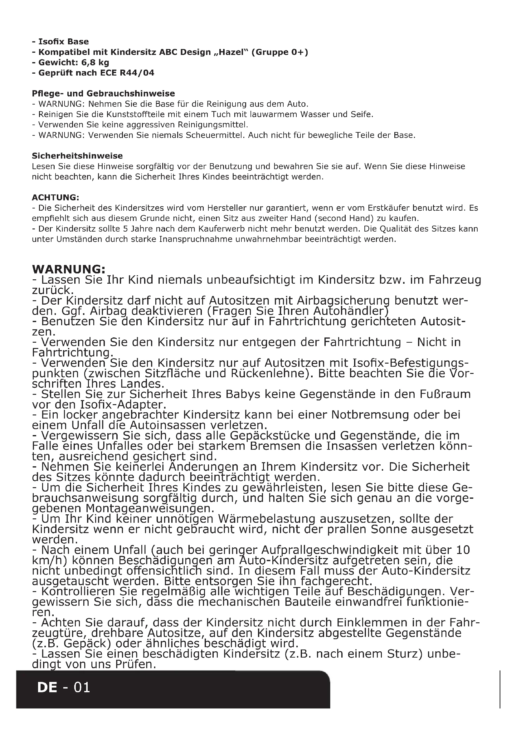 3d 3e 4a 4b 4c6e 6e 6d6d6c 5 6a 6bDE - 01 - Isox Base - Kompatibel mit Kindersitz ABC Design „Hazel“ (Gruppe 0+) - Gewicht: 6,8 kg - Geprüft nach ECE R44/04 Pege- und Gebrauchshinweise - WARNUNG: Nehmen Sie die Base für die Reinigung aus dem Auto. - Reinigen Sie die Kunststoteile mit einem Tuch mit lauwarmem Wasser und Seife. - Verwenden Sie keine aggressiven Reinigungsmittel. - WARNUNG: Verwenden Sie niemals Scheuermittel. Auch nicht für bewegliche Teile der Base. Sicherheitshinweise Lesen Sie diese Hinweise sorgfältig vor der Benutzung und bewahren Sie sie auf. Wenn Sie diese Hinweise nicht beachten, kann die Sicherheit Ihres Kindes beeinträchtigt werden. ACHTUNG: - Die Sicherheit des Kindersitzes wird vom Hersteller nur garantiert, wenn er vom Erstkäufer benutzt wird. Es empehlt sich aus diesem Grunde nicht, einen Sitz aus zweiter Hand (second Hand) zu kaufen. - Der Kindersitz sollte 5 Jahre nach dem Kauferwerb nicht mehr benutzt werden. Die Qualität des Sitzes kann unter Umständen durch starke Inanspruchnahme unwahrnehmbar beeinträchtigt werden. WARNUNG: - Lassen Sie Ihr Kind niemals unbeaufsichtigt im Kindersitz bzw. im Fahrzeug zurück. - Der Kindersitz darf nicht auf Autositzen mit Airbagsicherung benutzt wer- den. Ggf. Airbag deaktivieren (Fragen Sie Ihren Autohändler) - Benutzen Sie den Kindersitz nur auf in Fahrtrichtung gerichteten Autosit- zen. - Verwenden Sie den Kindersitz nur entgegen der Fahrtrichtung – Nicht in Fahrtrichtung. - Verwenden Sie den Kindersitz nur auf Autositzen mit Isox-Befestigungs- punkten (zwischen Sitzäche und Rückenlehne). Bitte beachten Sie die Vor- schriften Ihres Landes. - Stellen Sie zur Sicherheit Ihres Babys keine Gegenstände in den Fußraum vor den Isox-Adapter. - Ein locker angebrachter Kindersitz kann bei einer Notbremsung oder bei einem Unfall die Autoinsassen verletzen. - Vergewissern Sie sich, dass alle Gepäckstücke und Gegenstände, die im Falle eines Unfalles oder bei starkem Bremsen die Insassen verletzen könn- ten, ausreichend gesichert sind. - Nehmen Sie keinerlei Änderungen an Ihrem Kindersitz vor. Die Sicherheit des Sitzes könnte dadurch beeinträchtigt werden. - Um die Sicherheit Ihres Kindes zu gewährleisten, lesen Sie bitte diese Ge- brauchsanweisung sorgfältig durch, und halten Sie sich genau an die vorge- gebenen Montageanweisungen. - Um Ihr Kind keiner unnötigen Wärmebelastung auszusetzen, sollte der Kindersitz wenn er nicht gebraucht wird, nicht der prallen Sonne ausgesetzt werden. - Nach einem Unfall (auch bei geringer Aufprallgeschwindigkeit mit über 10 km/h) können Beschädigungen am Auto-Kindersitz aufgetreten sein, die nicht unbedingt oensichtlich sind. In diesem Fall muss der Auto-Kindersitz ausgetauscht werden. Bitte entsorgen Sie ihn fachgerecht. - Kontrollieren Sie regelmäßig alle wichtigen Teile auf Beschädigungen. Ver- gewissern Sie sich, dass die mechanischen Bauteile einwandfrei funktionie- ren. - Achten Sie darauf, dass der Kindersitz nicht durch Einklemmen in der Fahr- zeugtüre, drehbare Autositze, auf den Kindersitz abgestellte Gegenstände (z.B. Gepäck) oder ähnliches beschädigt wird. - Lassen Sie einen beschädigten Kindersitz (z.B. nach einem Sturz) unbe- dingt von uns Prüfen.DE - 02