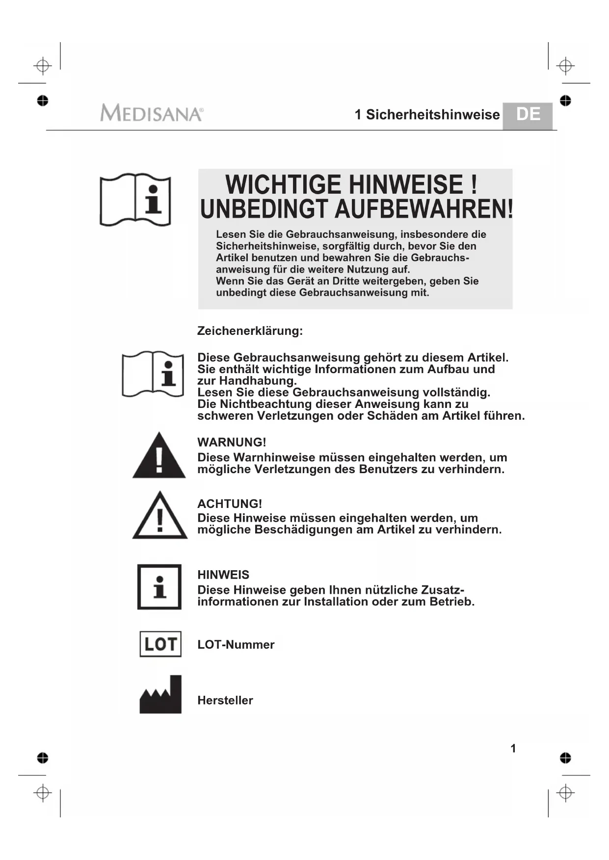 durch das Gerät verursacht werden, ist auch dann ausgeschlossen, wenn der Schaden an dem Gerät als ein Garantiefall anerkannt wird. Garantie- und Reparatur- bedingungen MEDISANA AG Jagenbergstraße 19 41468 NEUSS Deutschland eMail: info@medisana.de Internet: www.medisana.de Die Service-Adresse finden Sie auf dem separaten Beilegeblatt.GB 1 Safety Information