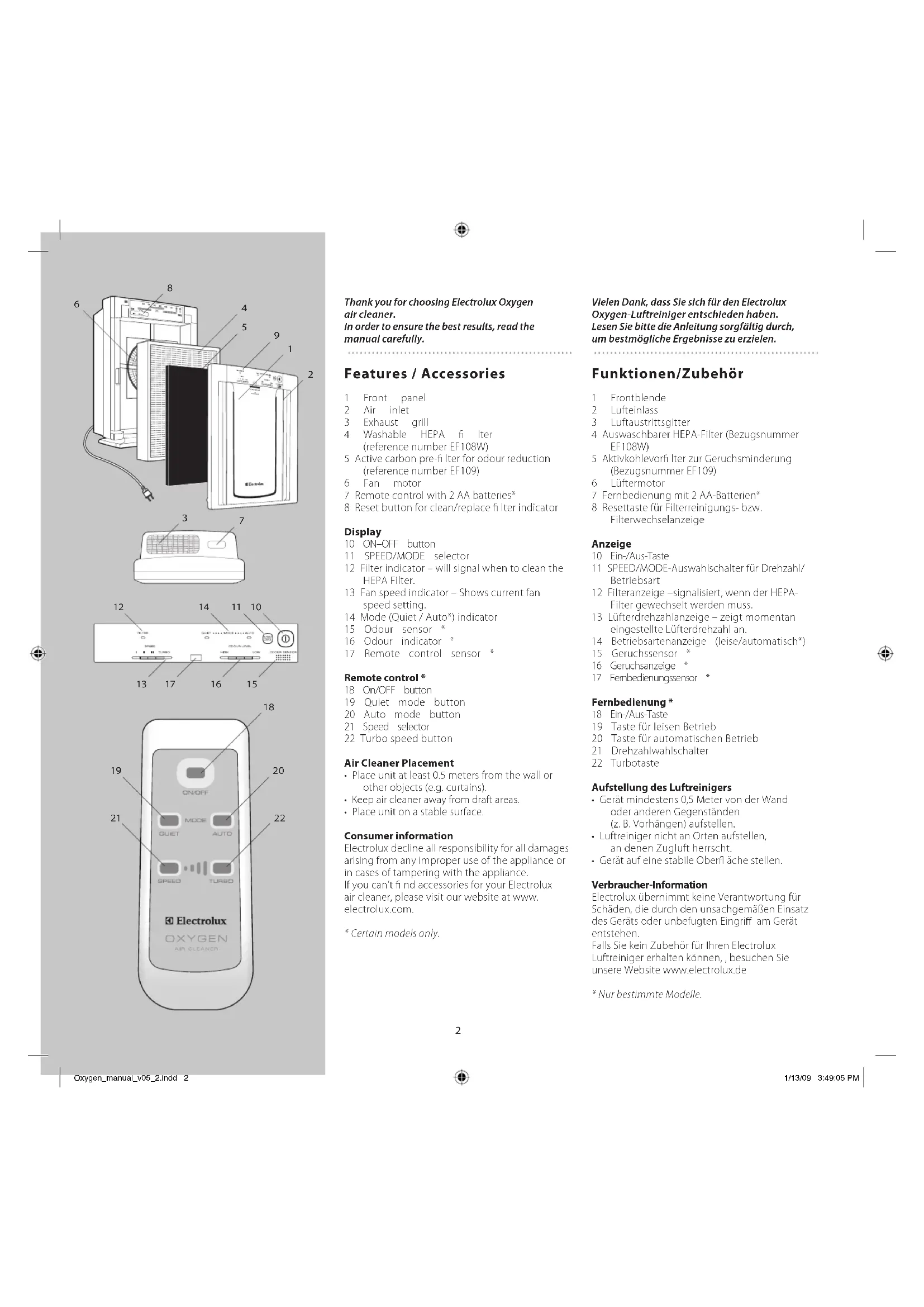 - Certain models only. Vielen Dank, dass Sie sich für den Electrolux Oxygen-Luftreiniger entschieden haben. Lesen Sie bitte die Anleitung sorgfältig durch, um bestmögliche Ergebnisse zu erzielen. Funktionen/Zubehör 1 Frontblende 2 Lufteinlass 3 Luftaustrittsgitter 4 Auswaschbarer HEPA-Filter (Bezugsnummer EF108W) 5 Aktivkohlevor lter zur Geruchsminderung (Bezugsnummer EF109) 6 Lüftermotor 7 Fernbedienung mit 2 AA-Batterien* 8 Resettaste für Filterreinigungs- bzw. Filterwechselanzeige Anzeige 10 Ein-/Aus-Taste 11 SPEED/MODE-Auswahlschalter für Drehzahl/ Betriebsart 12 Filteranzeige –signalisiert, wenn der HEPA- Filter gewechselt werden muss. 13 Lüfterdrehzahlanzeige – zeigt momentan eingestellte Lüfterdrehzahl an. 14 Betriebsartenanzeige (leise/automatisch*) 15 Geruchssensor * 16 Geruchsanzeige * 17 Fernbedienungssensor * Fernbedienung * 18 Ein-/Aus-Taste 19 Taste für leisen Betrieb 20 Taste für automatischen Betrieb 21 Drehzahlwahlschalter 22 Turbotaste Aufstellung des Luftreinigers