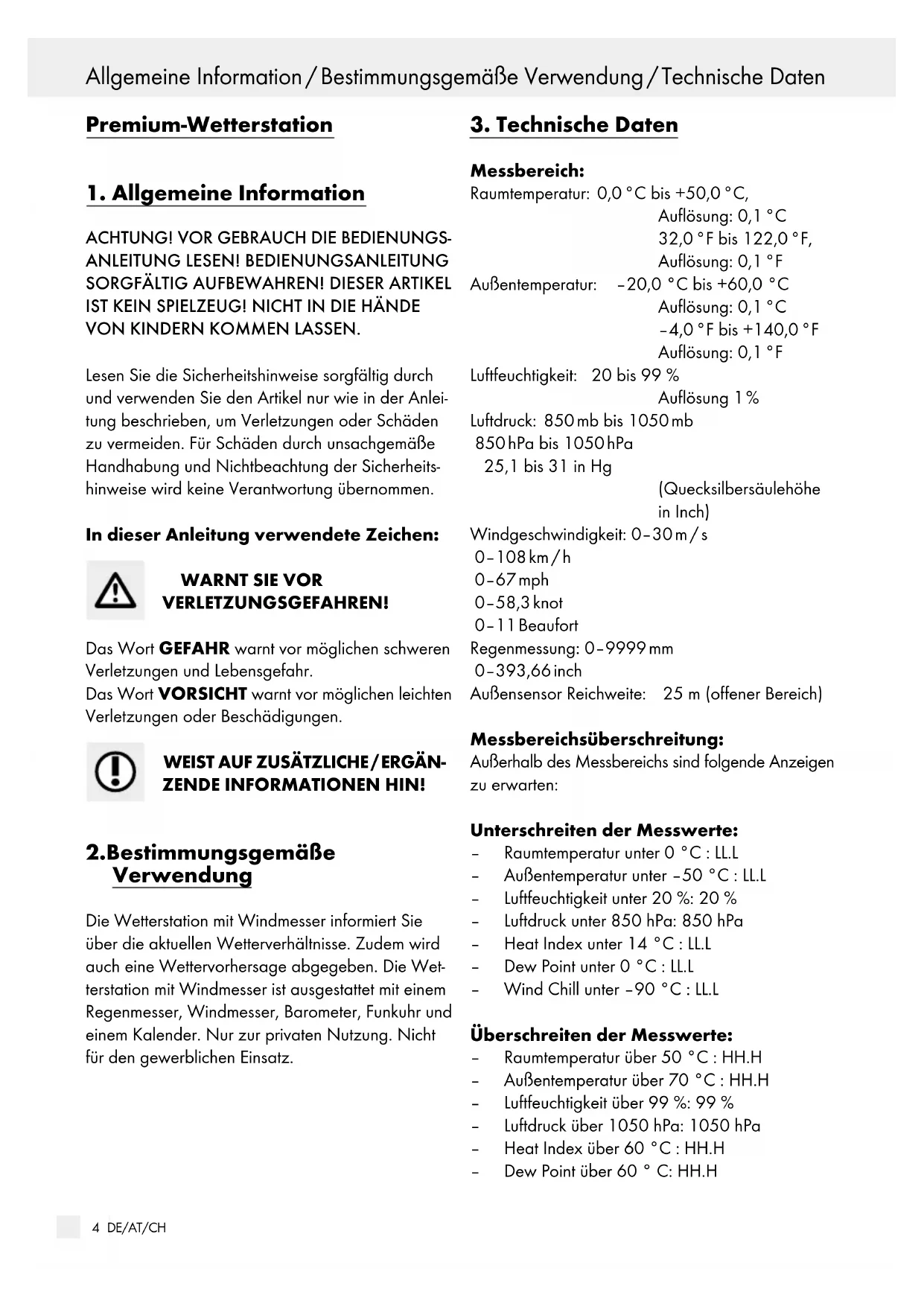 GEFAHR FÜR KINDER! J Das Verschlucken von Batterien ist lebensgefähr- lich. Batterien und Wetterstation müssen außer Reichweite von Kleinkindern aufbewahrt werden. Bei Verschlucken der Batterie ist umgehend ein Arzt aufzusuchen. GEFAHR VOR VERLETZUNGEN! J Leere Batterie bitte aus dem Gerät entfernen. J Anschlusspole auf keinen Fall kurzschließen. J Dieses Gerät kann von Kindern ab 8Jahren und darüber sowie von Personen mit verringerten physischen, sensorischen oder mentalen Fähig- keiten oder Mangel an Erfahrung und Wissen benutzt werden, wenn sie beaufsichtigt oder bezüglich des sicheren Gebrauchs des Gerätes unterwiesen wurden und die daraus resultie- renden Gefahren verstehen. Kinder dürfen nicht mit dem Gerät spielen. Reinigung und Benutzer- wartung dürfen nicht von Kindern ohne Beauf- sichtigung durchgeführt werden. VORSICHT – SACHSCHÄDEN! J Ausschließlich den angegebenen Batterietyp verwenden. J Auf die richtige Polarität achten. J Die Batterien regelmäßig auf Auslaufen über- prüfen. J Bei längerer Nichtbenutzung Batterien aus dem Gerät nehmen. J Tauchen Sie die Wetterstation und den Außen- sensor nie in Wasser oder andere Flüssigkeiten. J Beachten Sie die Hinweise zur Reinigung und Aufbewahrung dieser Anleitung.6 DE/AT/CH Lieferumfang / Begriffserklärungen