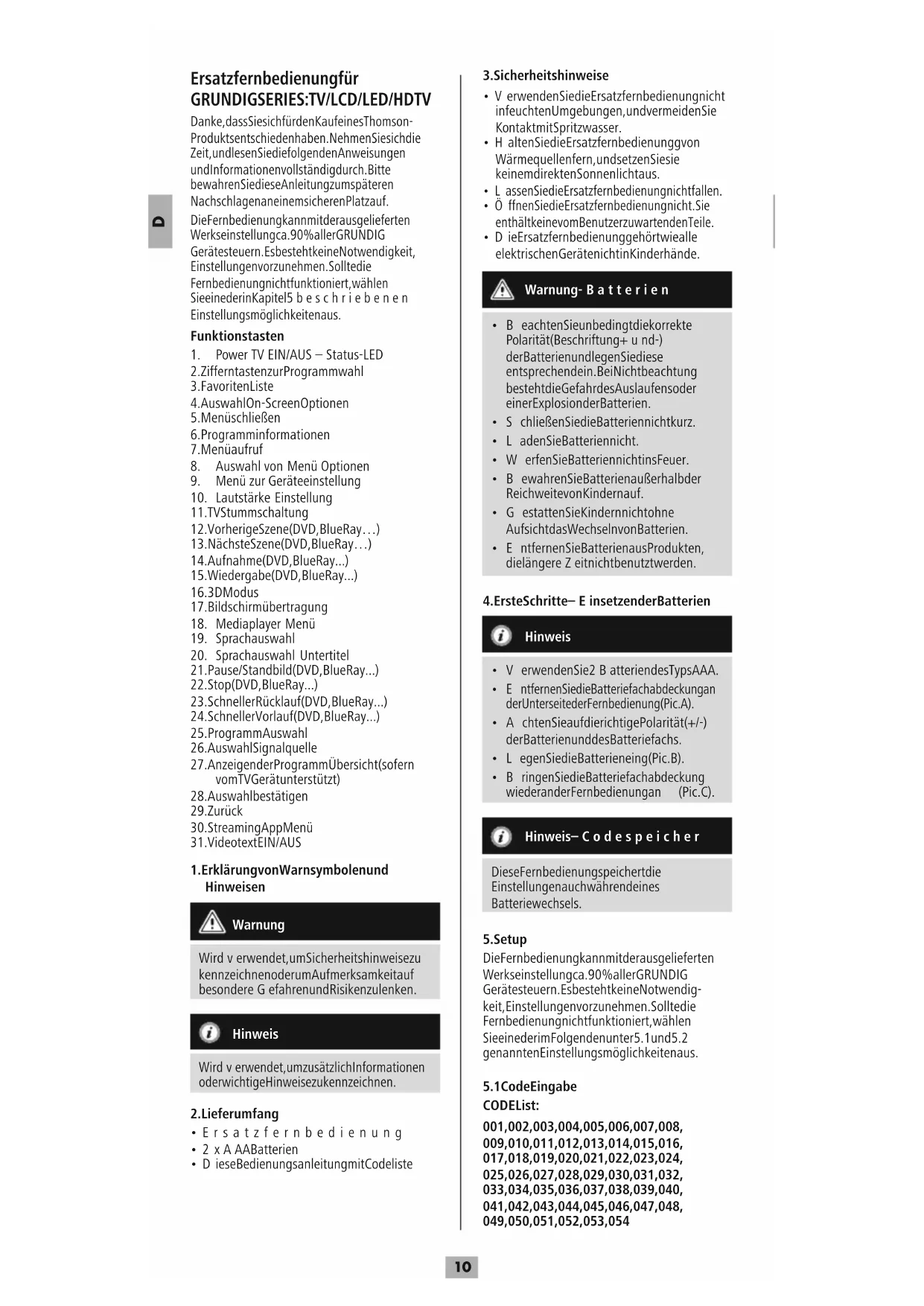 - Diese Bedienungsanleitung mit Codeliste